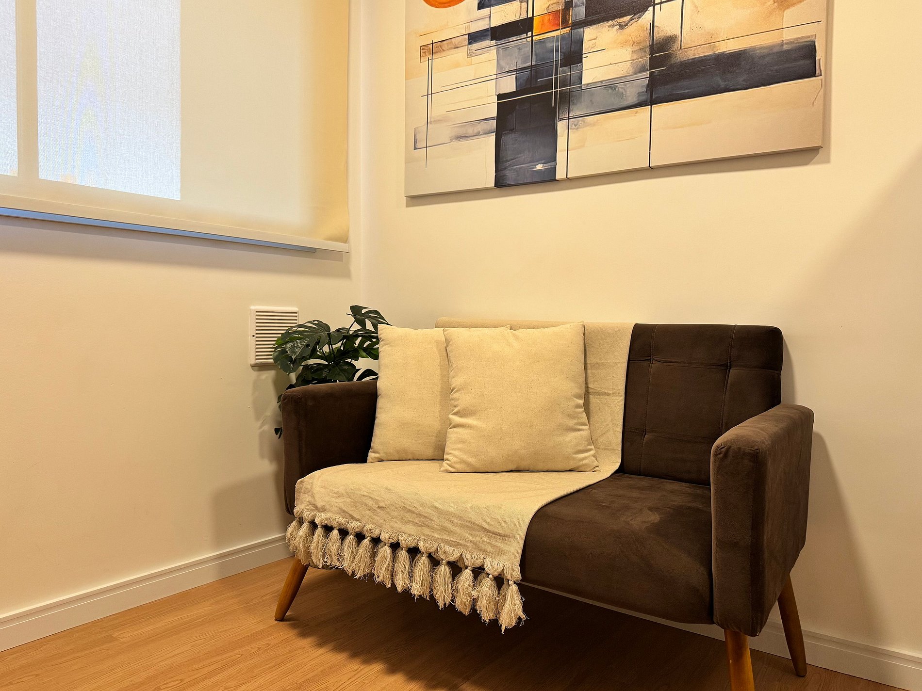 Das Wohnzimmer ist integriert und mit Smart-TV, Sofa und einer Workstation mit großem Schreibtisch, schnellem und stabilem Glasfaser-WLAN sowie zwei bequemen Stühlen ausgestattet – ideal für Homeoffice.