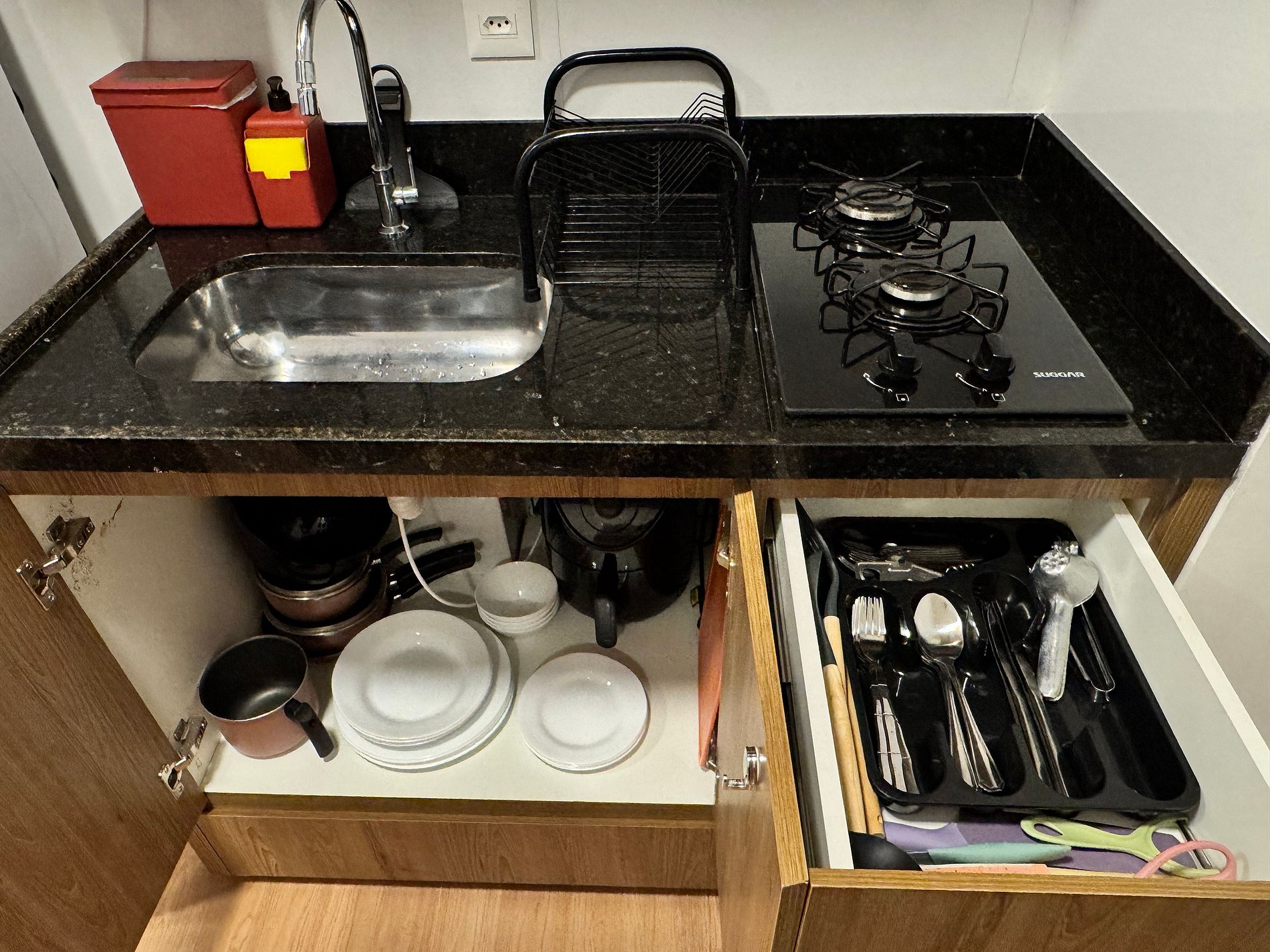 Die kompakte Küche ist funktional und gut ausgestattet mit Kochfeld, Kühlschrank, Mikrowelle, Kaffeemaschine und allen wichtigen Utensilien und bietet die Möglichkeit, alles von einem schnellen Kaffee bis hin zu vollständigen Mahlzeiten zuzubereiten.