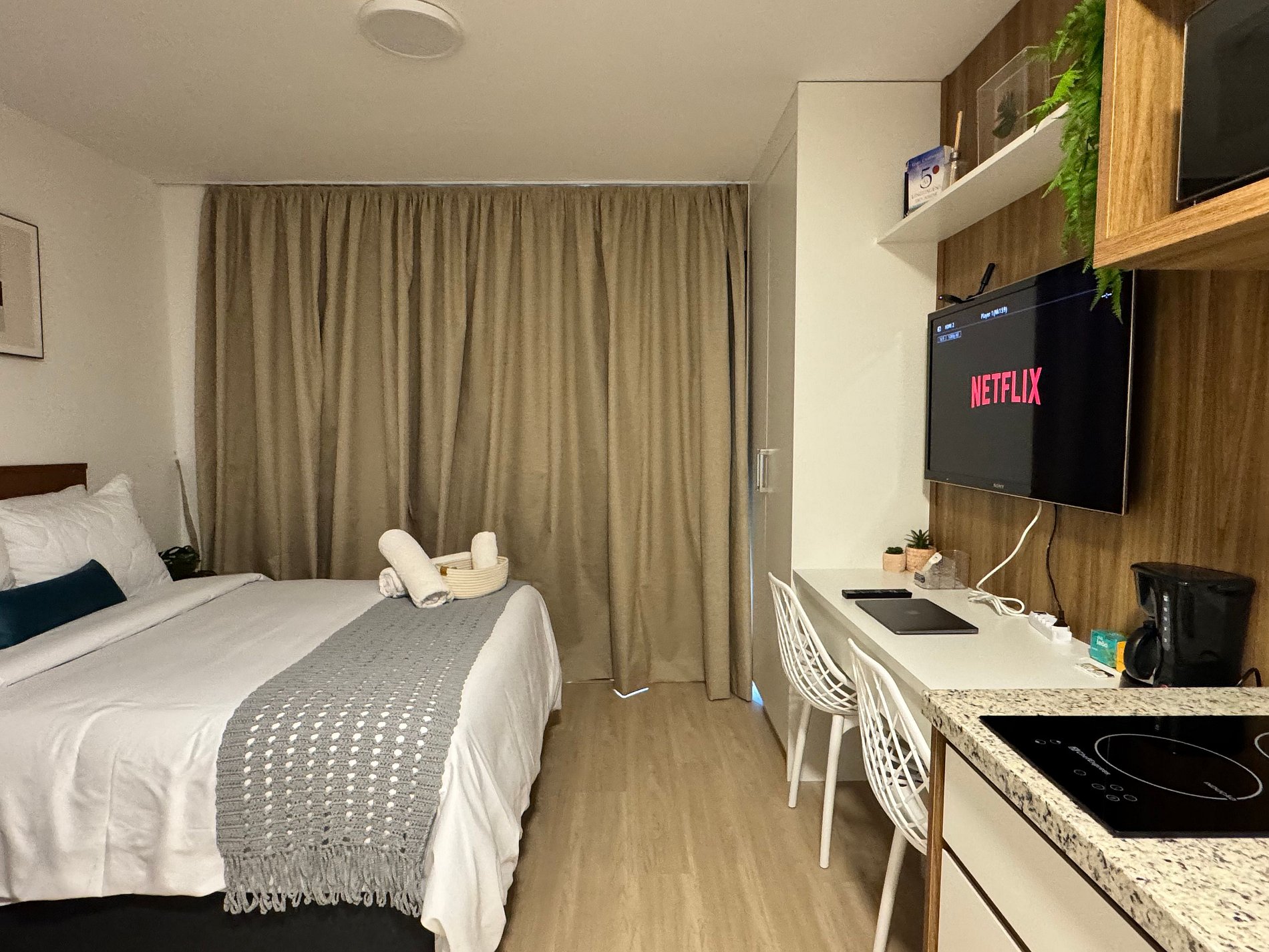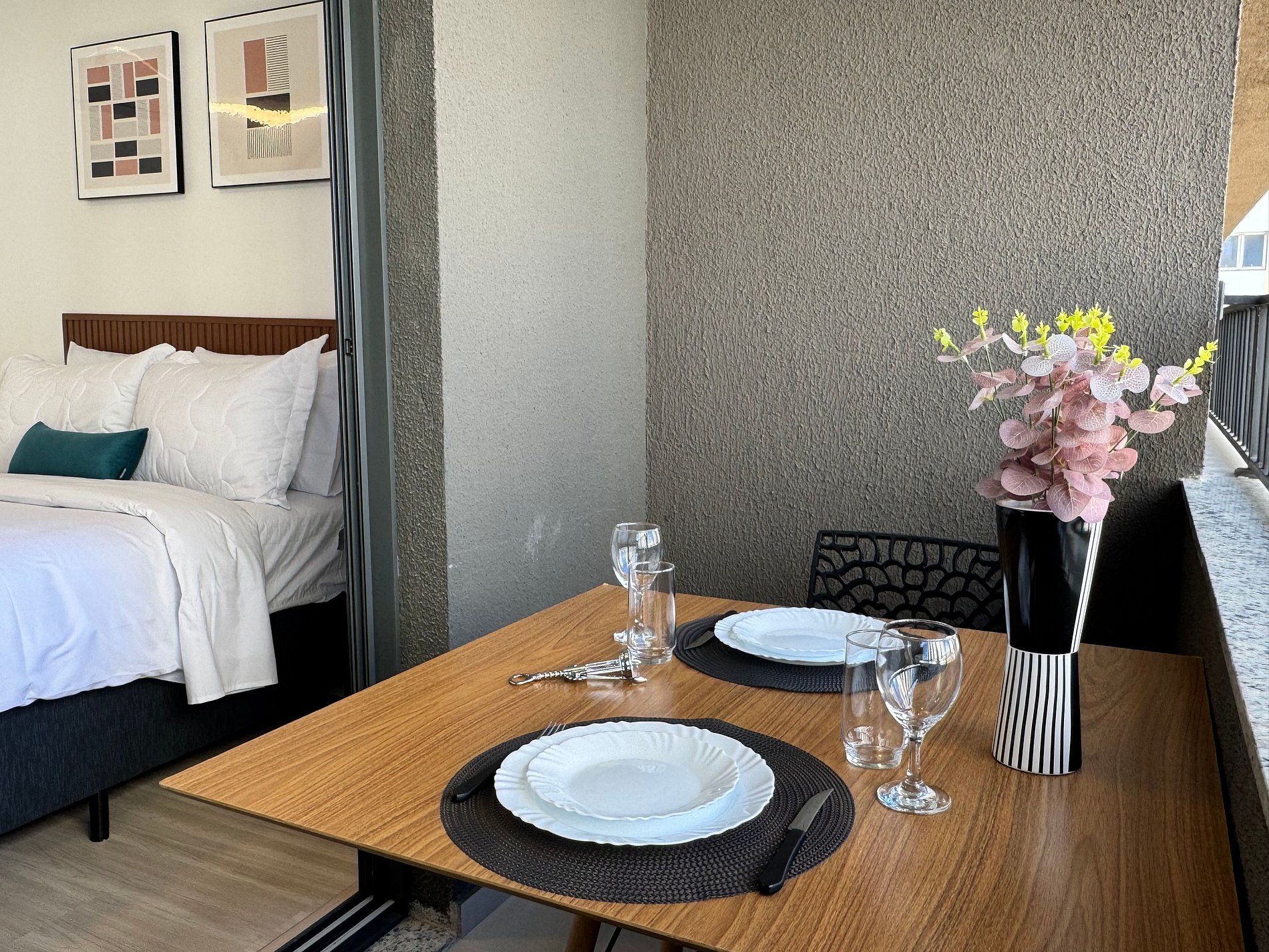 Ein gemütlicher Raum mit großem Balkon, kompakter ausgestatteter Küche, 50”-Smart-TV, schnellem Glasfaser-WLAN und Homeoffice-Schreibtisch für zwei. Boxspringbett und hochwertige Bettwäsche garantieren vollen Komfort. Im Erdgeschoss: Fitnessstudio, Gemeinschaftswäscherei, Gourmet-Loungebar und Aufenthaltsbereich. Nur 550 m von der U-Bahn-Station Hospital São Paulo (Linie 5–Lila) und wenige Minuten von der Av. Paulista. Mobilität, Stil und Wohlbefinden für Geschäft, Gesundheit und Freizeit.