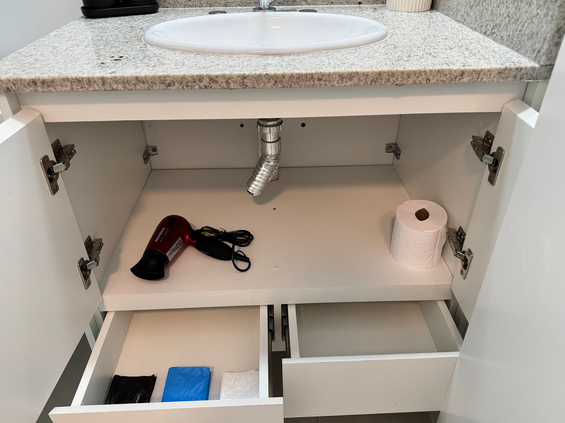 - Im Badezimmer gibt es Müllbeutel für organische Abfälle. In der Küche gibt es ein Doppel-Mülleimersystem, das organische Abfälle (schwarzer Beutel) von recycelbarem Material (grüner Beutel) trennt.