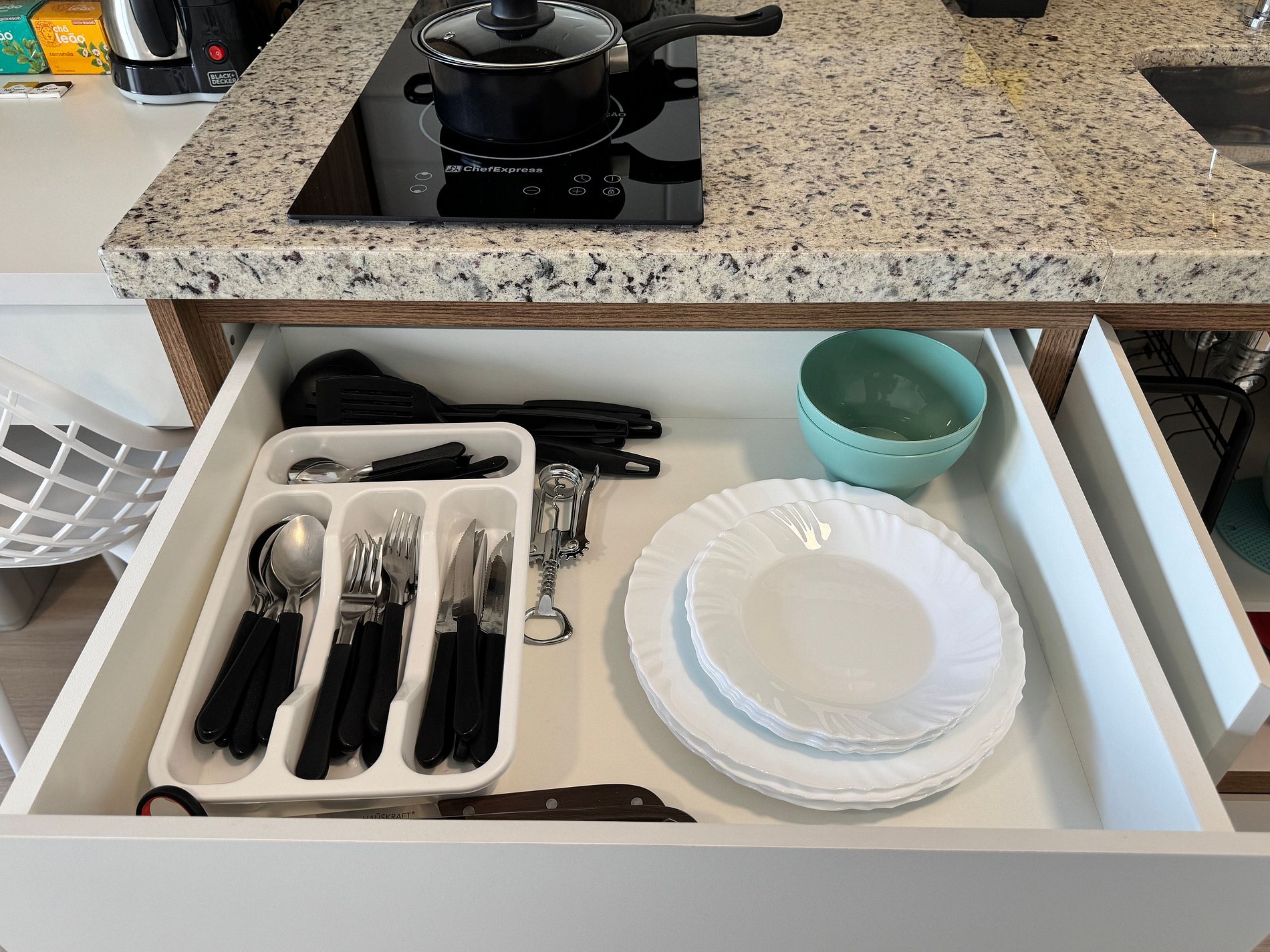 - Ein zusätzlicher grüner Plastikbeutel steht in der Küchenschublade für die Entsorgung von recycelbaren Materialien wie Papier, Plastik, Metall und Glas zur Verfügung.
