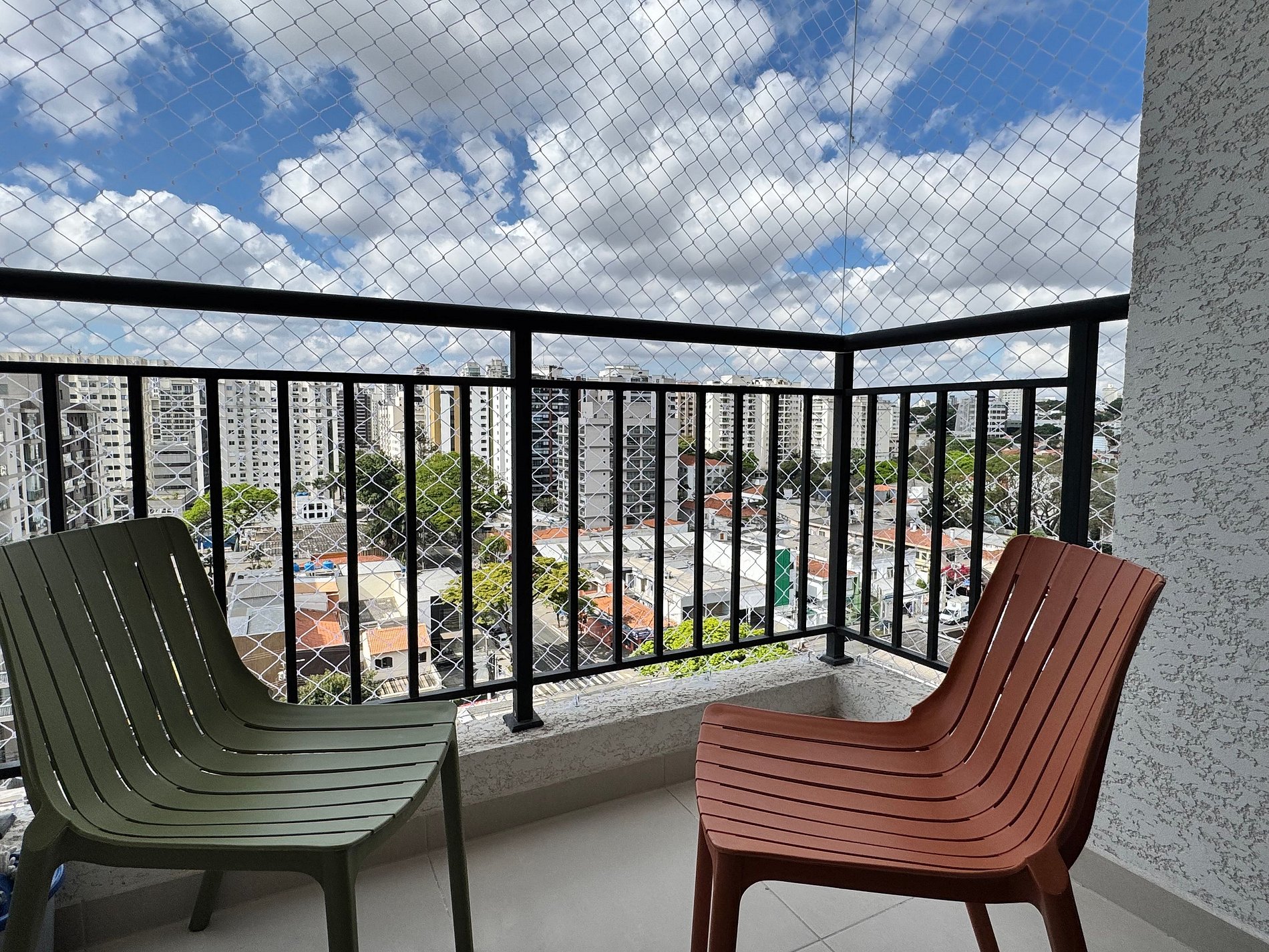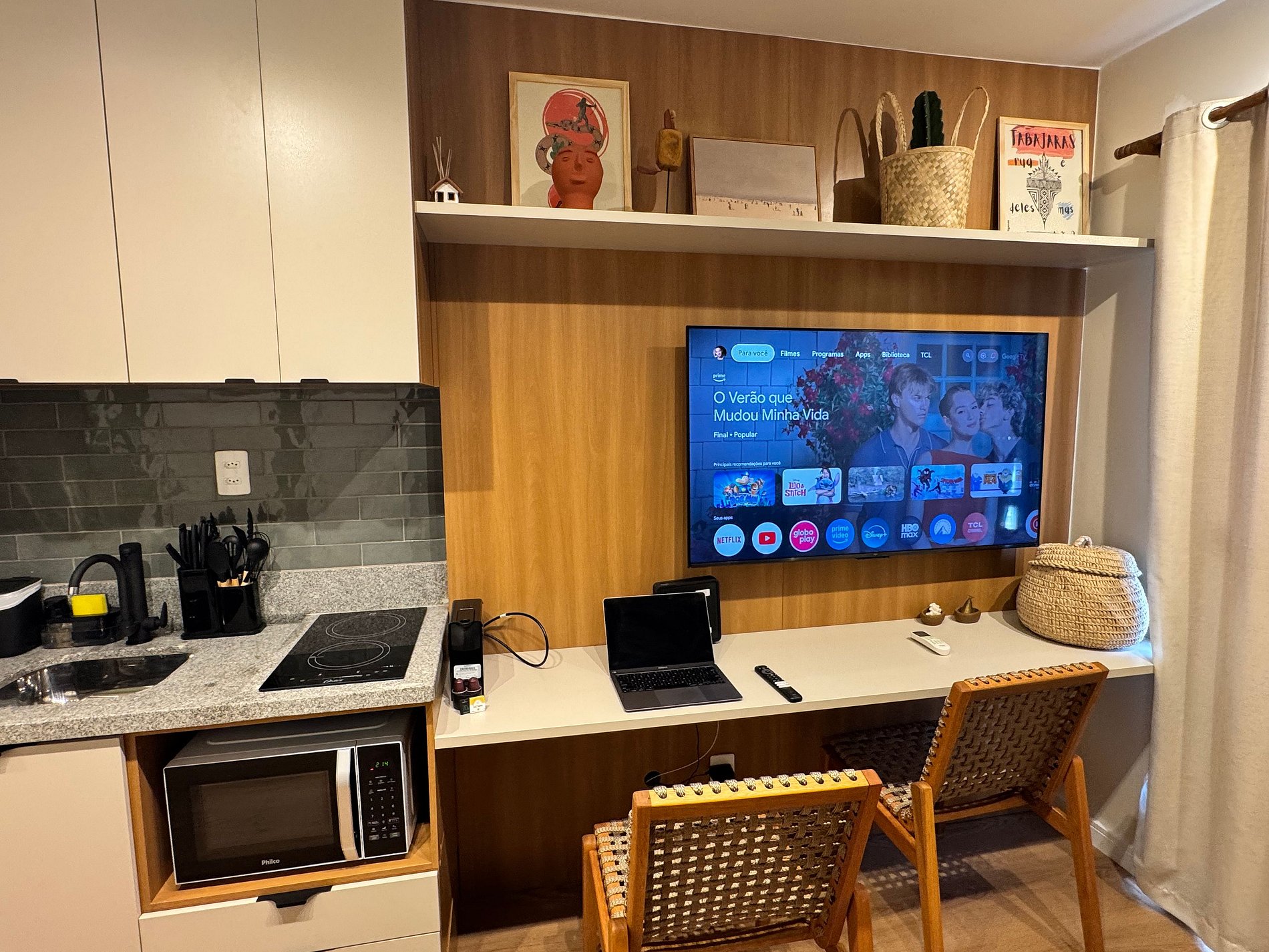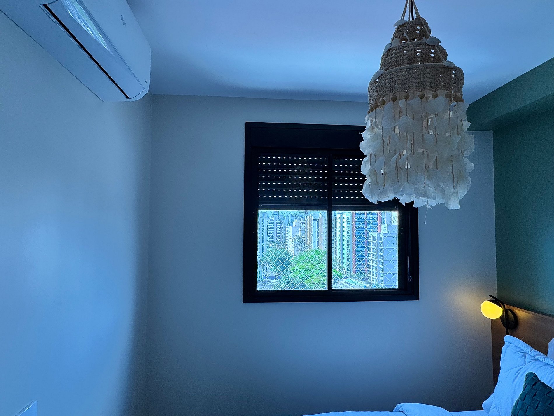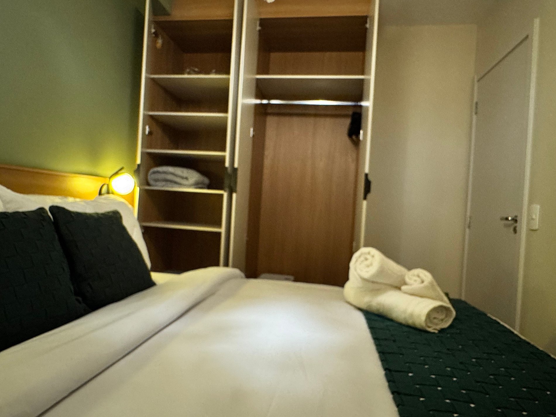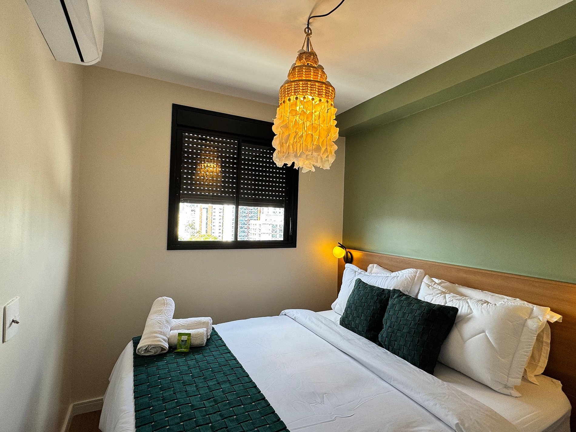 Modernes Apartment mit separatem Schlafzimmer, Wohnzimmer mit Sofa und Smart-TV, Balkon mit Aussicht, voll ausgestattete Küche (Kochfeld, Mikrowelle, Kühlschrank, Nespresso und Heißluftfritteuse) sowie Arbeitsplatz für zwei Personen. Schlafzimmer mit Klimaanlage und gemütlicher Bettwäsche; Bad mit Dusche und Glaskabine. Ideal für Freizeit oder Homeoffice in Moema, mit Zugang zu Pool und Fitnessstudio der Anlage, nur wenige Minuten von der U-Bahn-Station Eucaliptos entfernt.