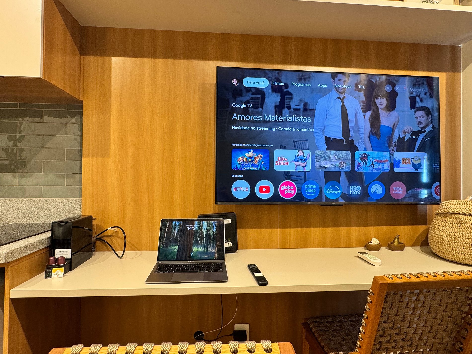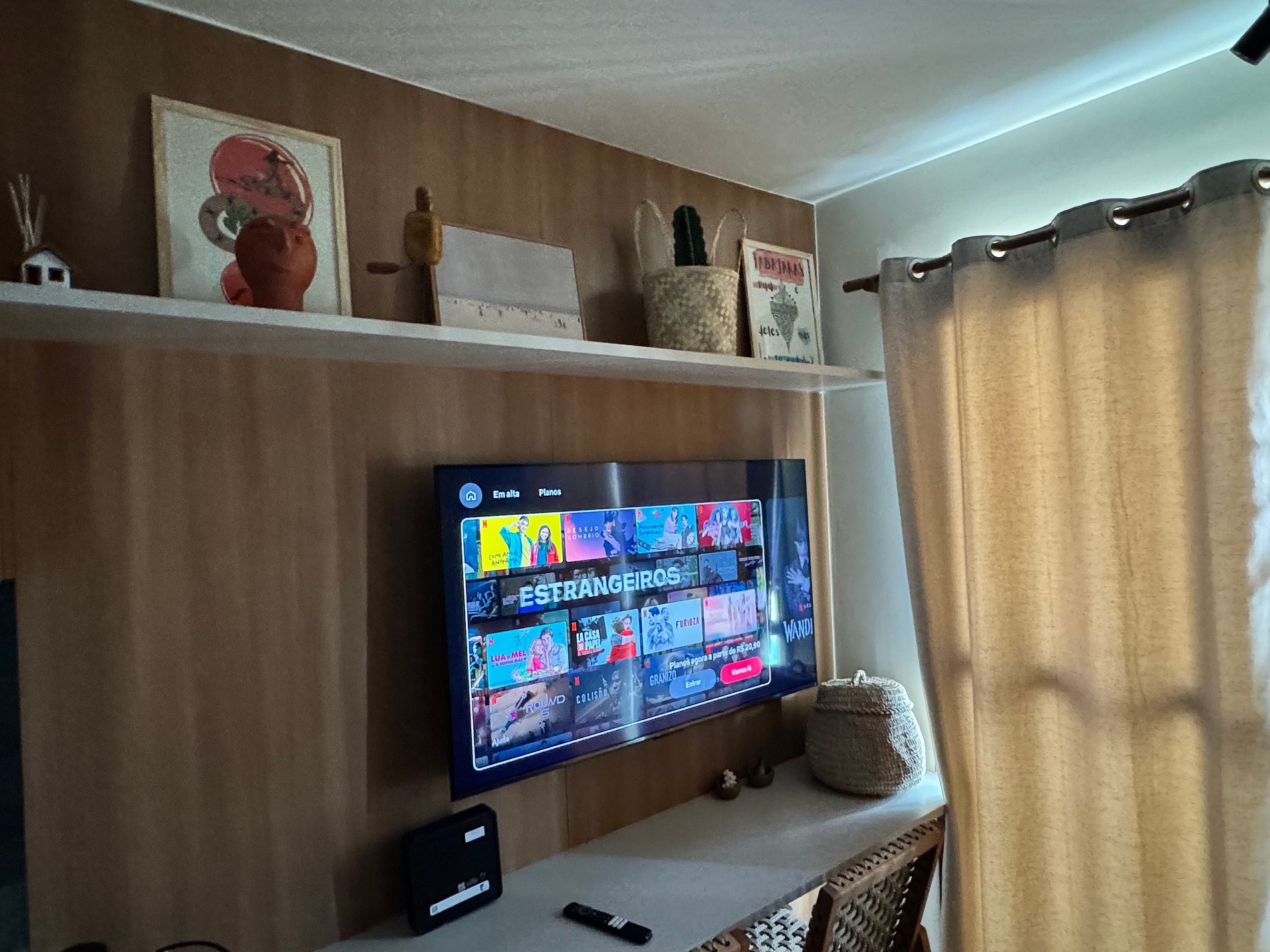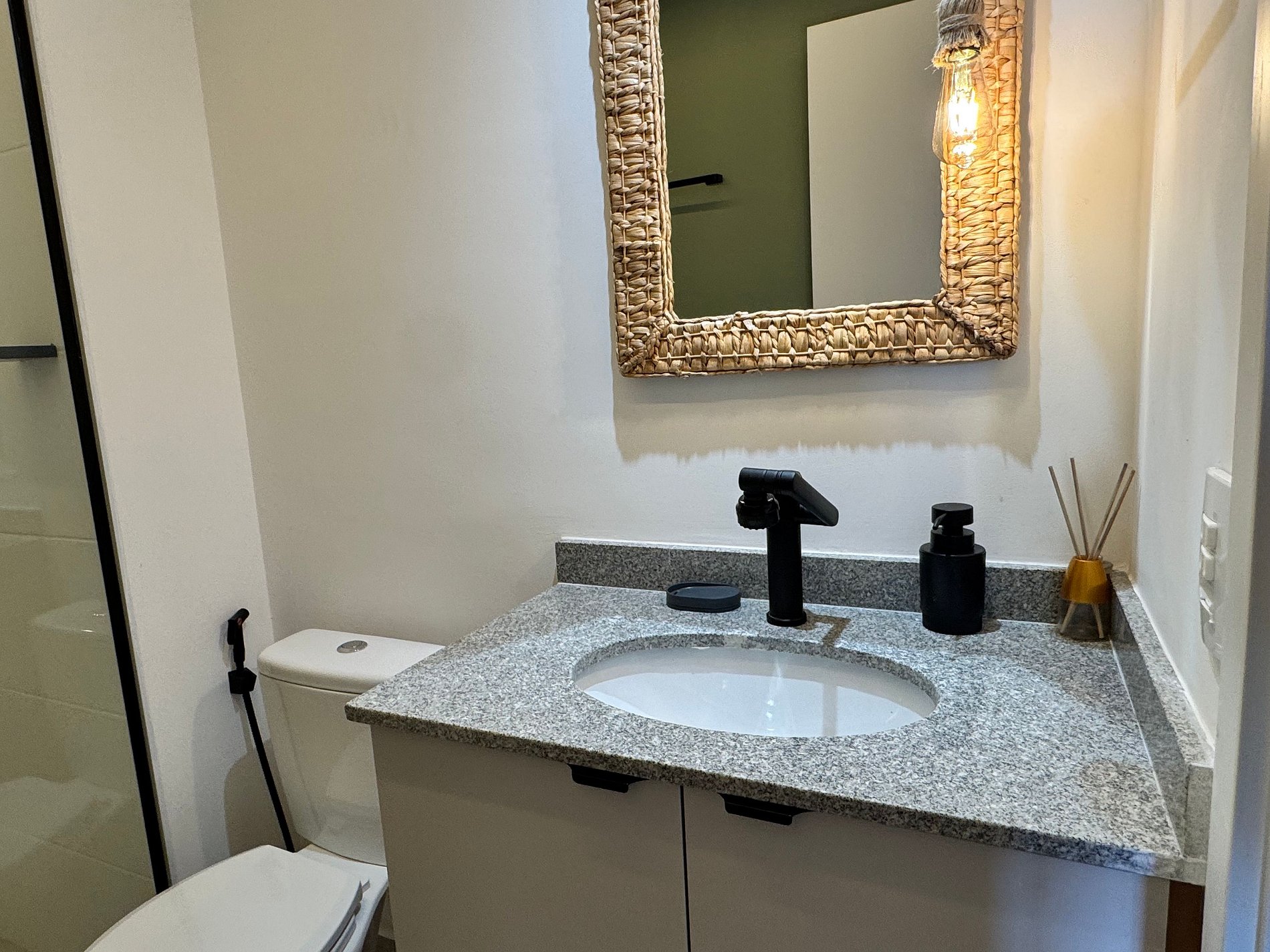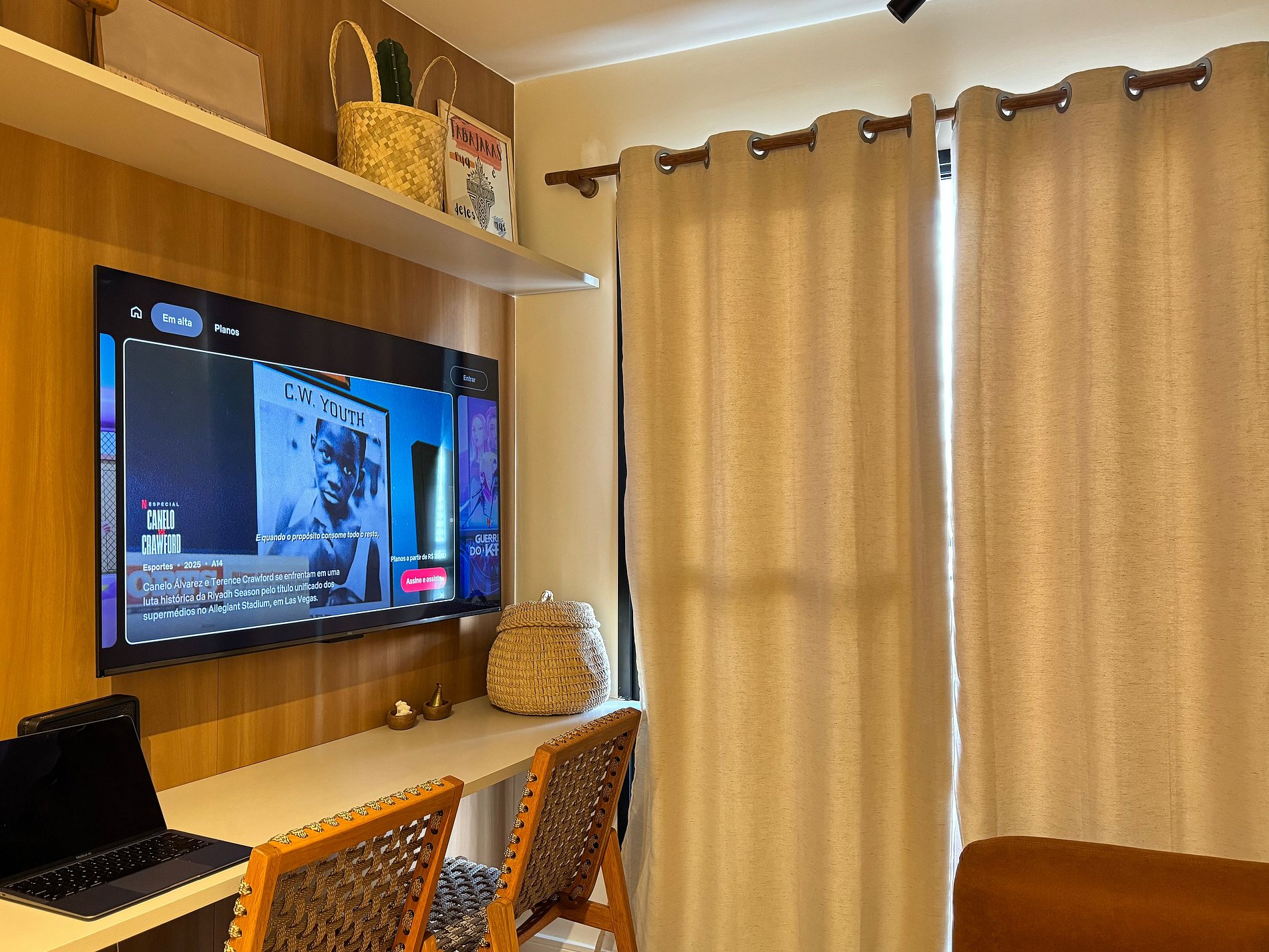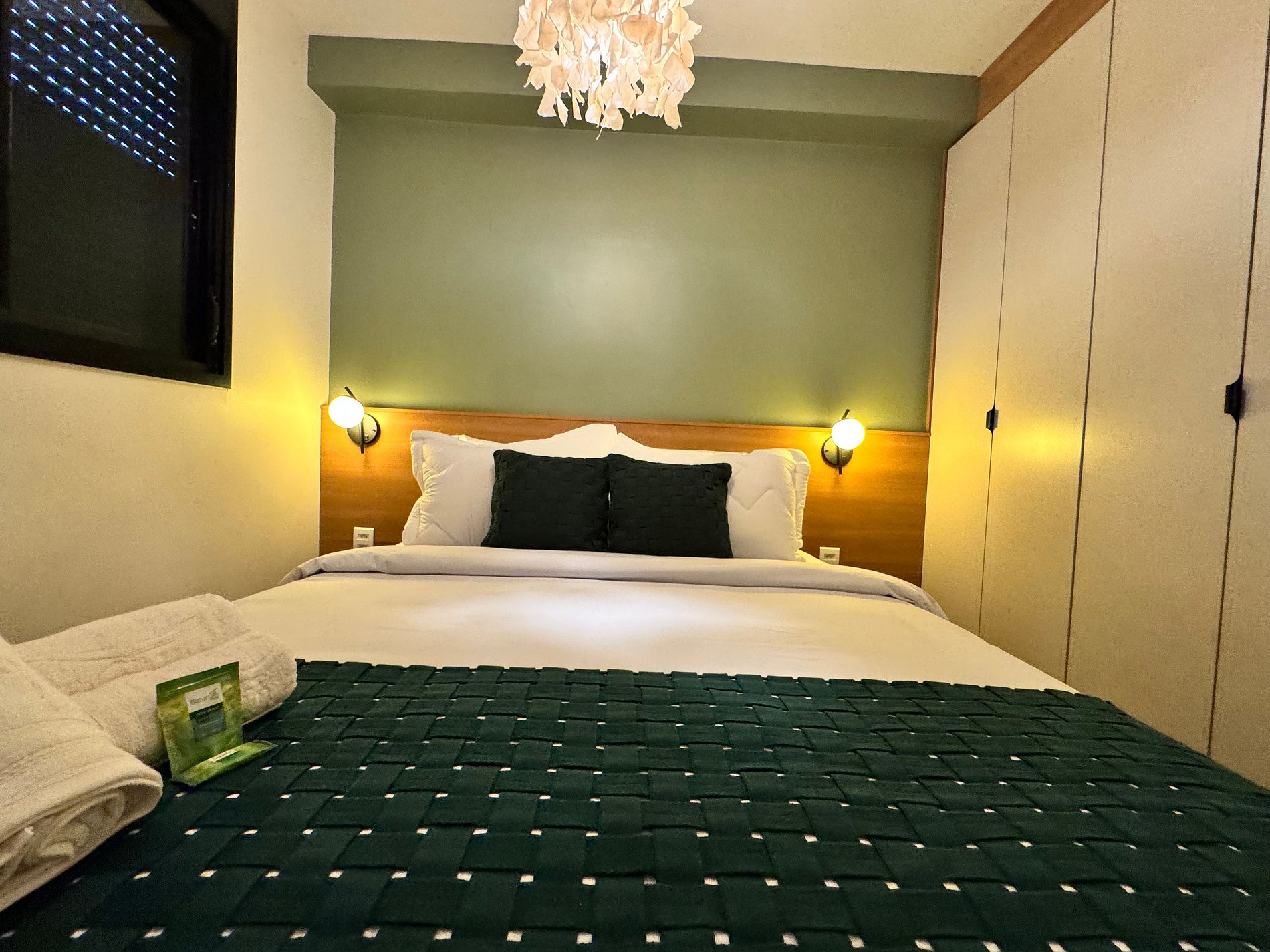 Modernes Apartment mit separatem Schlafzimmer, Wohnzimmer mit Sofa und Smart-TV, Balkon mit Aussicht, voll ausgestattete Küche (Kochfeld, Mikrowelle, Kühlschrank, Nespresso und Heißluftfritteuse) sowie Arbeitsplatz für zwei Personen. Schlafzimmer mit Klimaanlage und gemütlicher Bettwäsche; Bad mit Dusche und Glaskabine. Ideal für Freizeit oder Homeoffice in Moema, mit Zugang zu Pool und Fitnessstudio der Anlage, nur wenige Minuten von der U-Bahn-Station Eucaliptos entfernt.
