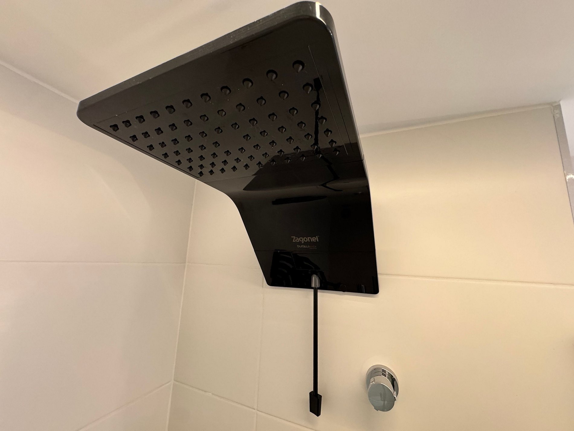 Der möblierte Balkon, mit Stühlen und Schutznetz, lädt dazu ein, den Stadtblick zu genießen — ob bei einem Morgenkaffee oder beim Entspannen am Abend. Das moderne Badezimmer, mit Glasdusche und hervorragendem Wasserdruck, rundet das Erlebnis mit Funktionalität und Stil ab.
