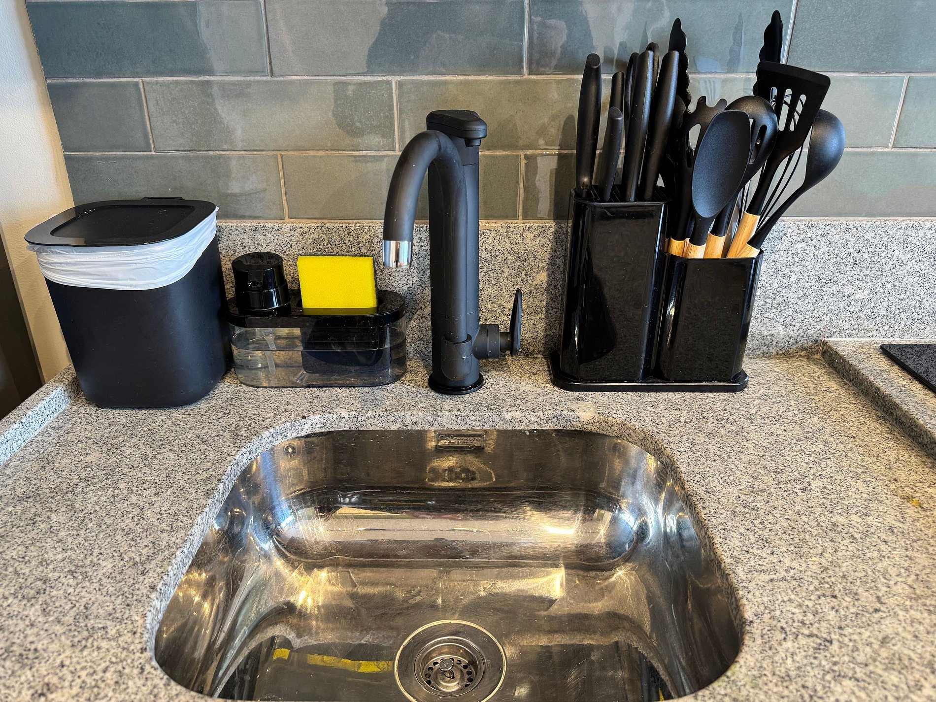 Im Badezimmer stehen Müllsäcke für organische Abfälle zur Verfügung. Der Mülleimer neben dem Schreibtisch im Homeoffice-Bereich ist mit einem schwarzen Plastikbeutel ausgekleidet, in dem auch organische Küchenabfälle entsorgt werden können.