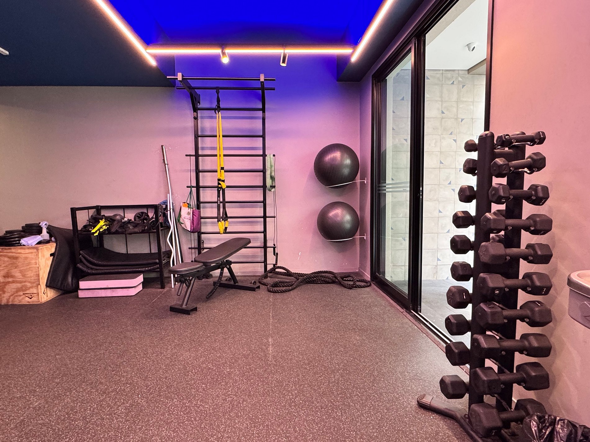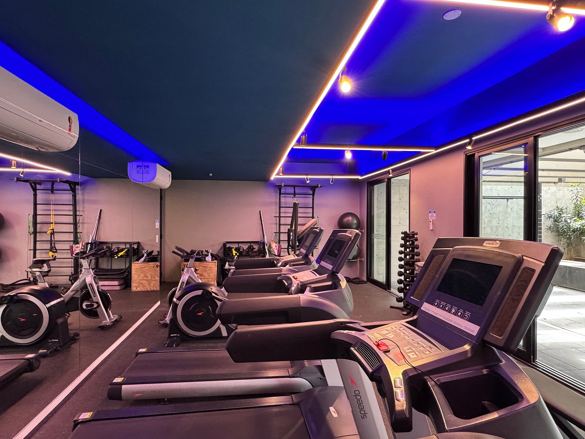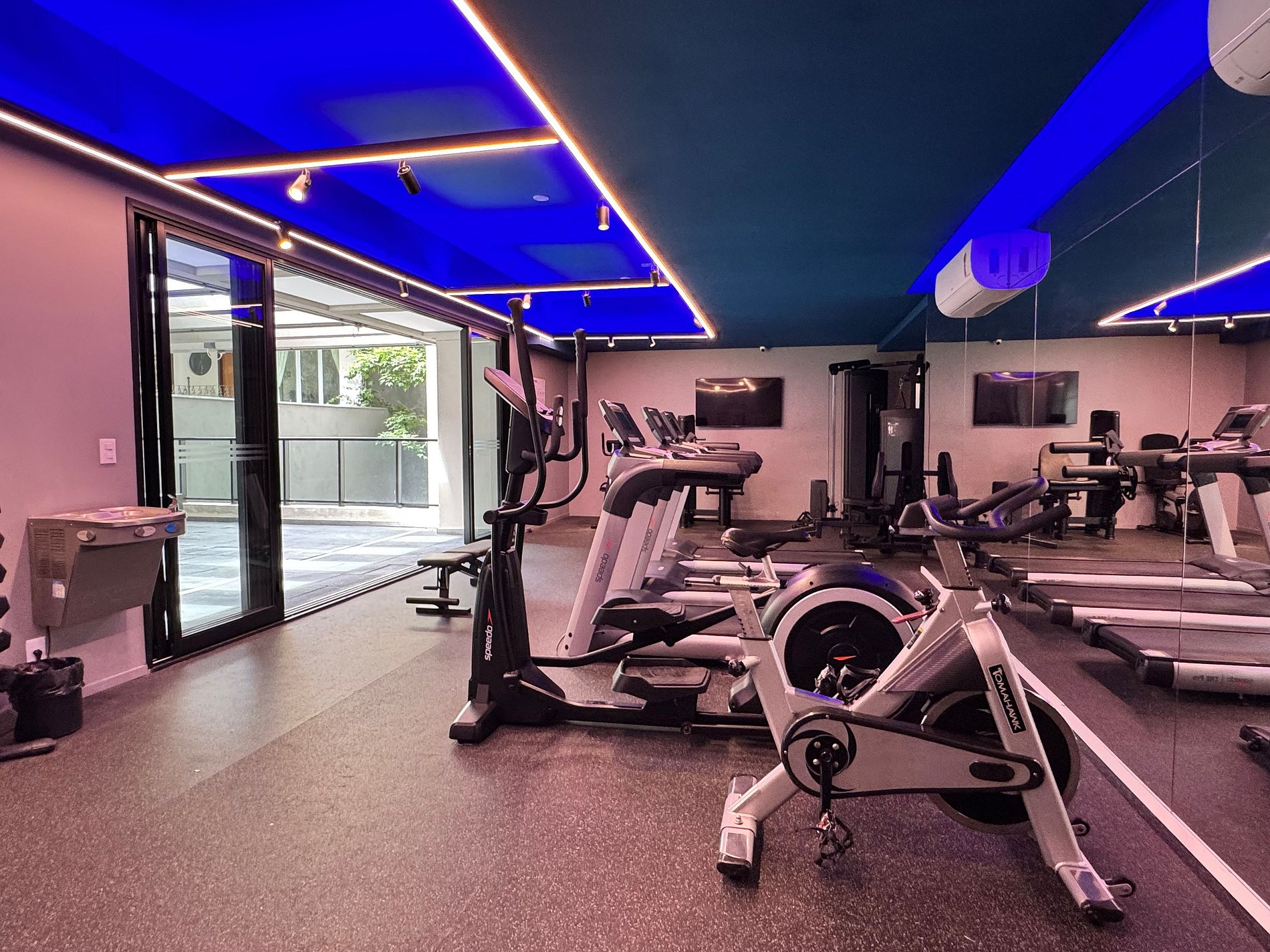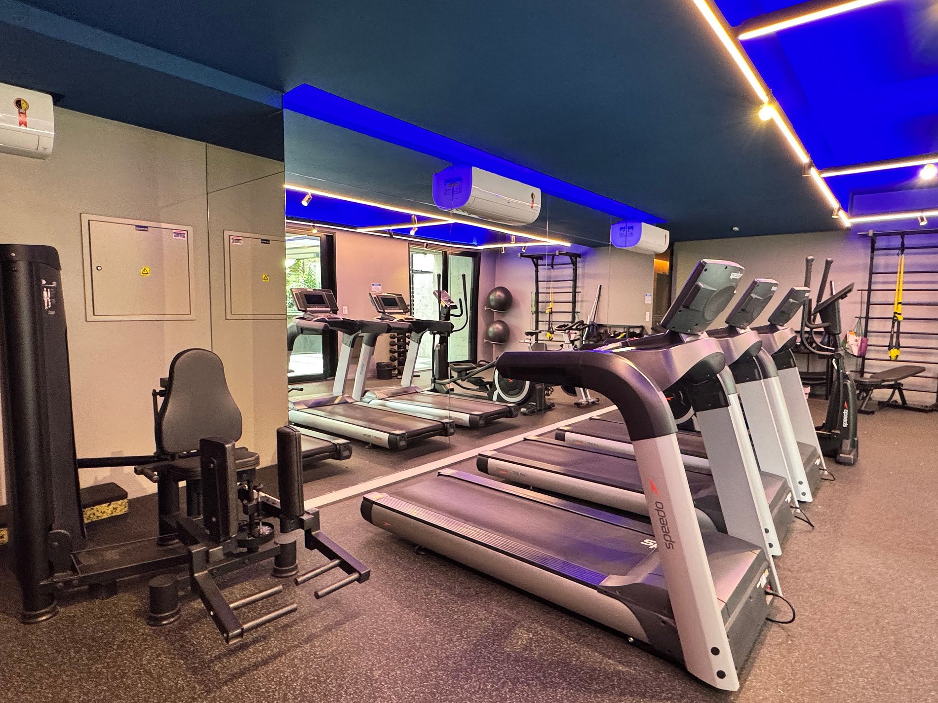 Auf dem Rooftop schafft der Pool mit Holzdeck, Glasbrüstung und freiem Blick über die Stadt eine urbane Rückzugsoase – ideal, um nach einem intensiven Tag zu entspannen oder den Morgen in ruhiger Atmosphäre zu beginnen. Das Fitnessstudio ist modern, gut beleuchtet und mit Laufbändern, Fahrrädern und einem Bereich für Krafttraining ausgestattet, sodass Sie Ihre Trainingsroutine fortsetzen können, ohne die Wohnanlage zu verlassen.