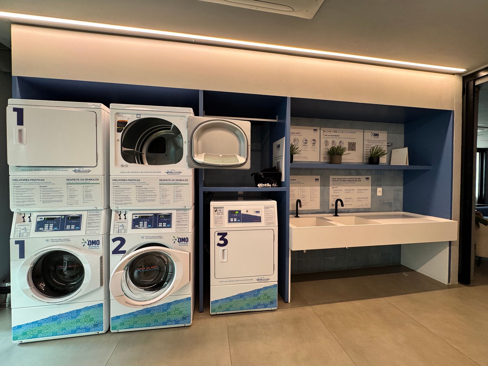 Zusätzlich gibt es einen Waschraum, der über die OMO-App genutzt wird und dank modernster Maschinen in einer aufgeräumten und funktionalen Umgebung hohen Komfort im Alltag bietet.