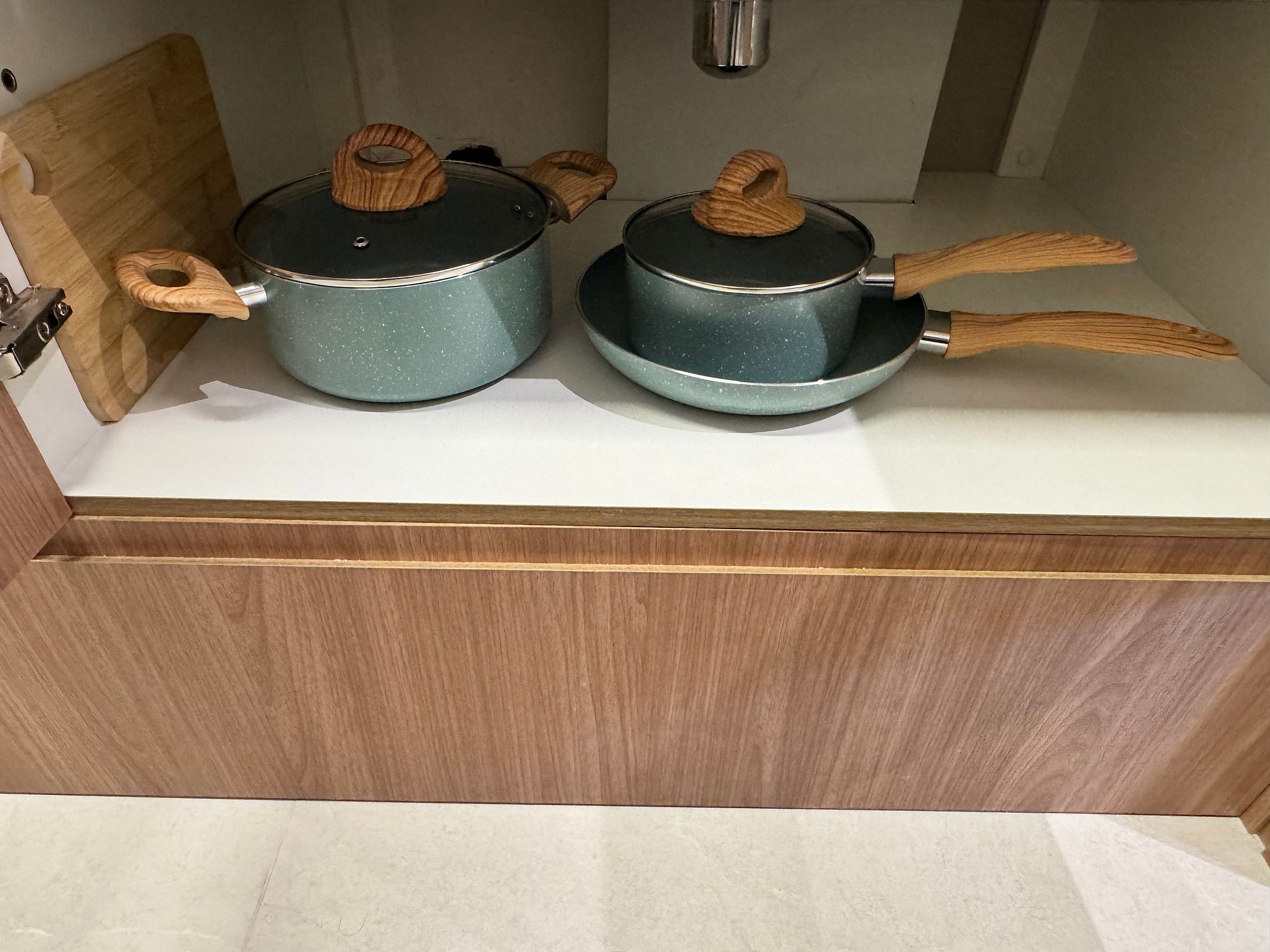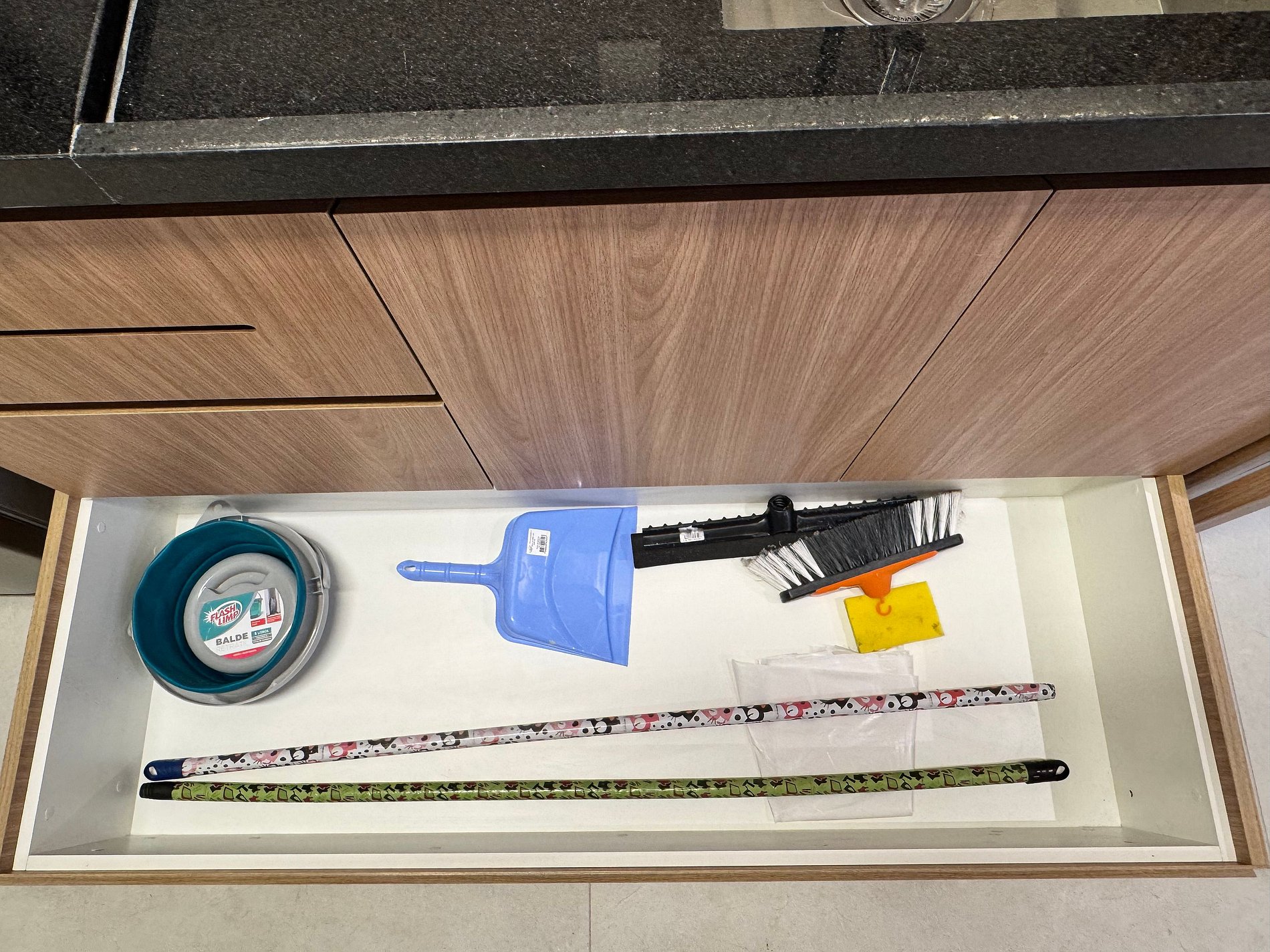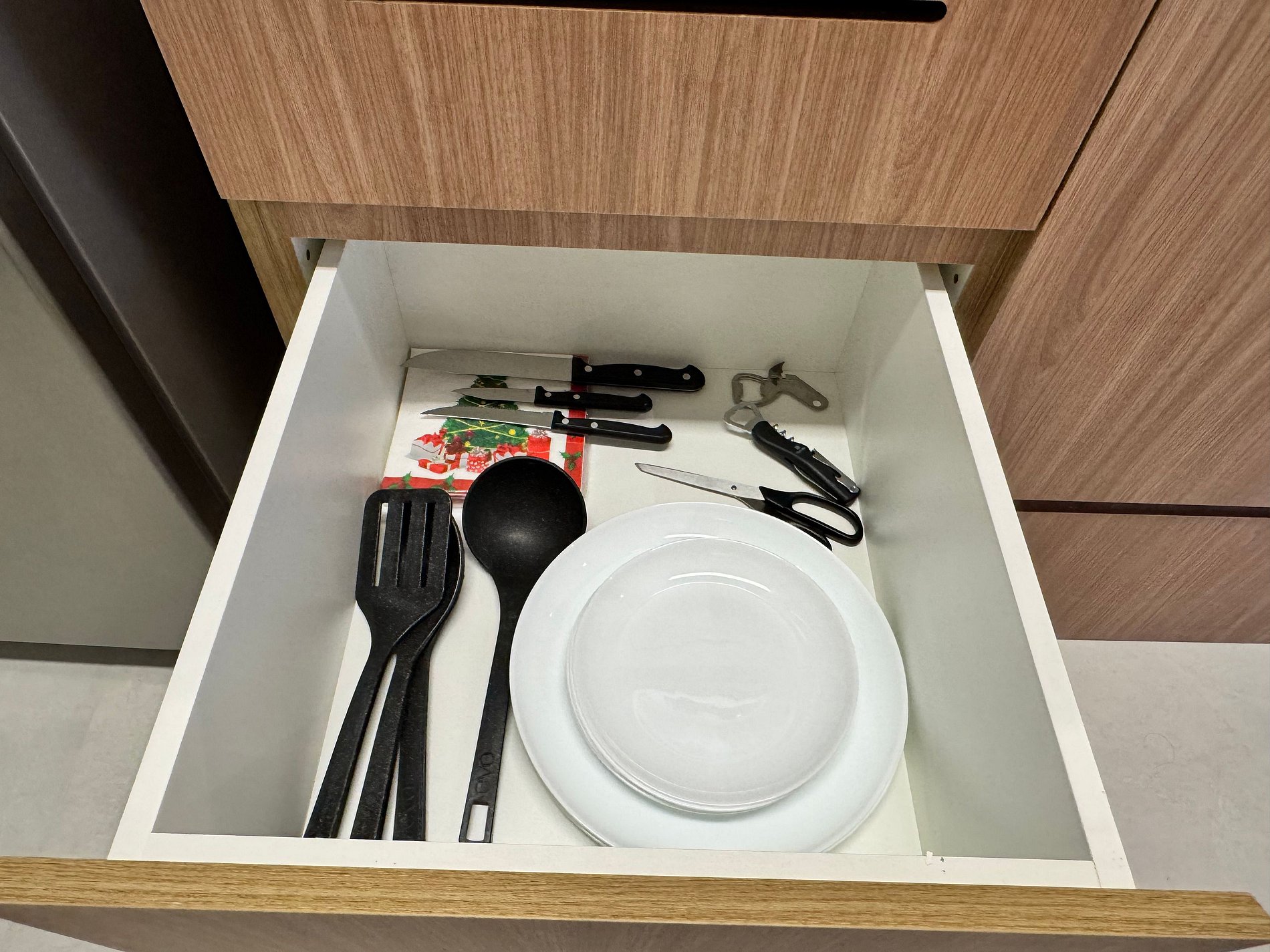 A green plastic bag is provided in the kitchen drawer for the disposal of recyclable materials such as paper, plastic, metal, and glass.