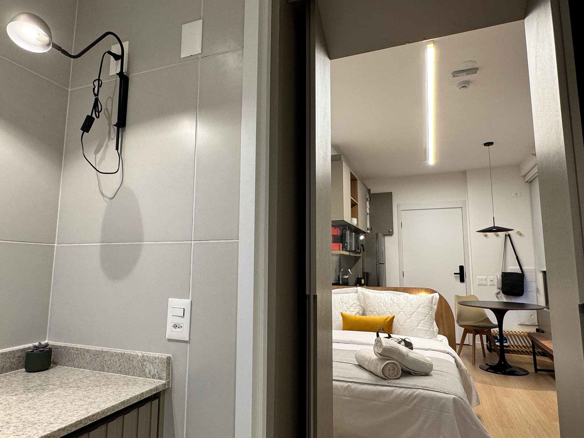 New studio with modern design, fully equipped and a spacious, well-ventilated bathroom, just steps from Paraíso Metro. Comfort, convenience, and the perfect location for business, leisure, or events in São Paulo.