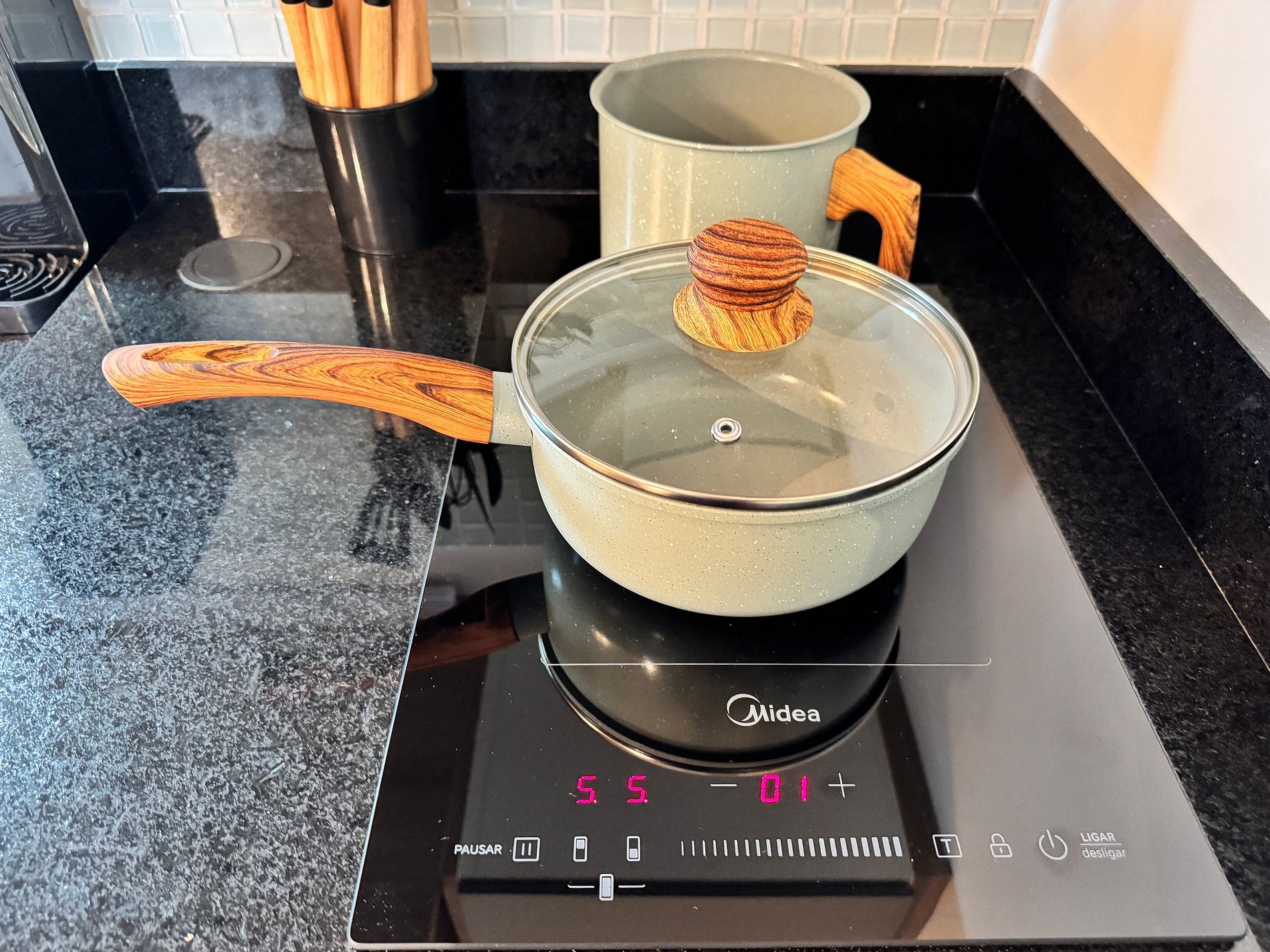 For work, the desk provides an organized and well-lit space. For relaxation, the hot/cold air conditioning, Smart TV, fiber-optic Wi-Fi, and high-quality linens create a cozy and comfortable environment. The fully equipped kitchen makes it easy to prepare meals, making the studio ideal for both short and long stays.