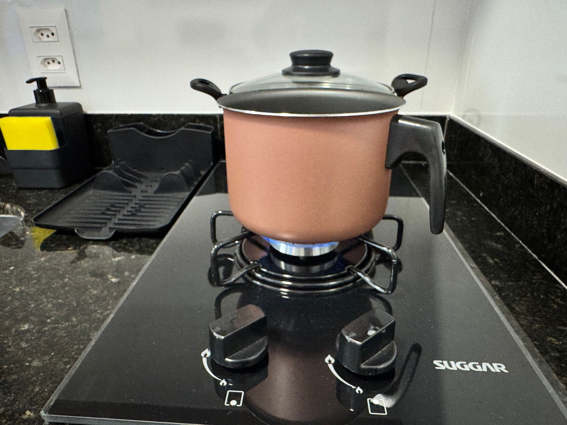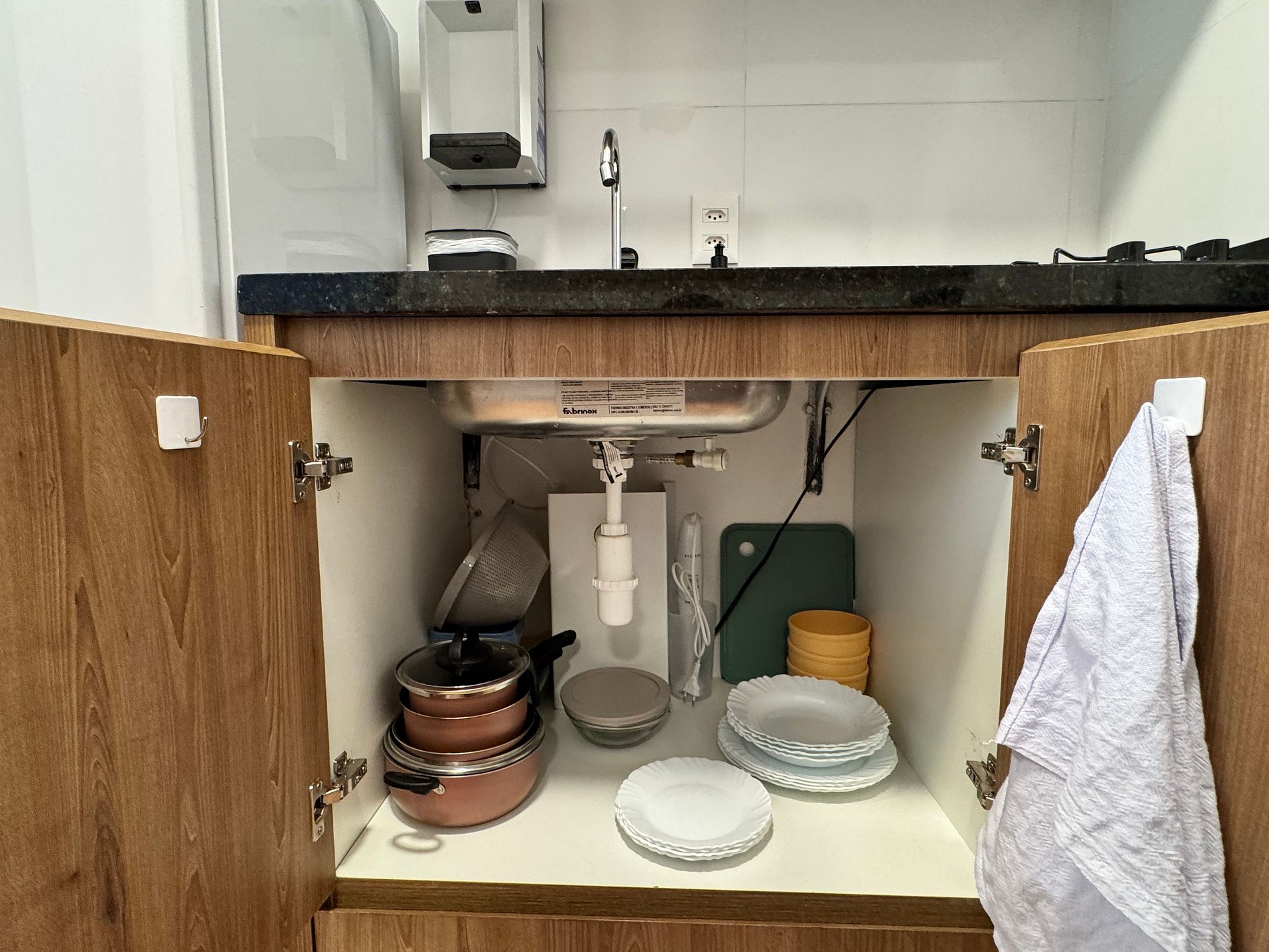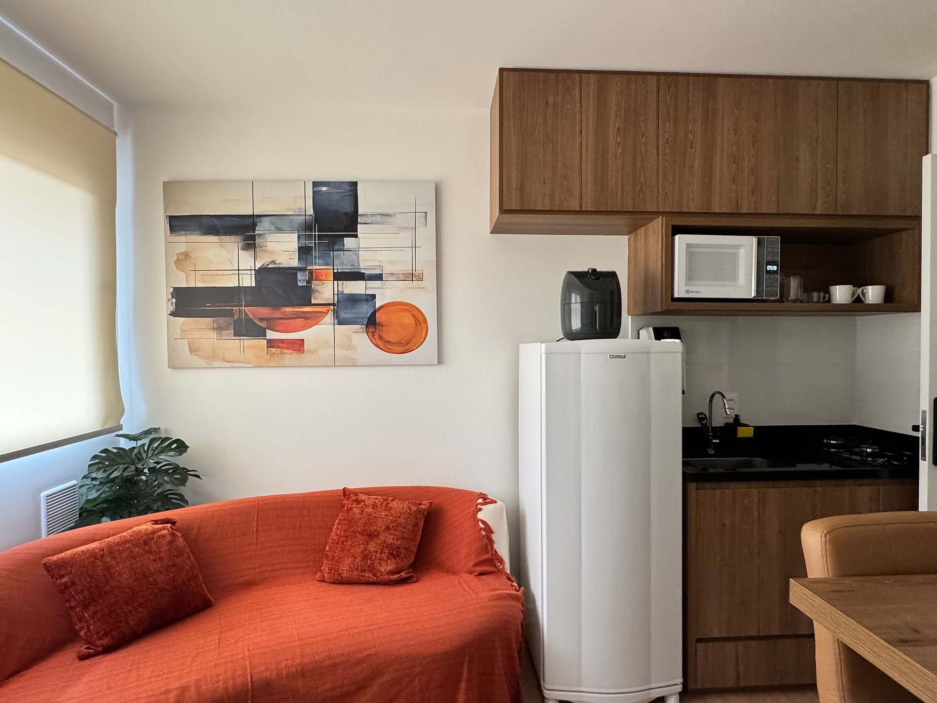 The compact kitchen is functional and well equipped with a cooktop, refrigerator, microwave, coffee maker, and essential utensils, providing autonomy to prepare anything from a quick coffee to complete meals.