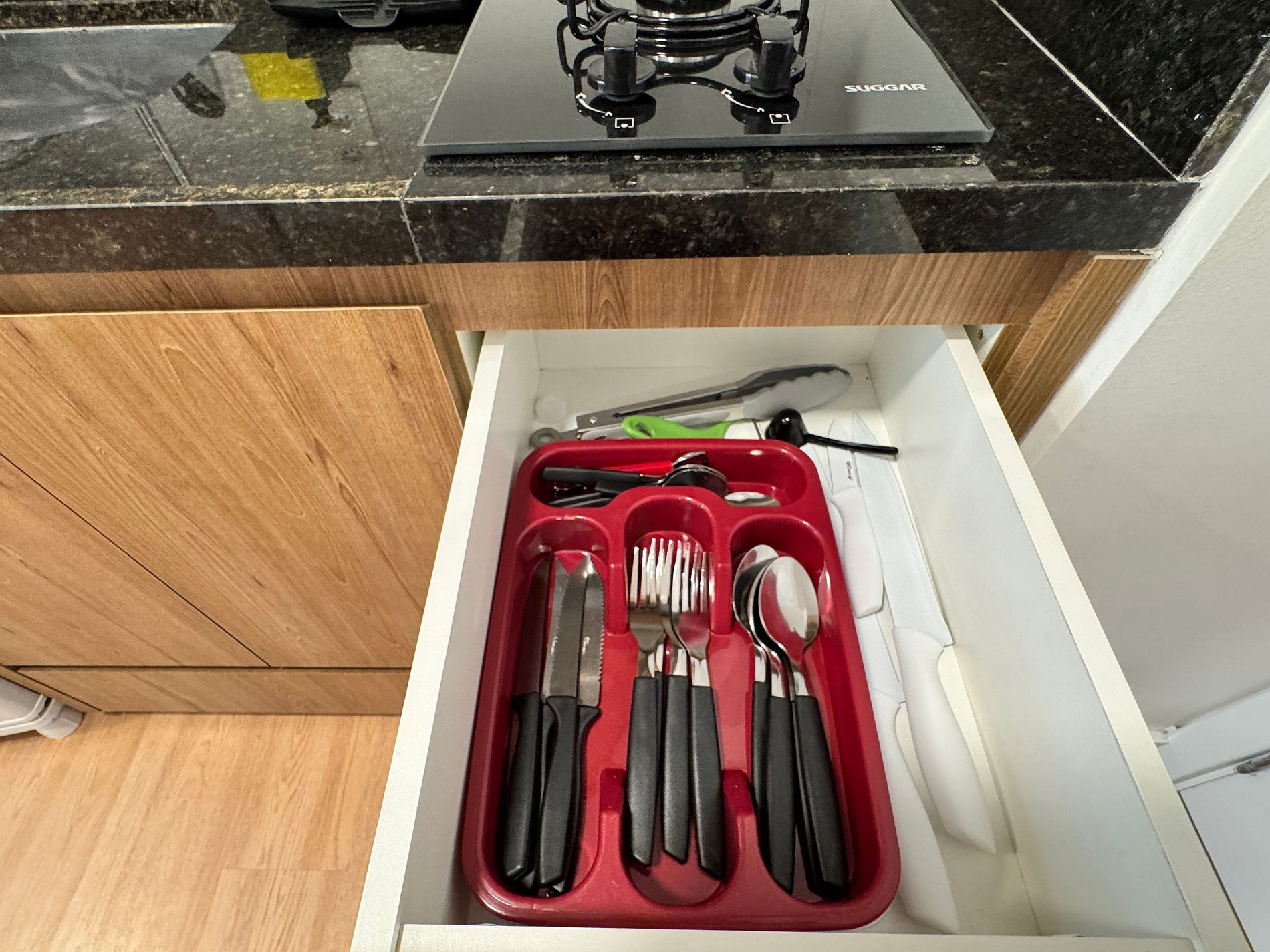 A green plastic bag is provided in the kitchen drawer for the disposal of recyclable materials such as paper, plastic, metal, and glass.
