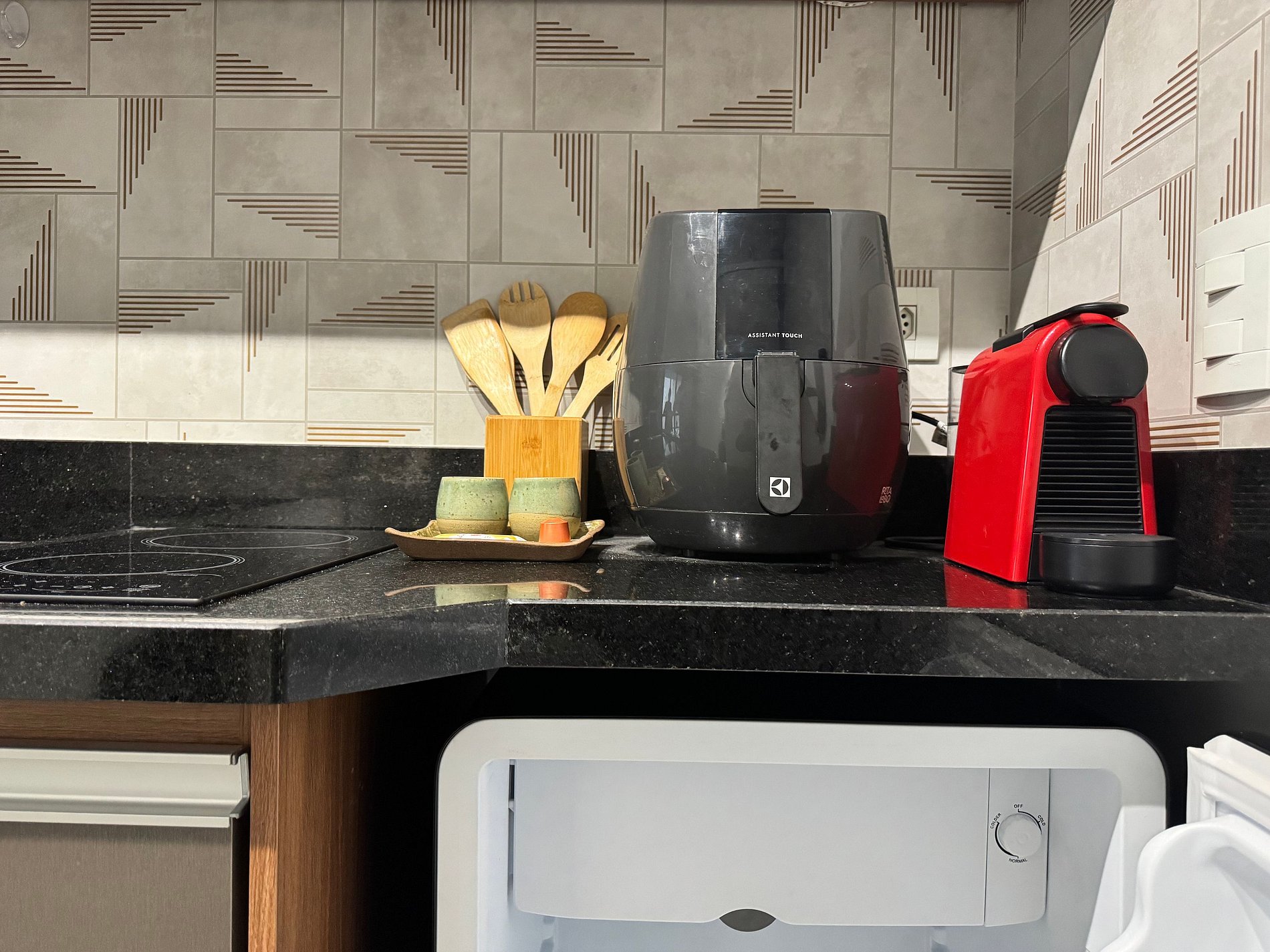 Prepara tus comidas con libertad y estilo. Dispones de una cocina por inducción, microondas, freidora de aire Electrolux, sandwichera, frigobar con congelador, cafetera Nespresso, purificador de agua con 3 temperaturas y armarios completos con utensilios de cocina.