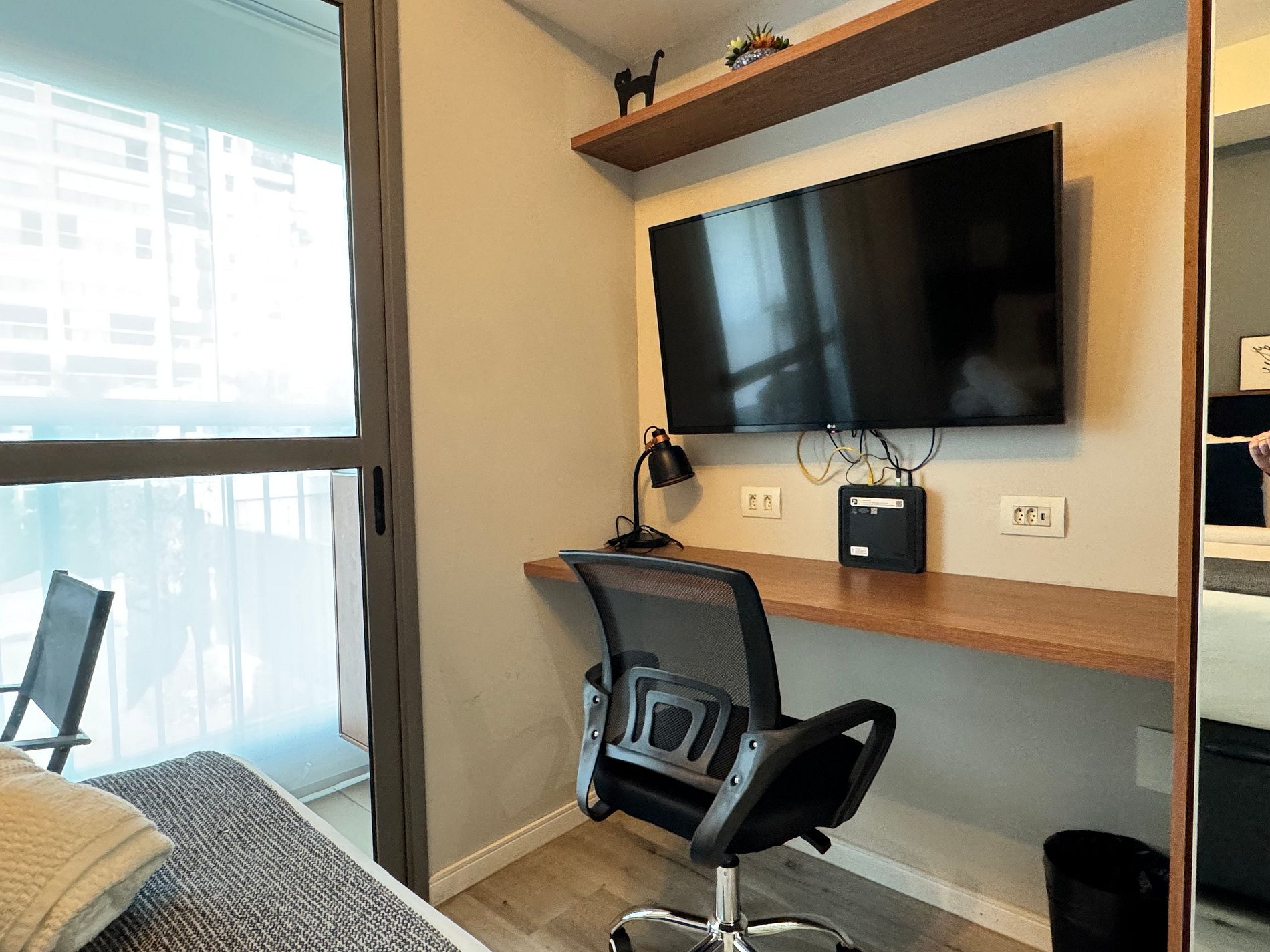 Tu espacio de trabajo incluye escritorio cómodo, lámpara de lectura, silla gamer ergonómica, enchufes con USB y Wi-Fi Vivo Fibra de 700 MB. Productividad con silencio, seguridad y privacidad.