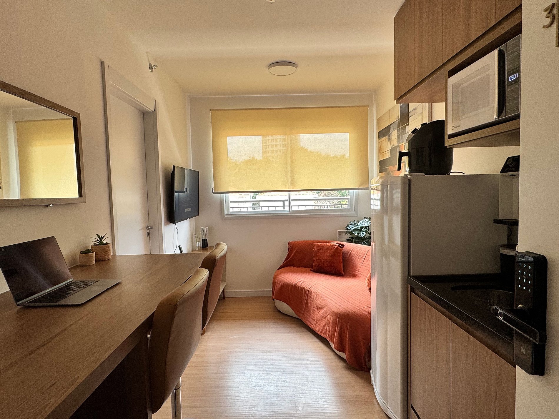 Este apartamento fue diseñado para ofrecer más comodidad y privacidad que los estudios convencionales. El dormitorio en suite cuenta con puerta independiente, ropa de cama de alta calidad, aire acondicionado y una ventana con persiana blackout integrada, lo que garantiza privacidad y noches de sueño realmente reparadoras.