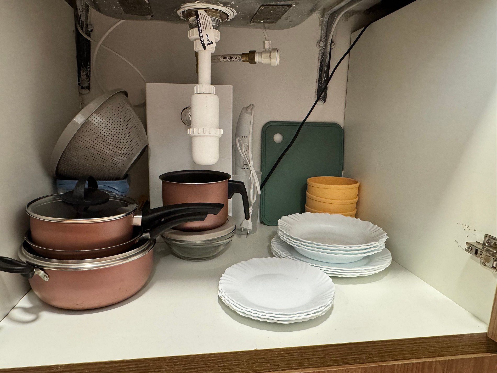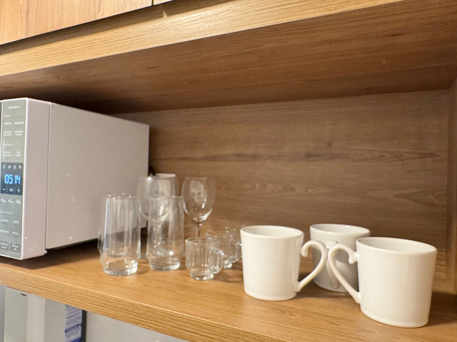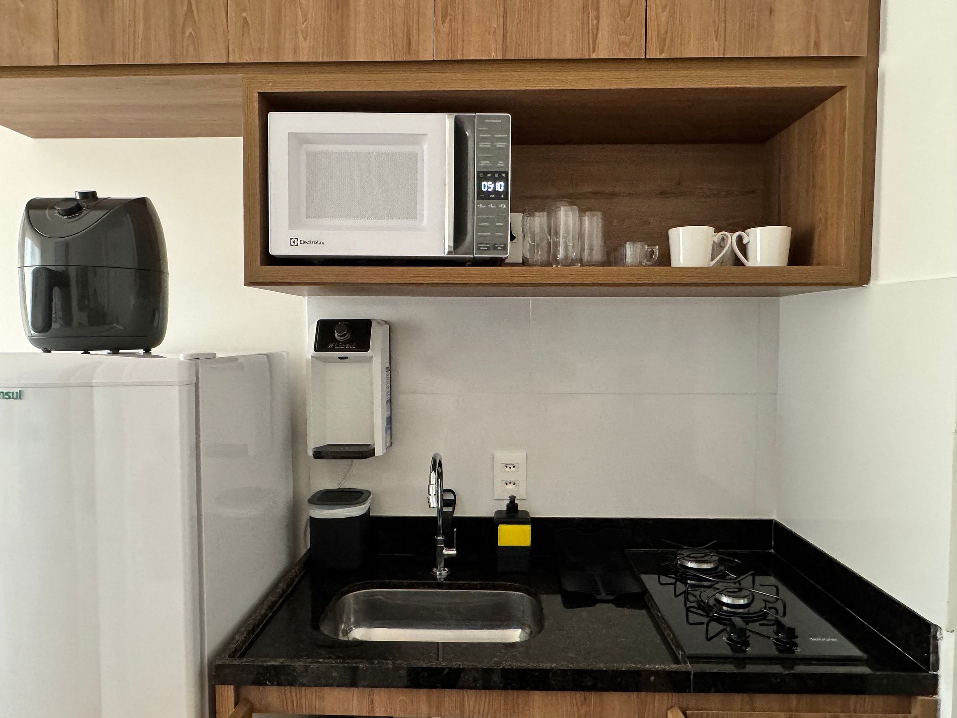 La cocina compacta es funcional y está bien equipada con anafe, heladera, microondas, cafetera y utensilios esenciales, ofreciendo autonomía para preparar desde un café rápido hasta comidas completas.