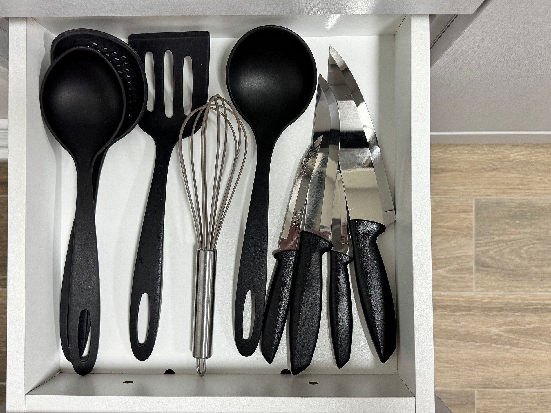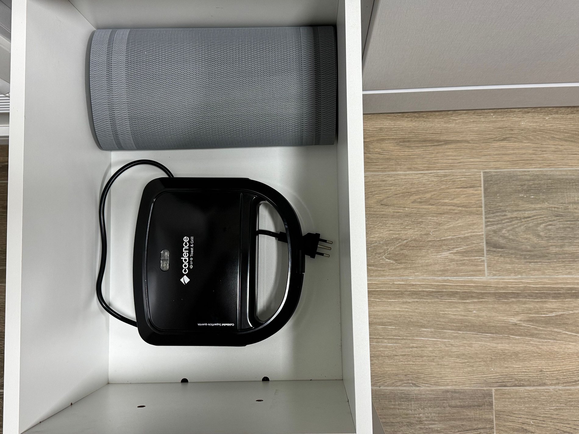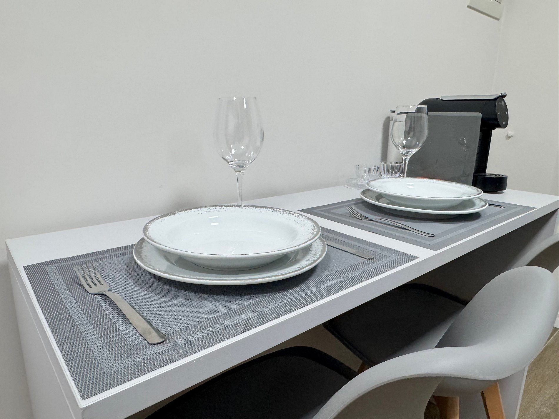 La cuisine compacte est fonctionnelle et bien équipée avec plaque de cuisson, réfrigérateur, micro-ondes, cafetière et ustensiles essentiels, offrant l’autonomie nécessaire pour préparer aussi bien un café rapide que des repas complets.