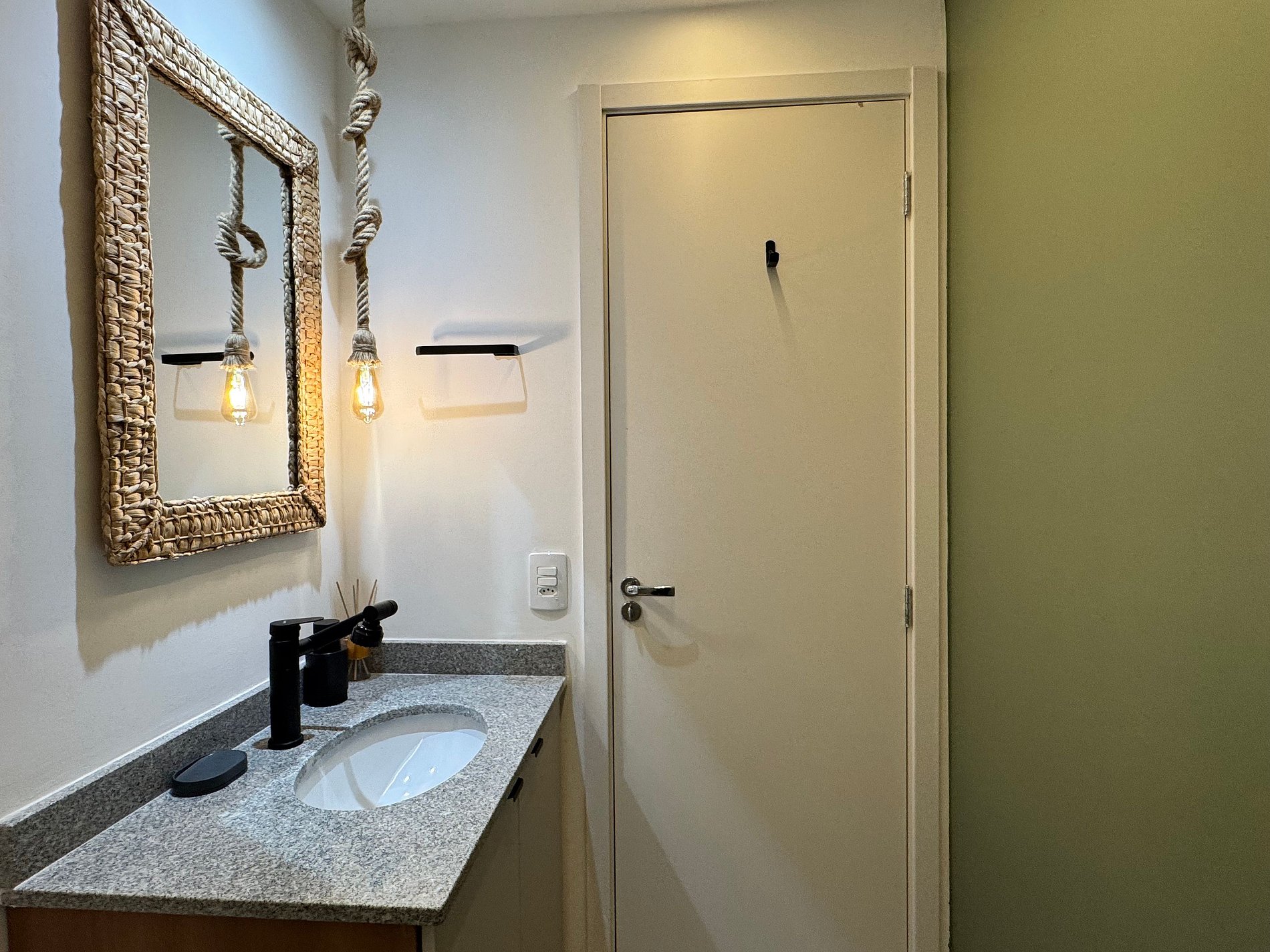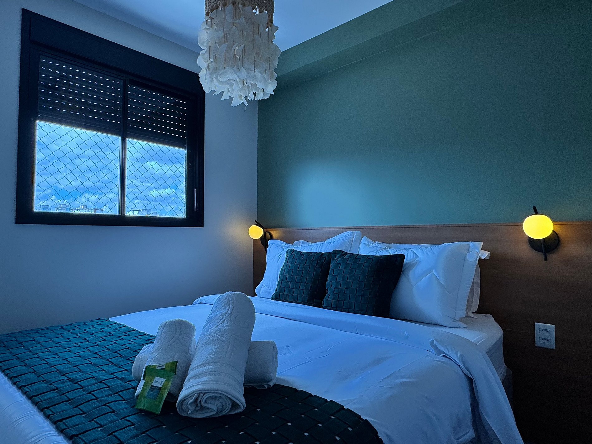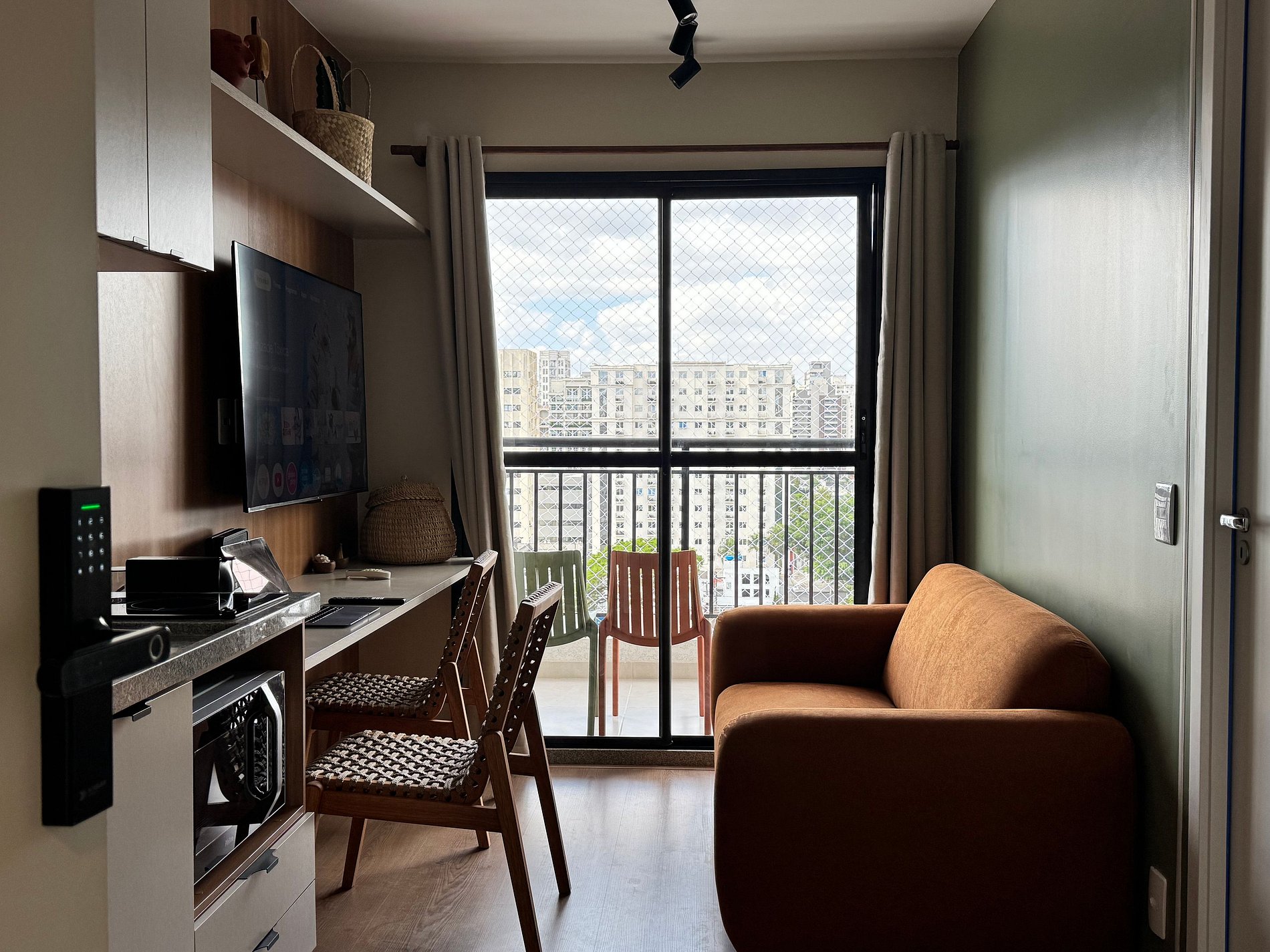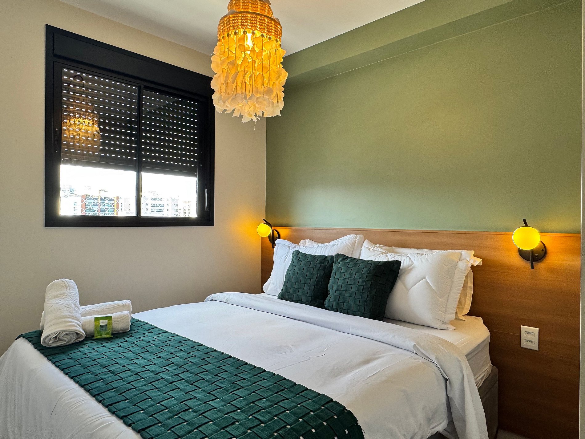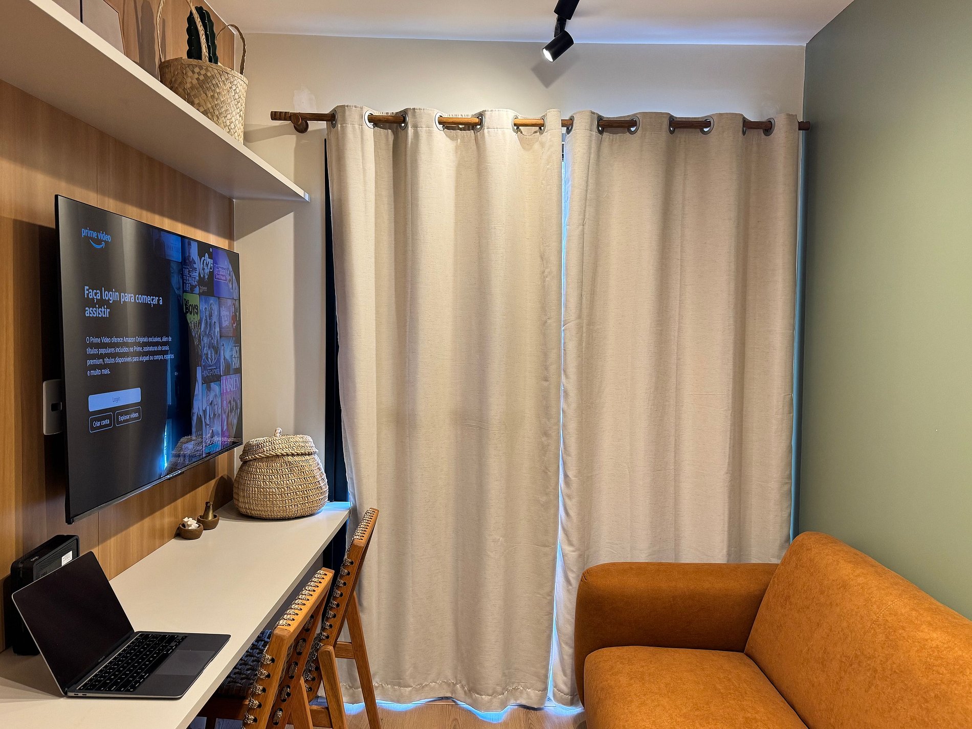 Appartement moderne avec chambre indépendante, salon avec canapé et Smart TV, balcon avec vue, cuisine entièrement équipée (plaque, micro-ondes, réfrigérateur, Nespresso et friteuse à air) et espace de travail pour deux personnes. Chambre avec climatisation et linge de lit confortable ; salle de bain avec douche efficace et paroi vitrée. Idéal pour les séjours de loisirs ou en télétravail à Moema, avec accès à la piscine et à la salle de sport de la résidence, à minutes du métro Eucaliptos.