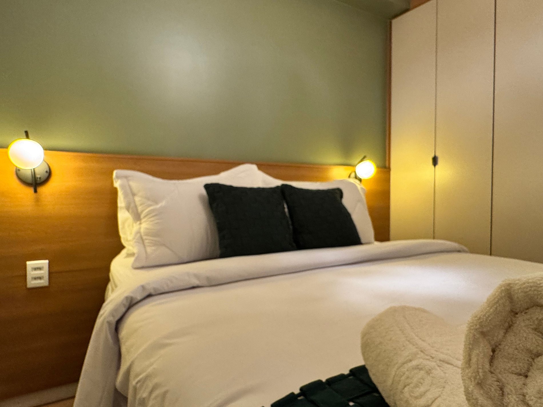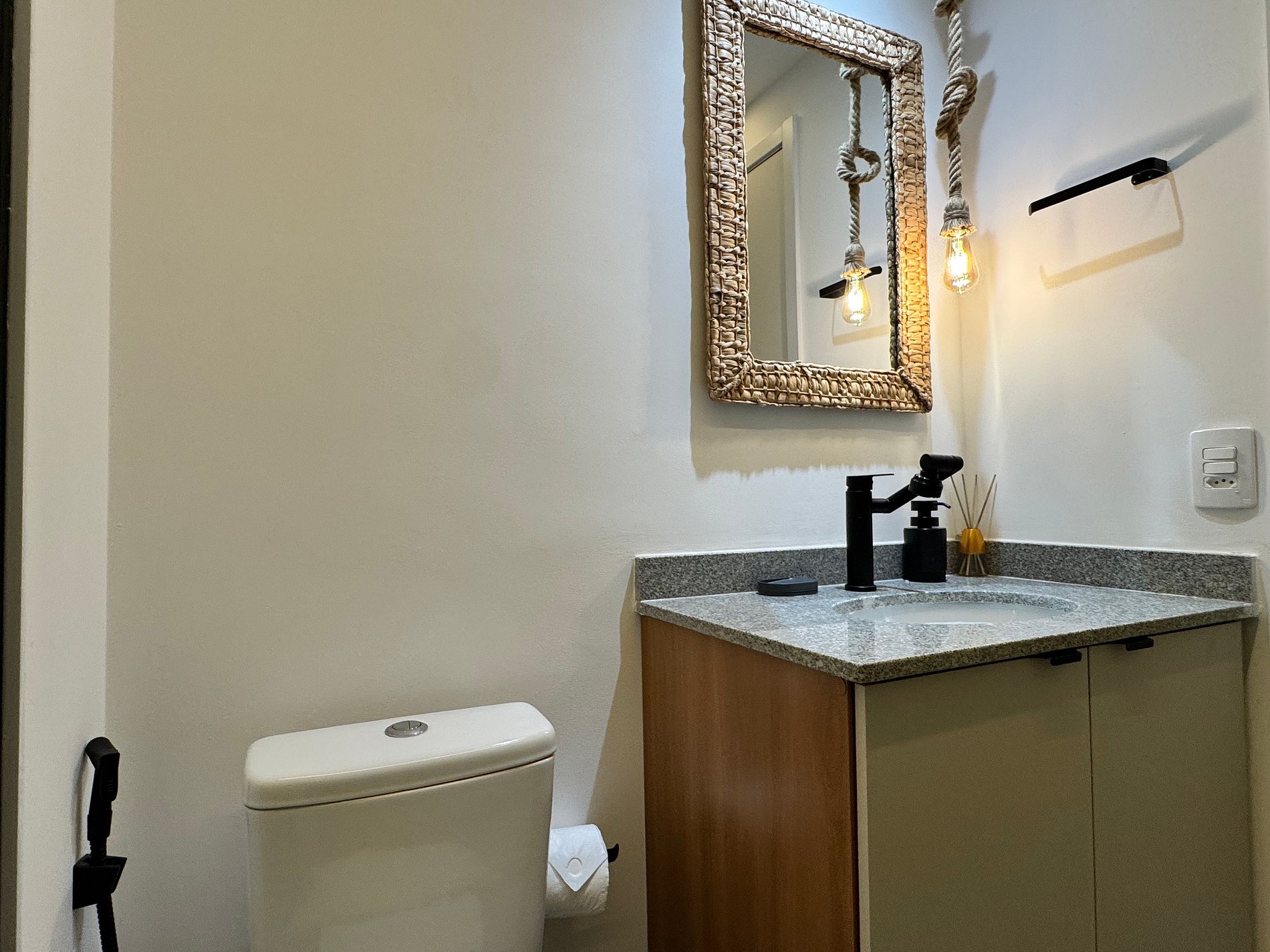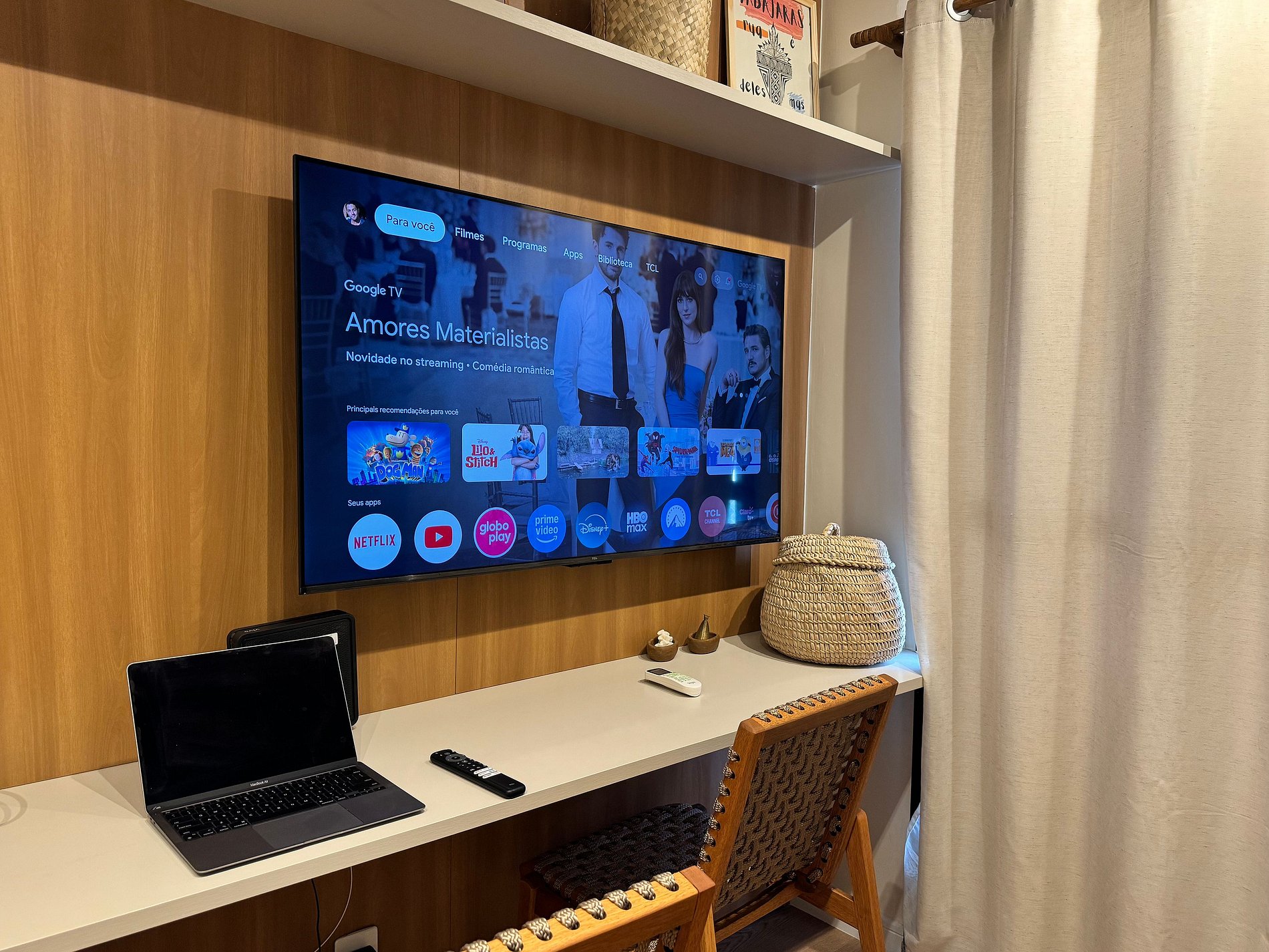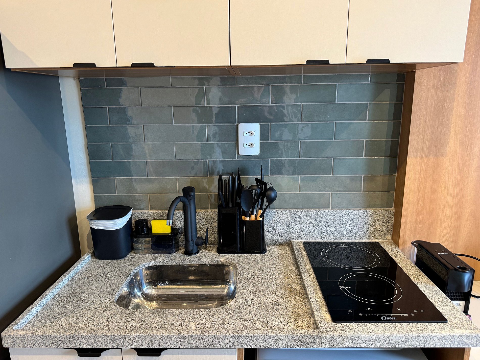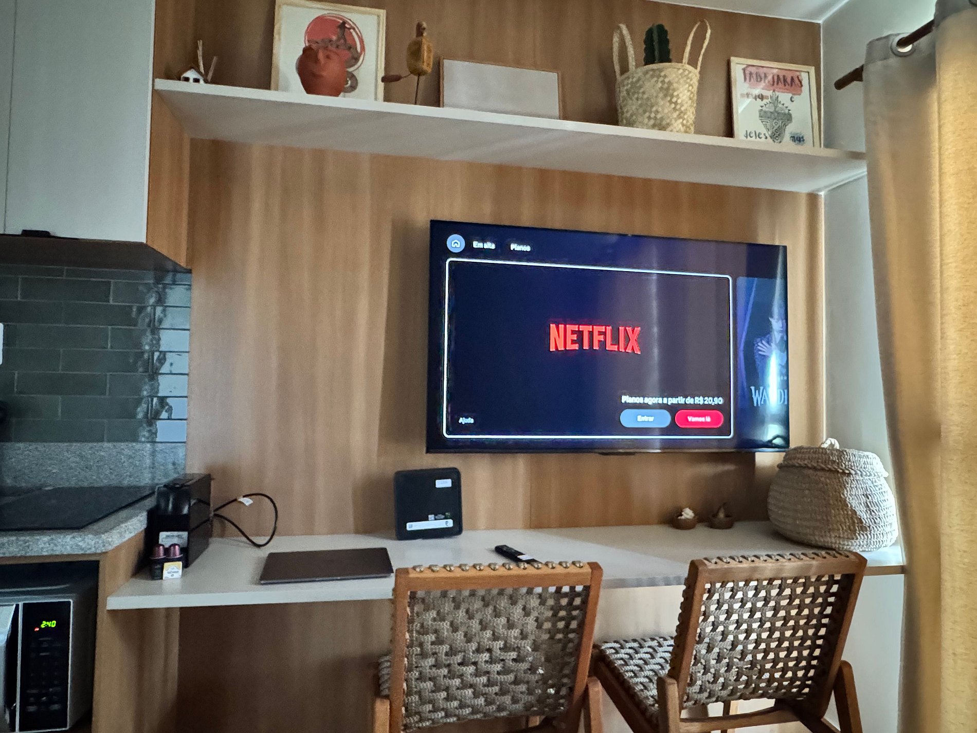 Appartement moderne avec chambre indépendante, salon avec canapé et Smart TV, balcon avec vue, cuisine entièrement équipée (plaque, micro-ondes, réfrigérateur, Nespresso et friteuse à air) et espace de travail pour deux personnes. Chambre avec climatisation et linge de lit confortable ; salle de bain avec douche efficace et paroi vitrée. Idéal pour les séjours de loisirs ou en télétravail à Moema, avec accès à la piscine et à la salle de sport de la résidence, à minutes du métro Eucaliptos.