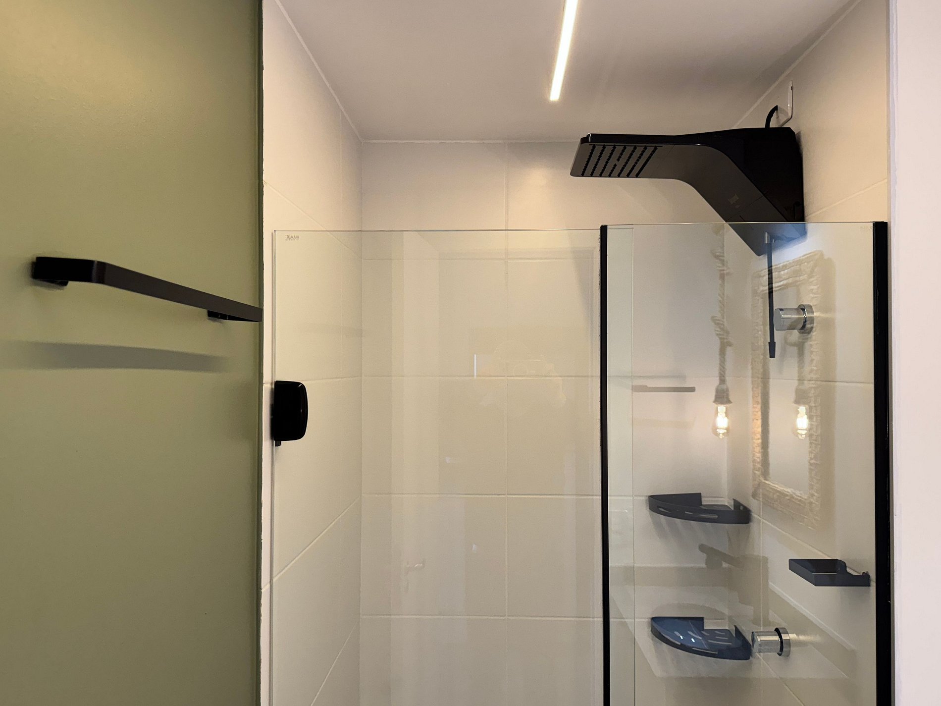 Le balcon aménagé, avec chaises et filet de protection, invite à profiter de la vue urbaine, que ce soit autour d’un café matinal ou en se relaxant en fin de journée. La salle de bain moderne, avec douche vitrée et excellente pression d’eau, complète l’expérience avec fonctionnalité et style.