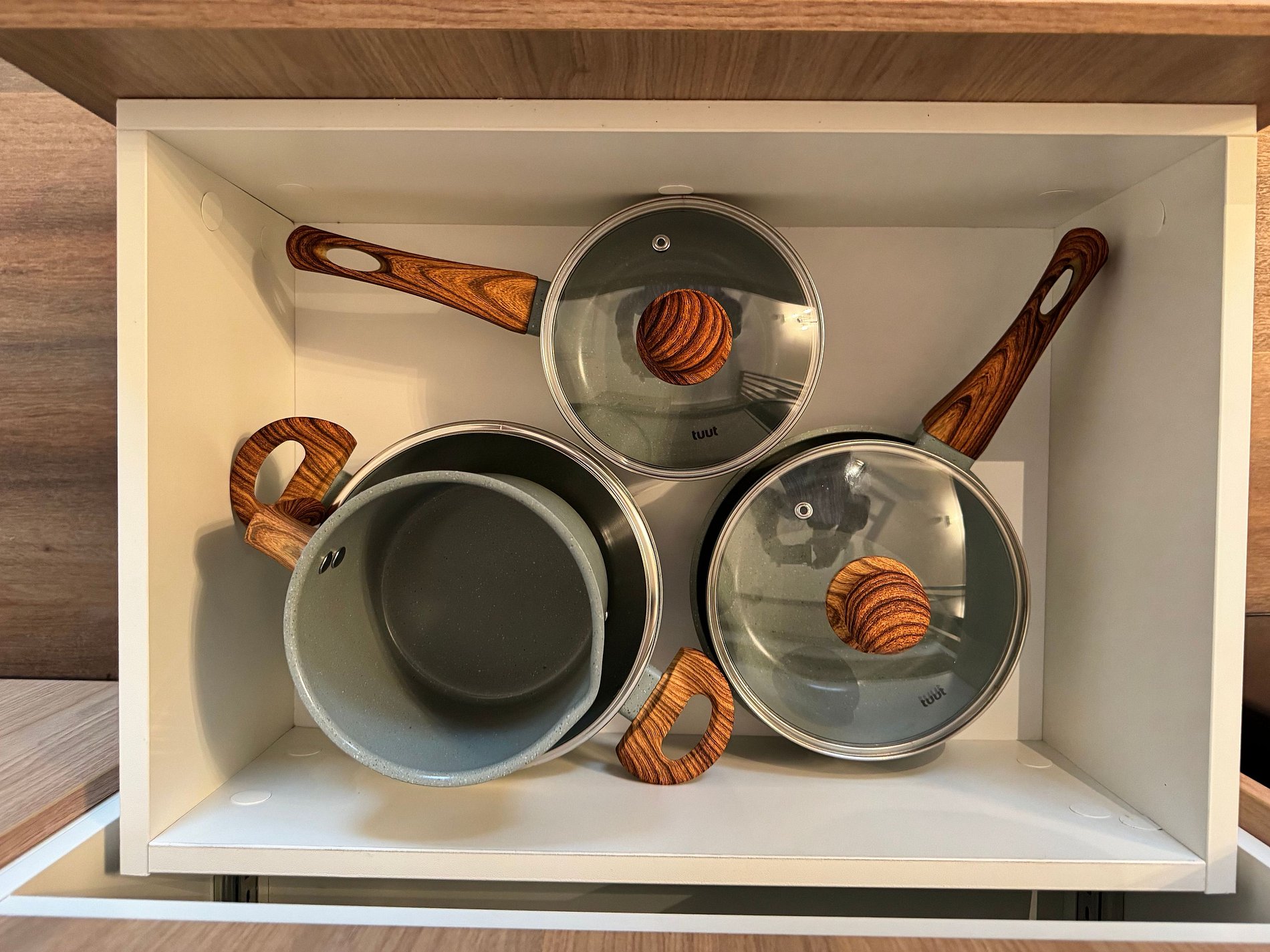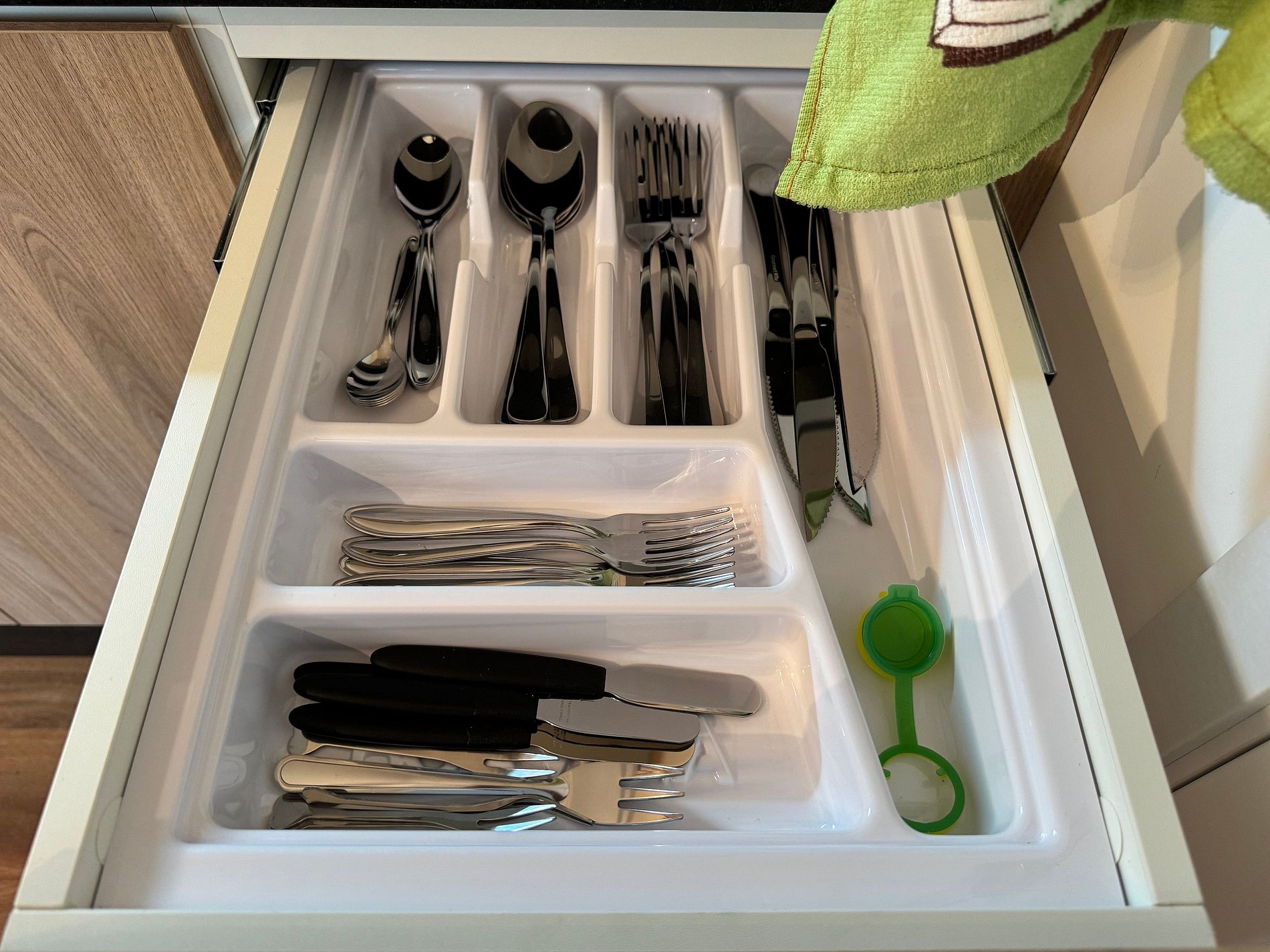 Un sac en plastique vert est disponible dans le tiroir de la cuisine pour l'élimination des matériaux recyclables tels que le papier, le plastique, le métal et le verre.
