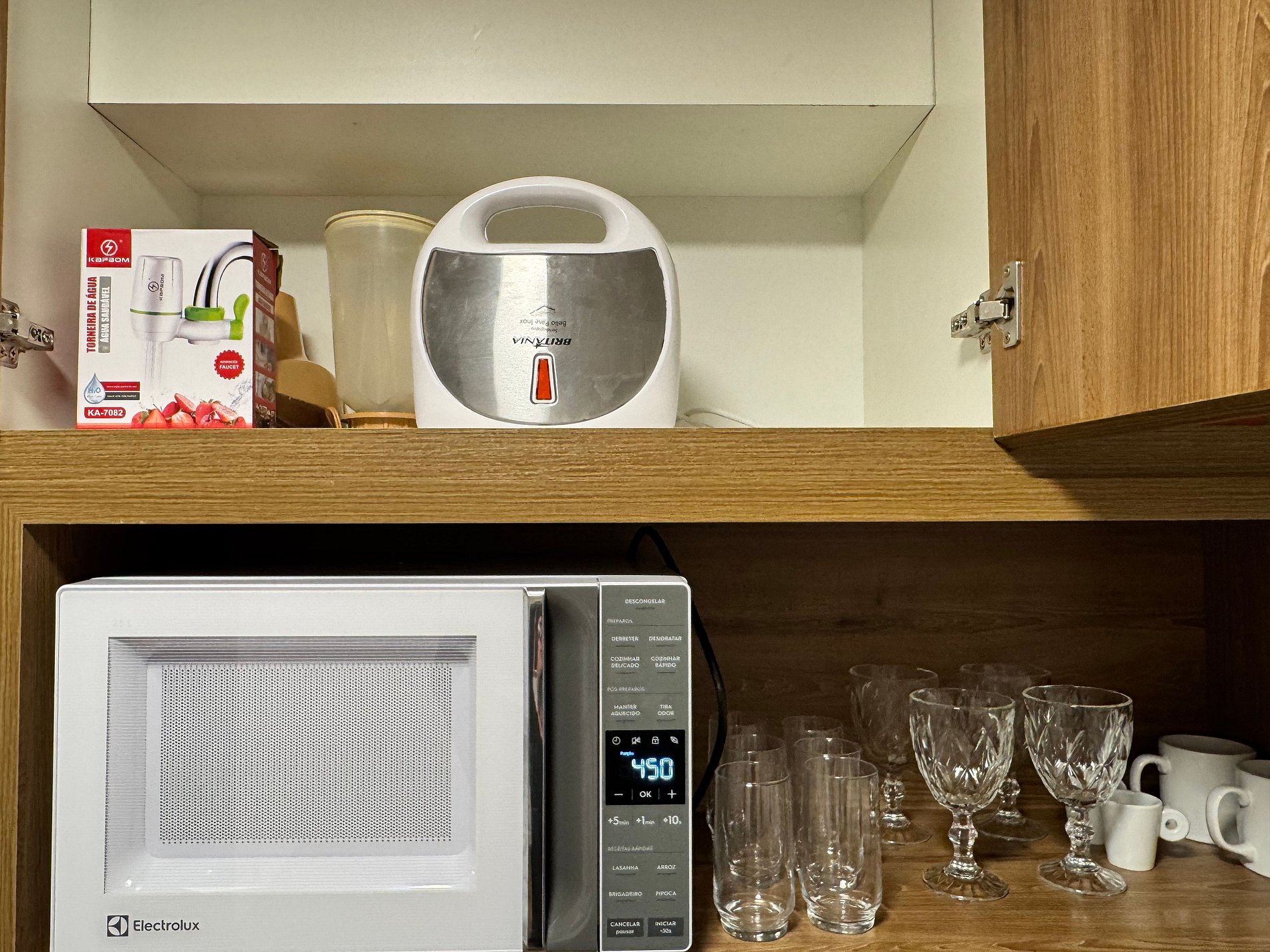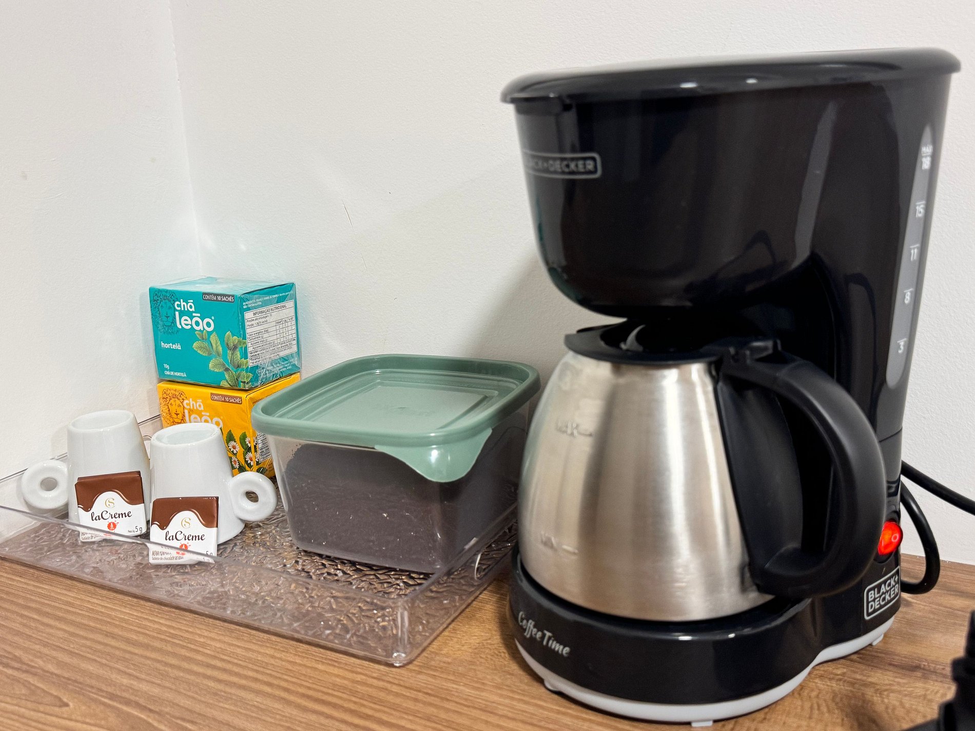 A cozinha compacta é funcional e bem equipada, com cooktop, geladeira, micro-ondas, cafeteira e utensílios essenciais, oferecendo autonomia para preparar desde um café rápido até refeições completas.