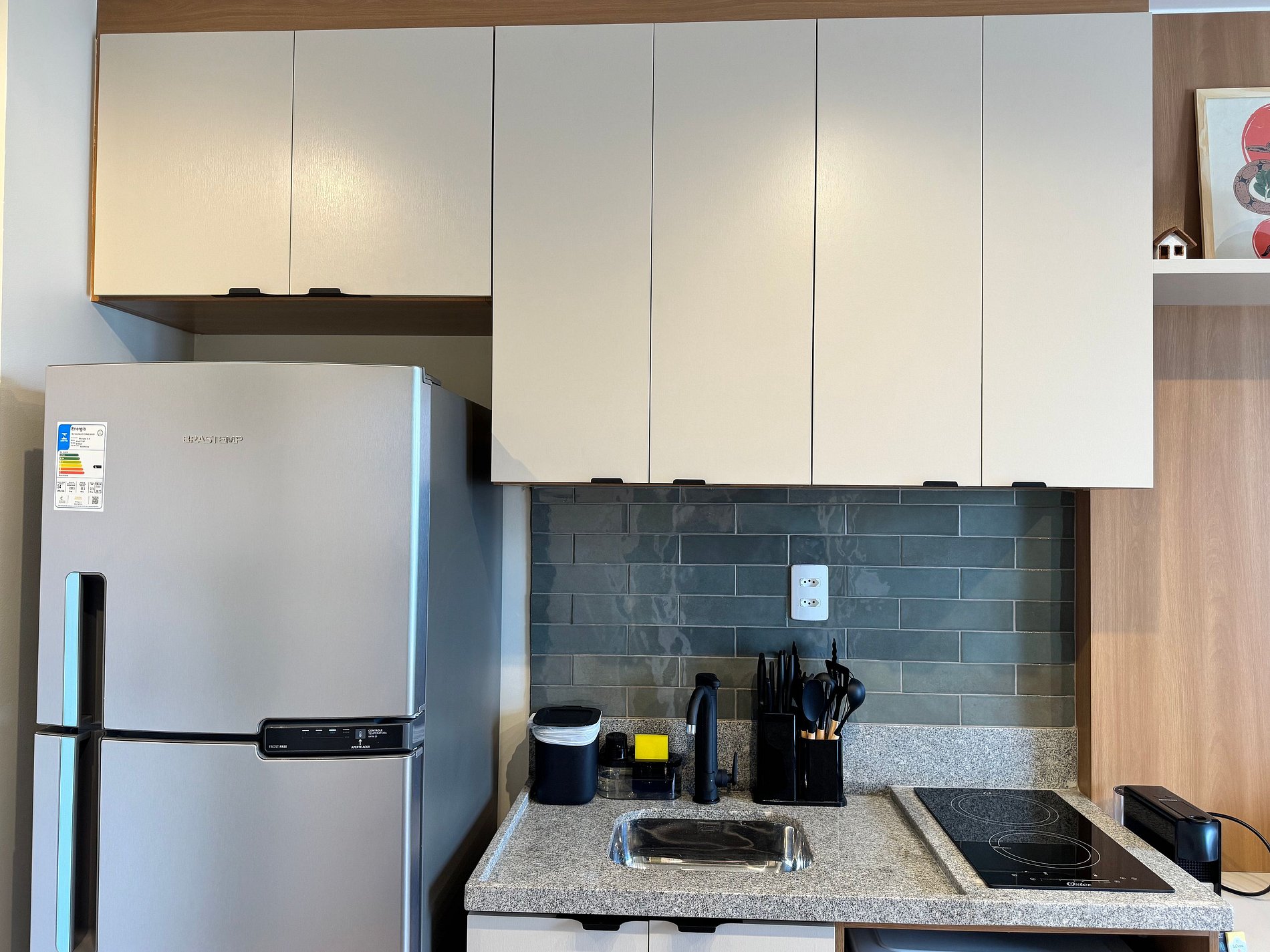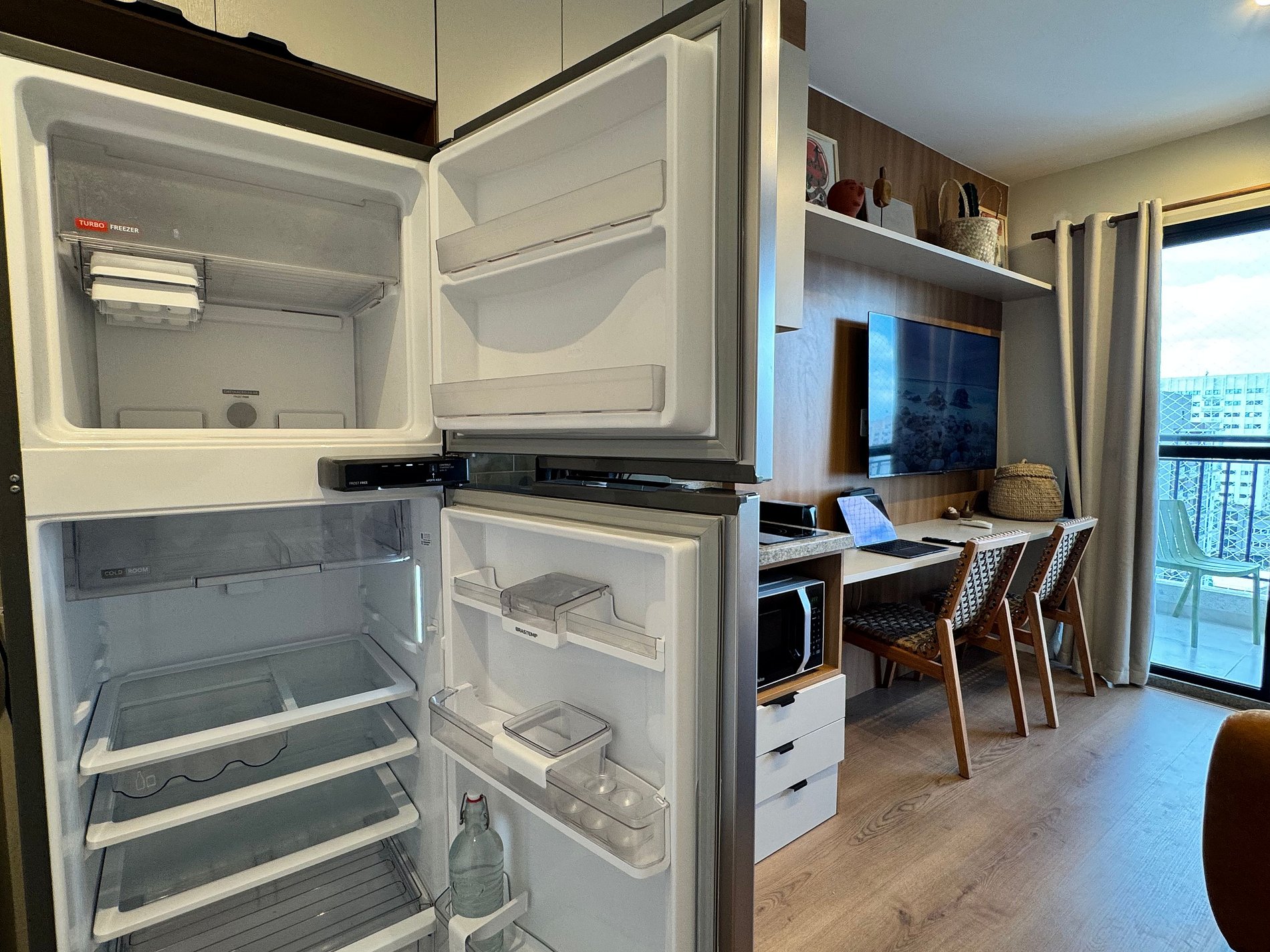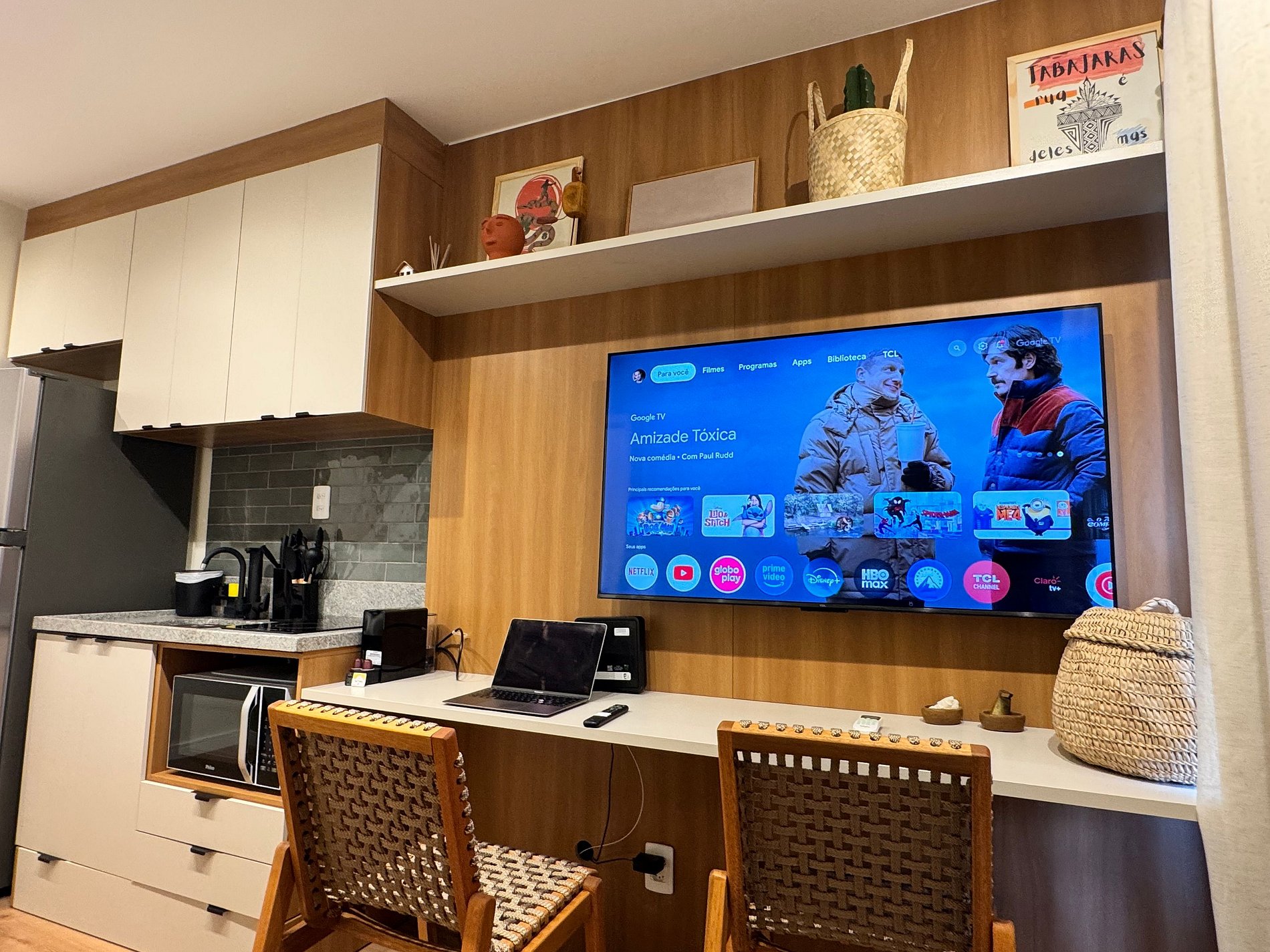 A cozinha completa está equipada com cooktop, micro-ondas, geladeira, cafeteira Nespresso, air fryer, utensílios e panelas — ideal tanto para preparar refeições rápidas quanto para quem gosta de cozinhar. Ao lado, uma bancada de trabalho dupla com duas cadeiras confortáveis oferece praticidade para home office ou estudos.