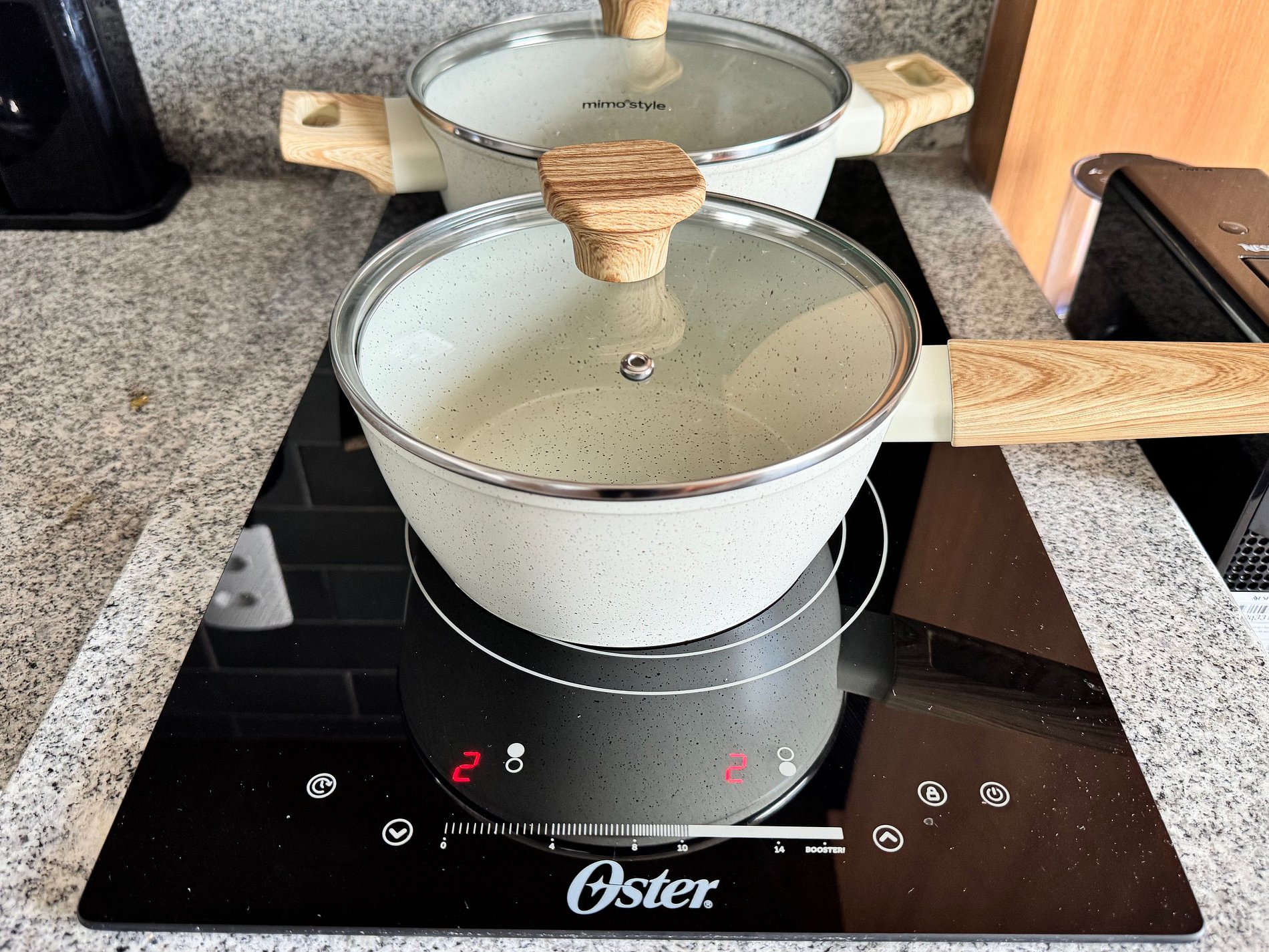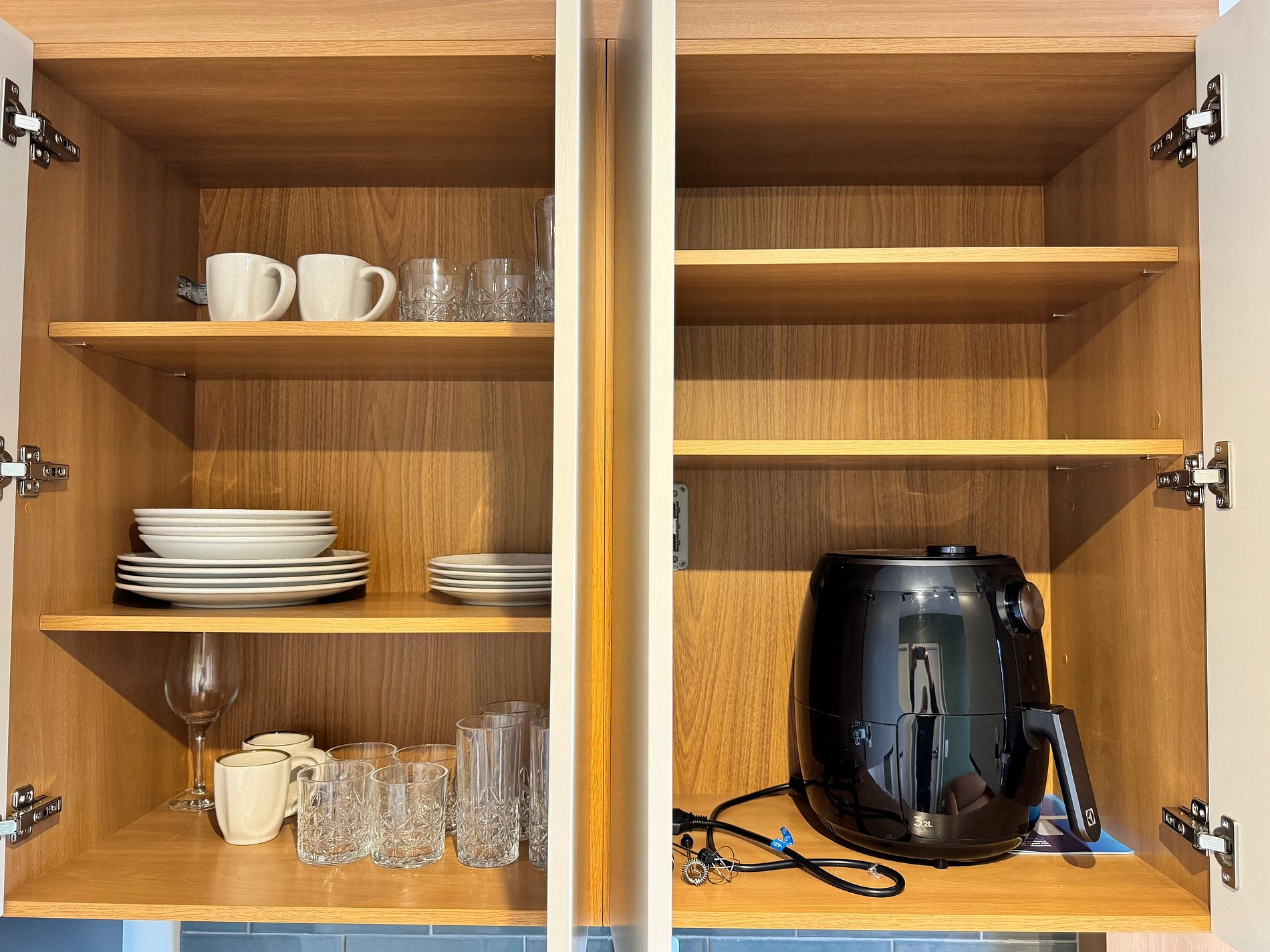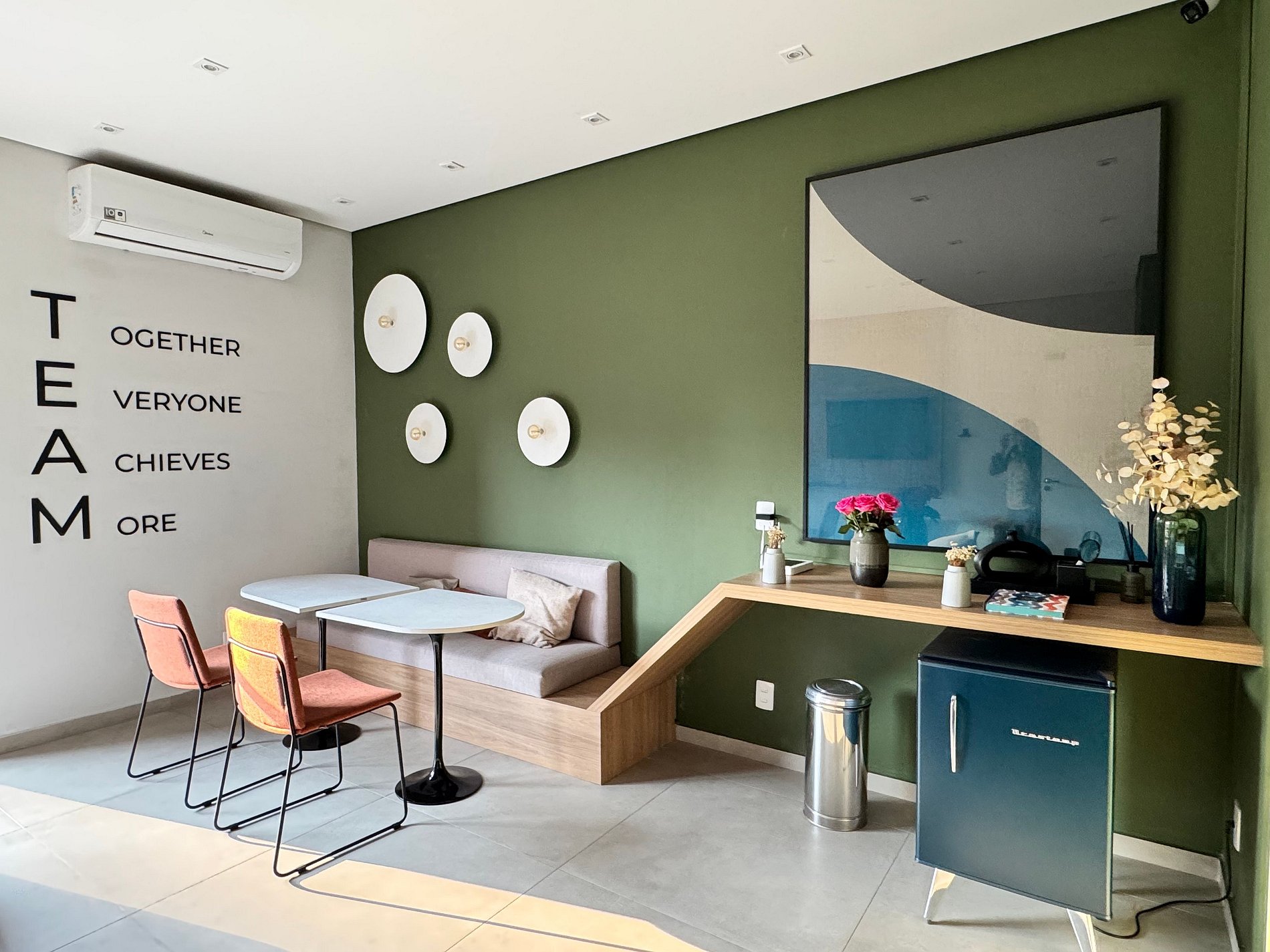 A cozinha completa está equipada com cooktop, micro-ondas, geladeira, cafeteira Nespresso, air fryer, utensílios e panelas — ideal tanto para preparar refeições rápidas quanto para quem gosta de cozinhar. Ao lado, uma bancada de trabalho dupla com duas cadeiras confortáveis oferece praticidade para home office ou estudos.