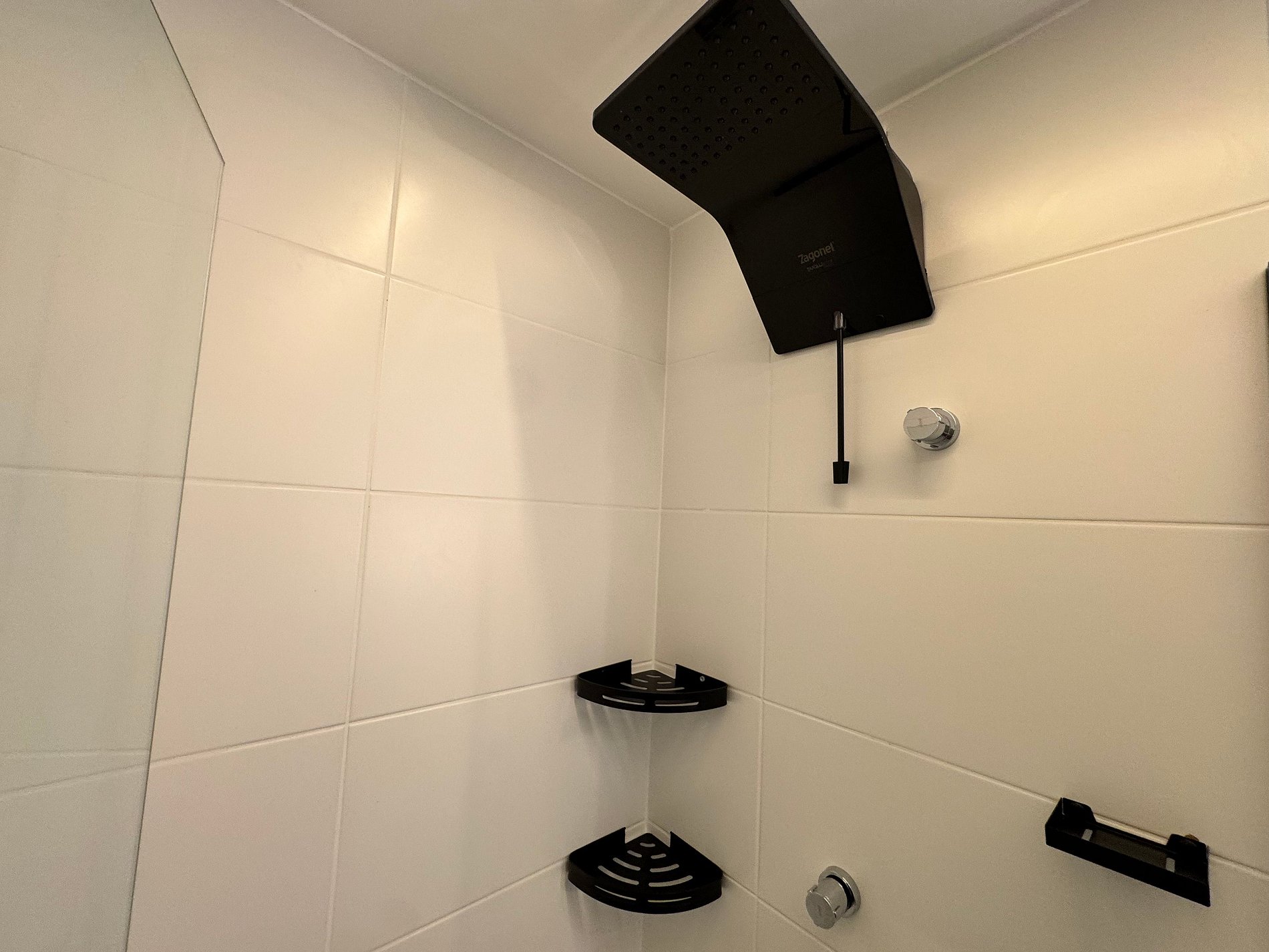 A varanda mobiliada, com cadeiras e tela de proteção, é um convite para apreciar a vista urbana, seja tomando um café pela manhã ou relaxando ao fim do dia. O banheiro moderno, com box de vidro e ducha de ótima pressão, complementa a experiência de hospedagem com funcionalidade e estilo.