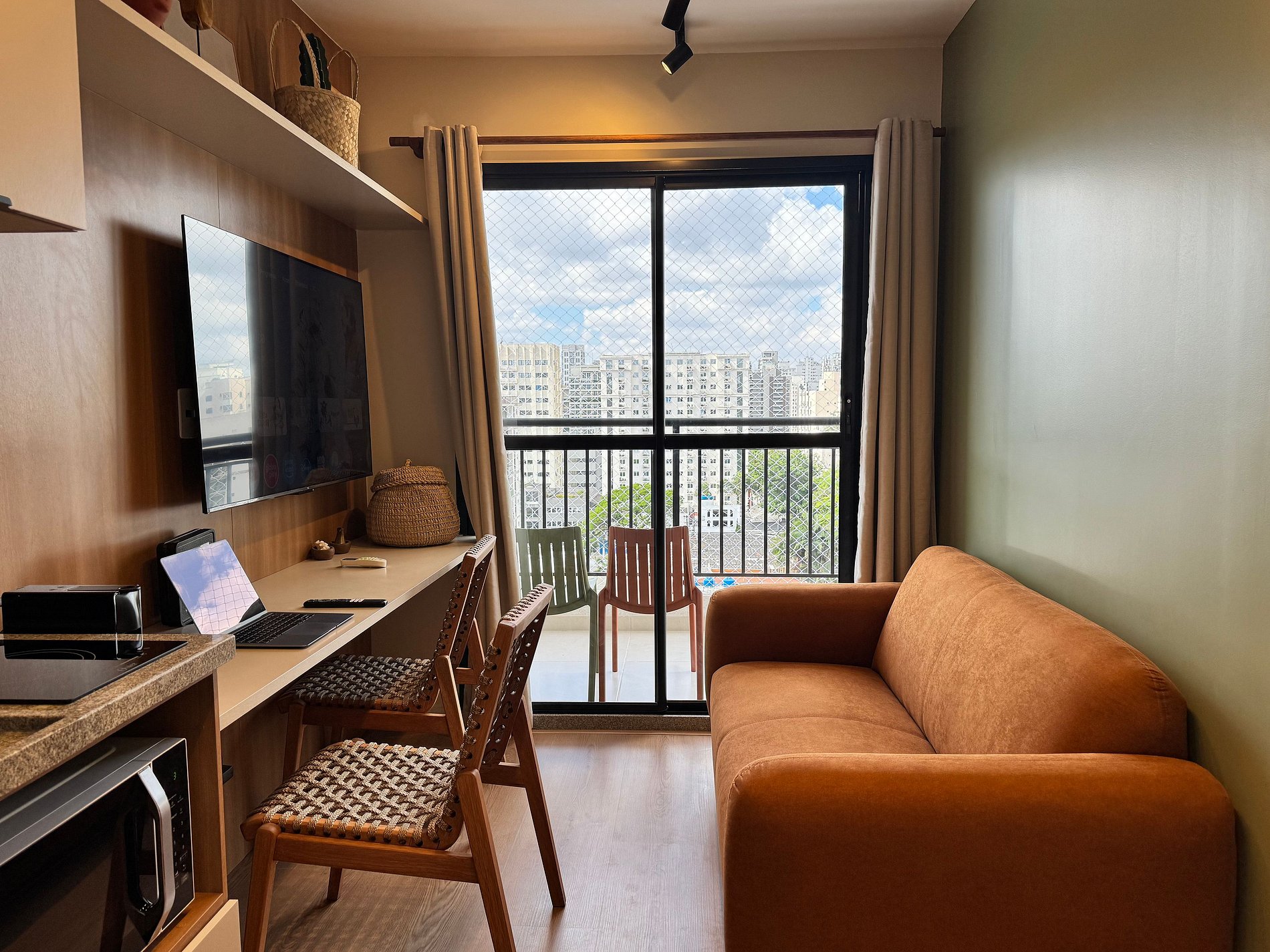 A cozinha completa inclui cooktop, micro-ondas, geladeira, cafeteira Nespresso, air fryer, além de utensílios e panelas para preparar desde um café rápido até refeições completas. A varanda mobiliada, com cadeiras e tela de proteção, convida a relaxar apreciando a vista da cidade.