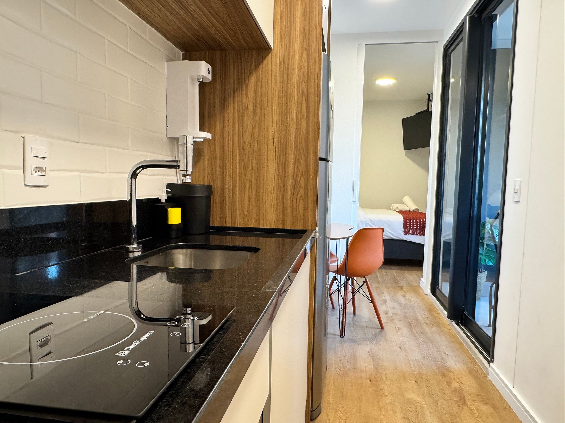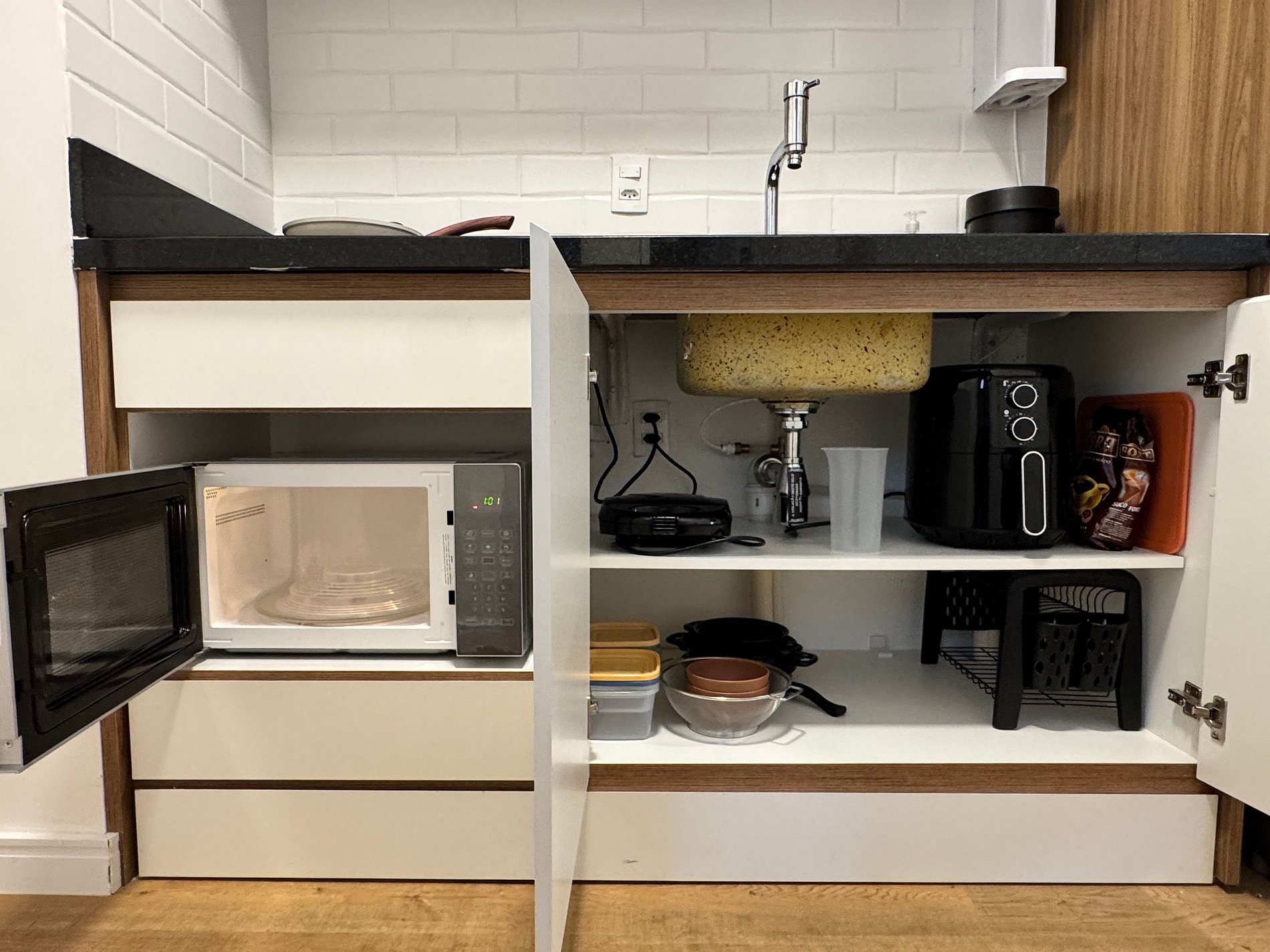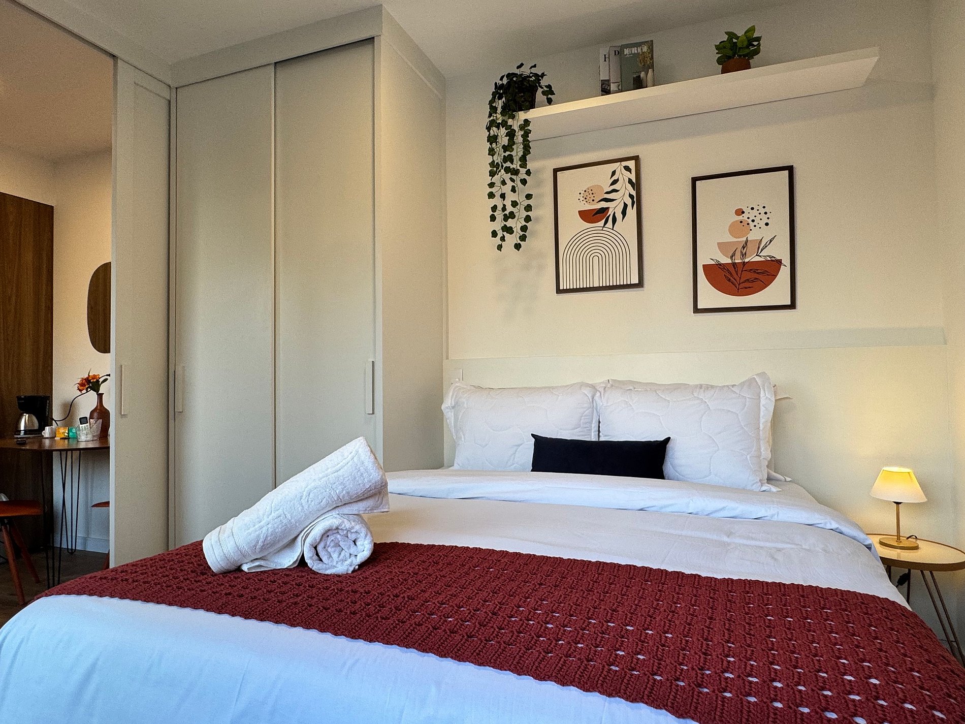 A atmosfera combina aconchego e funcionalidade, com ambientes integrados que aproveitam cada detalhe. A cozinha equipada permite preparar refeições rápidas, enquanto o espaço de descanso garante conforto após um dia intenso pela cidade. Tudo isso dentro de um condomínio que oferece piscina ao ar livre, academia e lavanderia compartilhada.