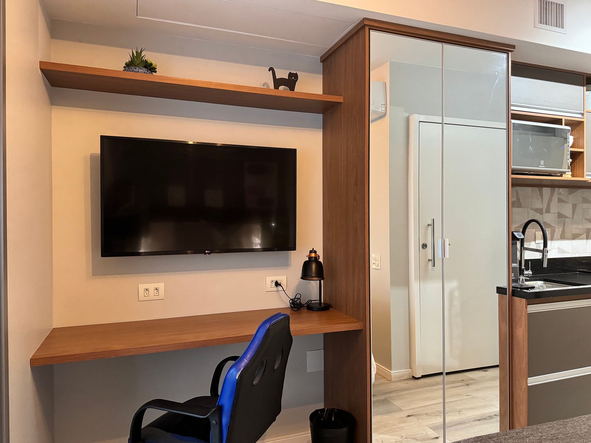 - [x] Frigobar 90 litros com freezer - [x] Air Fryer Electrolux Digital 3,2 litros - [x] Cooktop de indução 2 bocas - [x] Forno microondas Electrolux - [x] Sanduicheira elétrica - [x] Cafeteira Nespresso - [x] Purificador de água Electrolux 3 temperaturas natural/ fria/ gelada - [x] Armários de cozinha espaçosos e funcionais equipados com enxoval completo - [x] Ar Condicionado quente & frio - [x] Roupeiro 90 cm com portas espelhadas, maleiro, 2 gavetas e sapateira - [x] Bancada para trabalho com luminária, tomadas 127V e 1 tomada USB - [x] Prateleira para livros e pequenos objetos - [x] Cadeira giratória gamer - [x] Cama box - [x] Cabeceira confortável com spots para leitura, 1 tomada 127V e 1 USB - [x] Criados-mudos de apoio com gaveta e nicho - [x] LG Smart TV 40" com PrimeVideo - [x] Internet Vivo Fibra 700 MB - [x] Cortina blackout no dormitório - [x] Varanda fechada, envidraçada, com persiana rolô para maior privacidade - [x] Mesa e cadeiras dobráveis na varanda - [x] Armário de lavanderia na varanda, equipado com MOP, panos e produtos de limpeza - [x] Secador de cabelos - [x] Toalheiro duplo - [x] Espelhos - parede da pia e articulado 5X - [x] Ducha higiênica - [x] Suporte com sabonete líquido próximos ao vaso sanitário