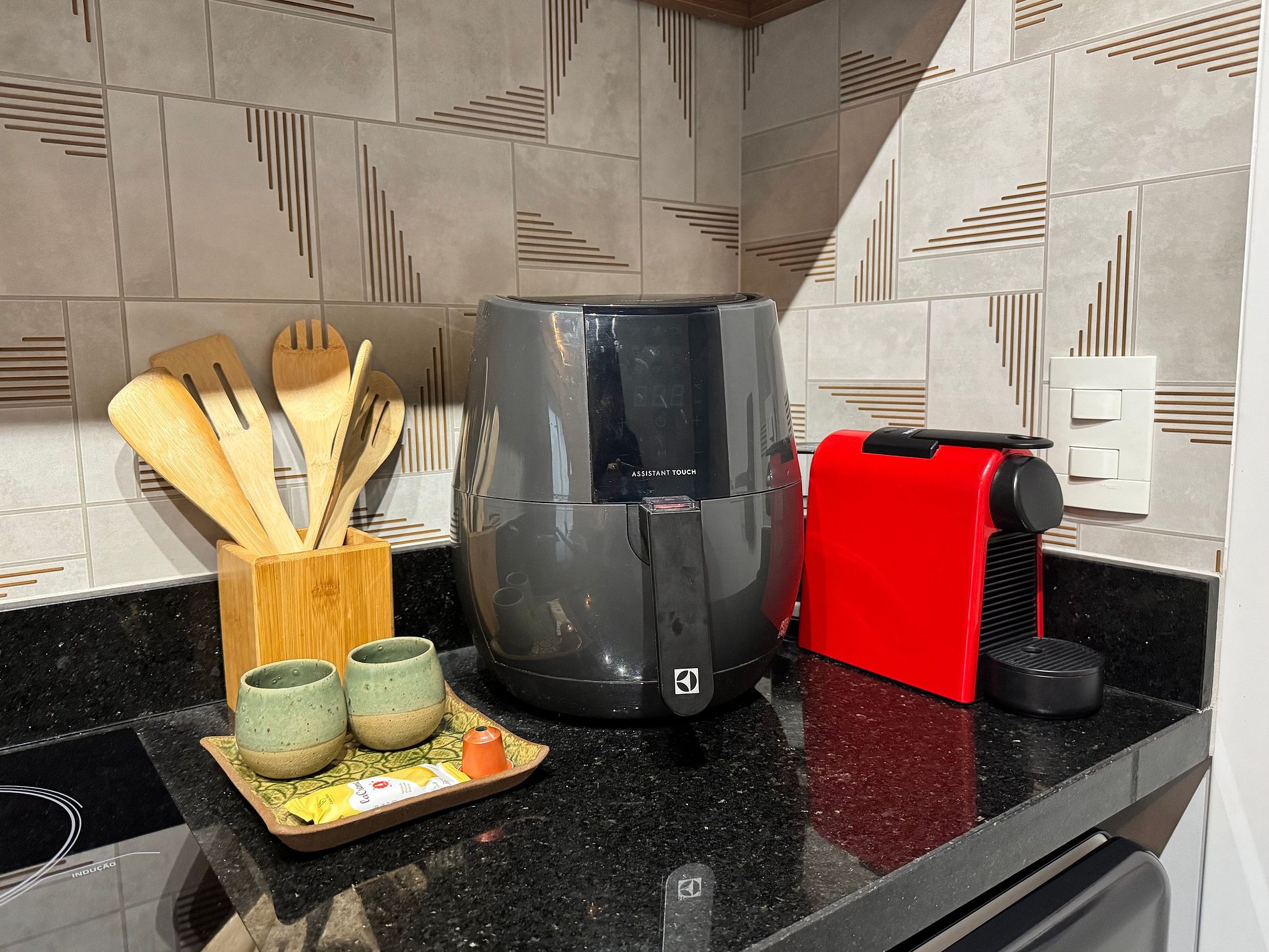 Prepare suas refeições com liberdade e estilo! Você terá à disposição cooktop por indução, micro-ondas, Air Fryer Electrolux, sanduicheira, frigobar com freezer, cafeteira Nespresso, purificador de água 3 temperaturas e armários organizados com todos os utensílios necessários.