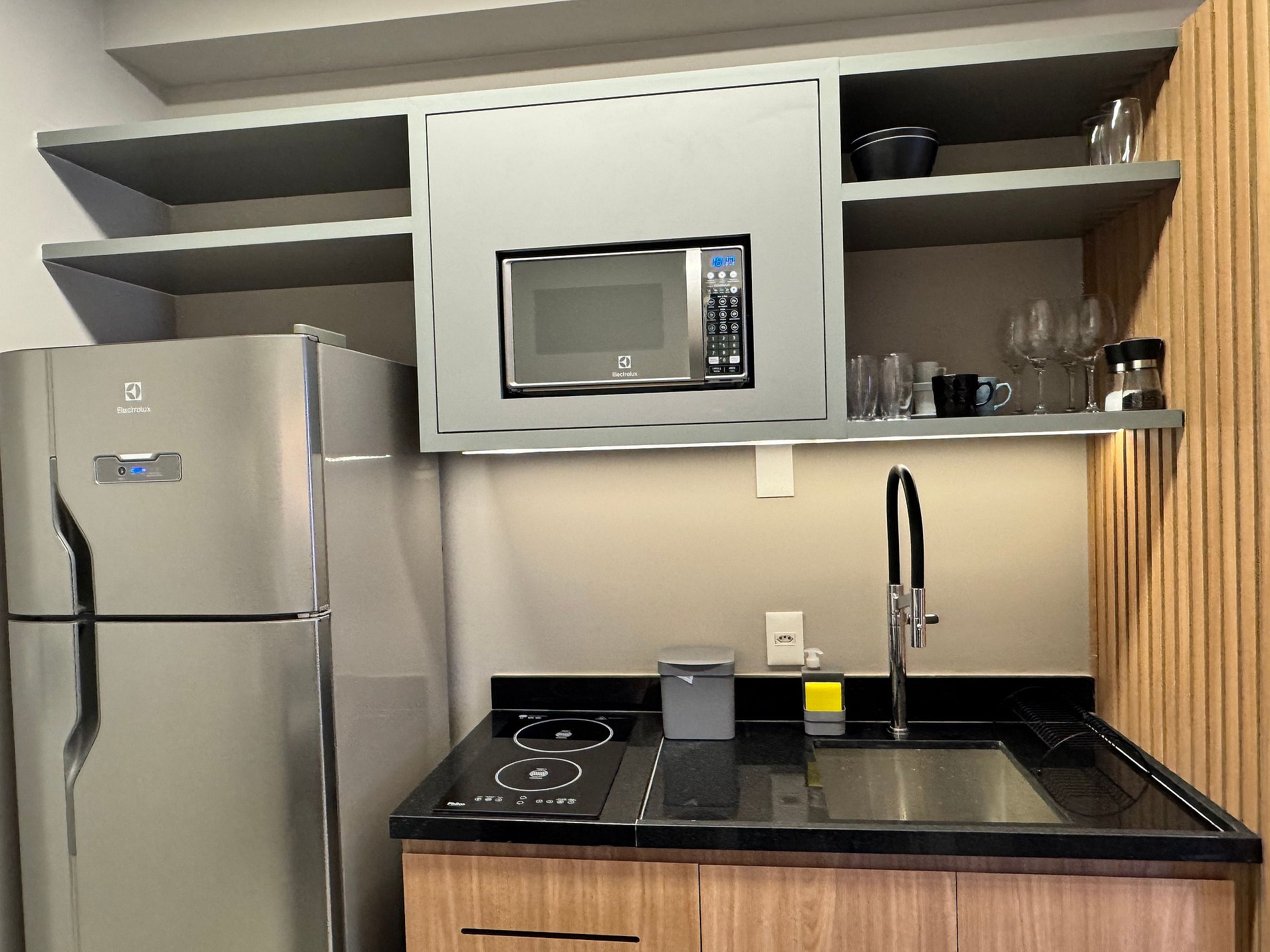 Disponibilizamos um saco plástico verde na gaveta da cozinha para o descarte de materiais recicáveis (papel, plástico, metal e vidro).