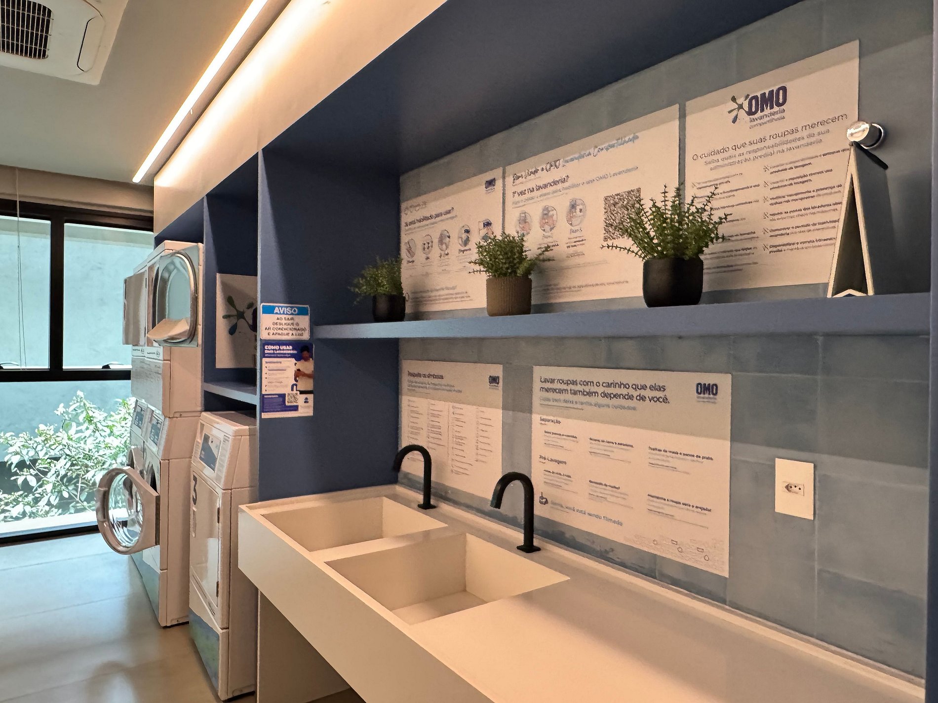 Tem ainda uma lavanderia que funciona mediante uso do app OMO, oferecendo praticidade com máquinas de última geração em um ambiente organizado e funcional.