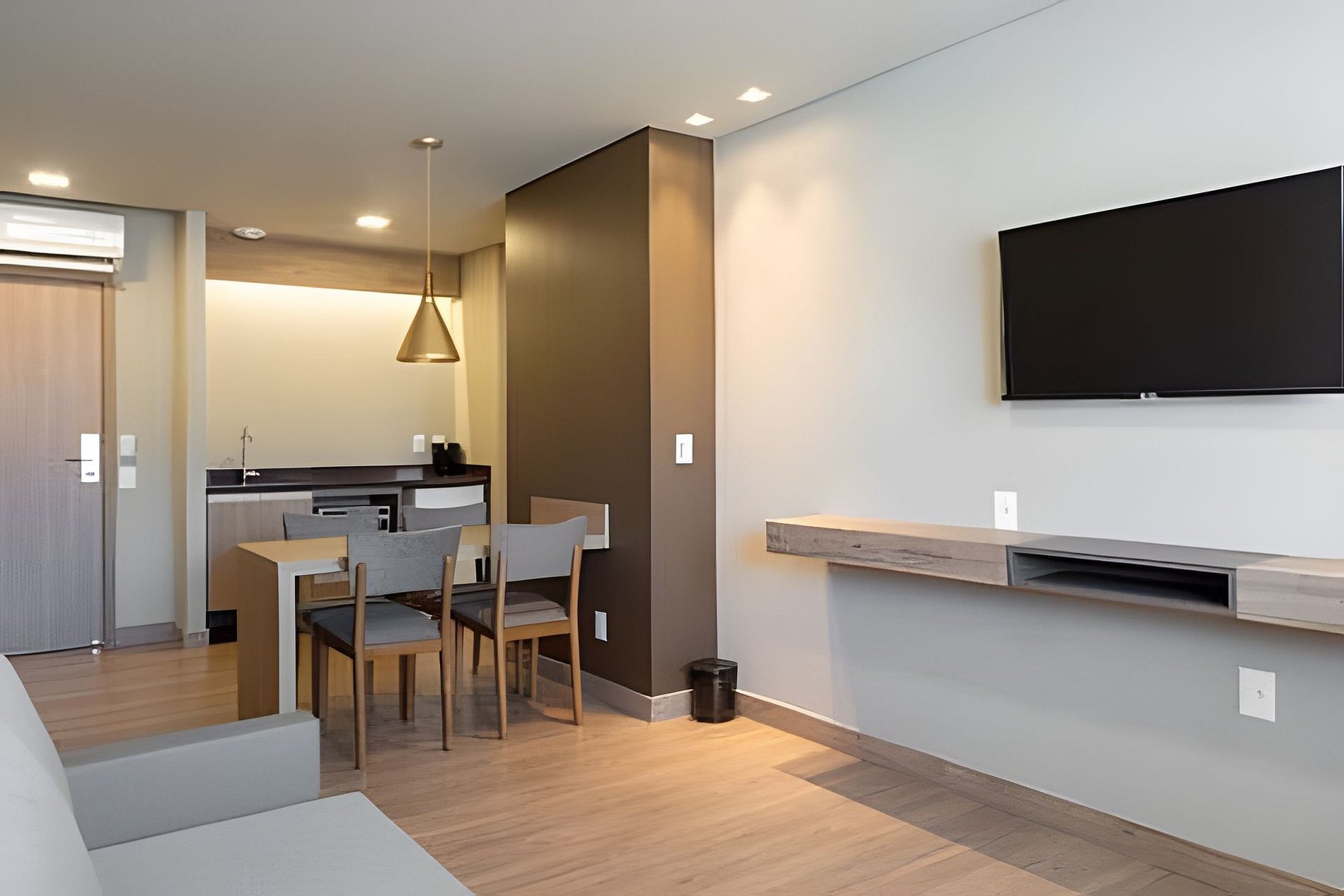 Área total do Ap 45 m2. Um único espaço com 2 quartos e 1 banheiro. Quarto 1 com sofá cama grande e confortável para 2 adultos, SmartTV 40" e Wi-Fi , AC frio/ quente, frigobar, pequena cozinha e mesa para refeições. Quarto 2 com uma cama casal King + 1 cama de solteiro + AC frio/ quente, roupeiro, maleiro, cofre, SmartTV 40" e Wi-Fi.