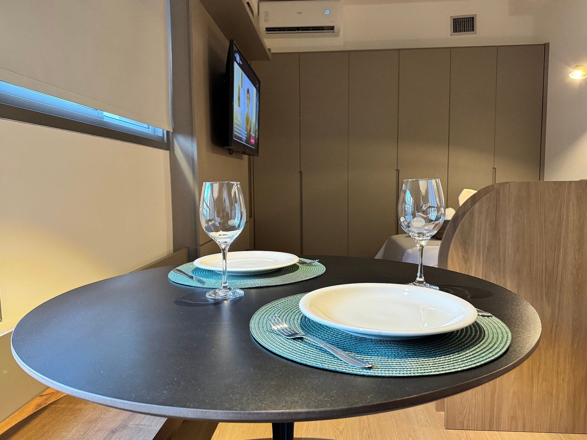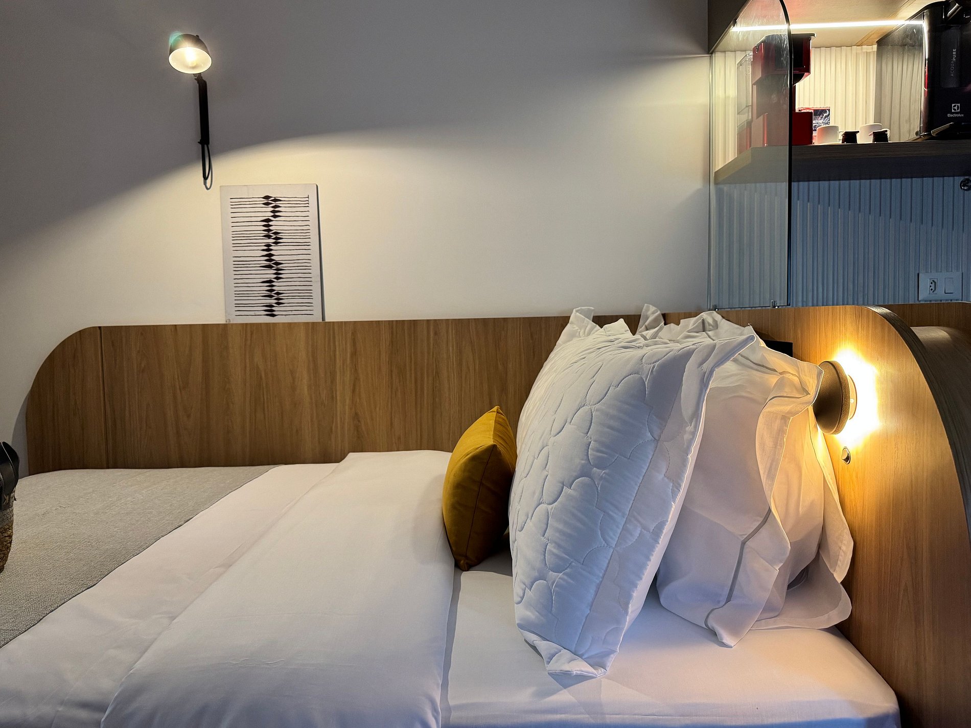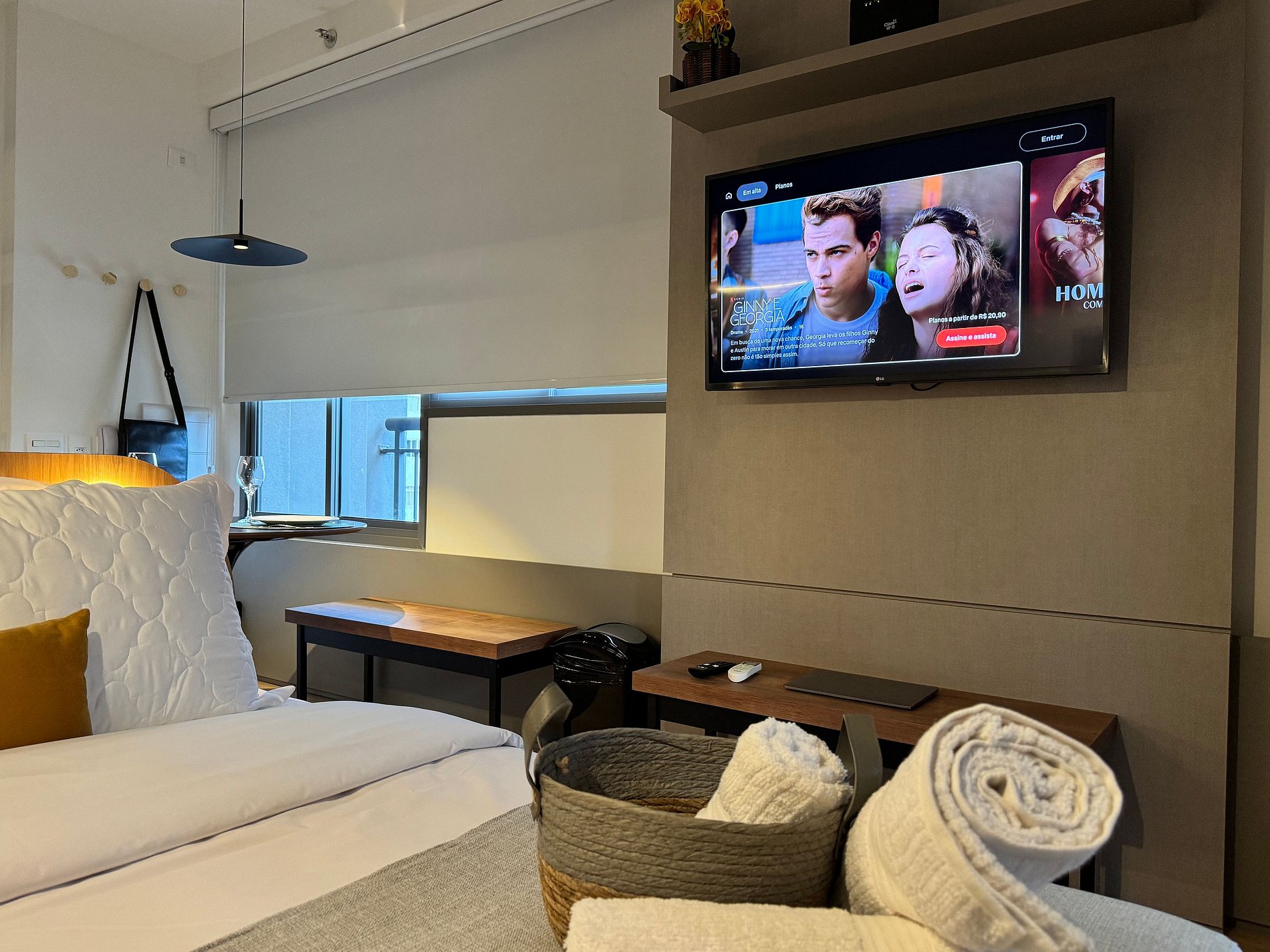 O studio destaca-se pelo design moderno, marcenaria planejada, banheiro espaçoso e equipamentos de alta qualidade. Há uma mesa para trabalho ou refeições, Smart TV, Wi-Fi rápido, cama confortável e enxoval premium. Iluminação indireta e cozinha completa garantem um ambiente prático e acolhedor, perfeito para relaxar, trabalhar ou curtir a cidade.