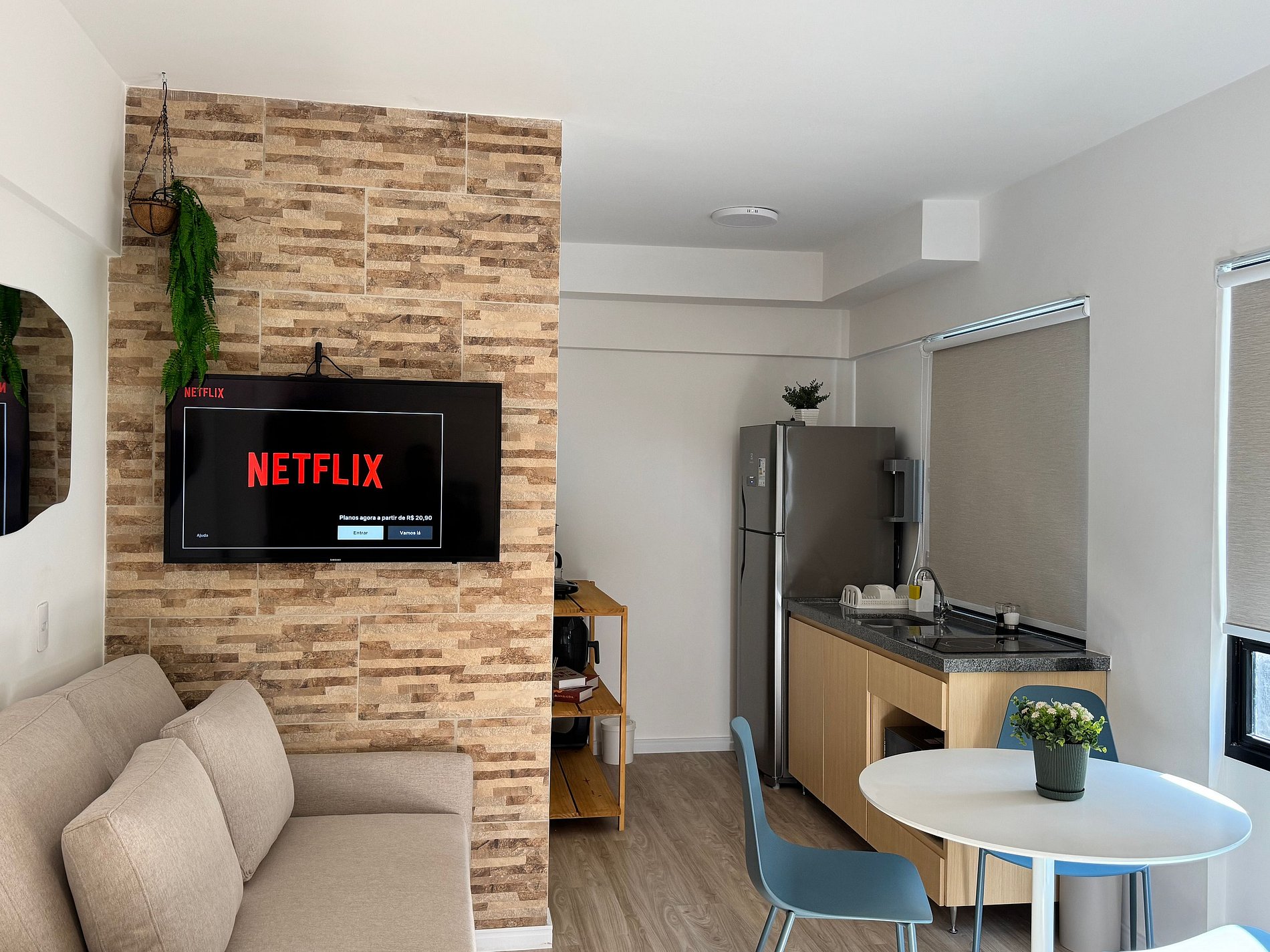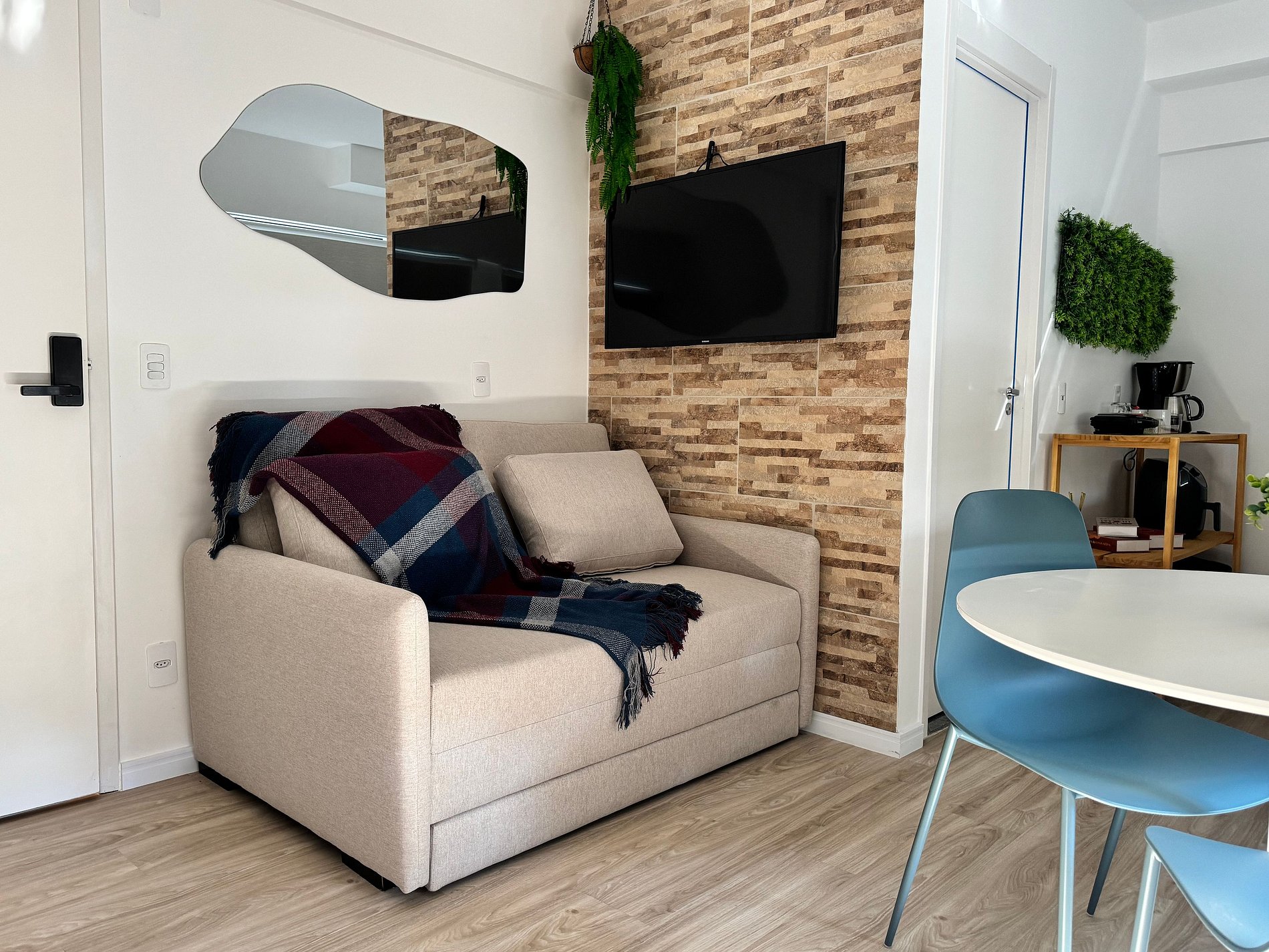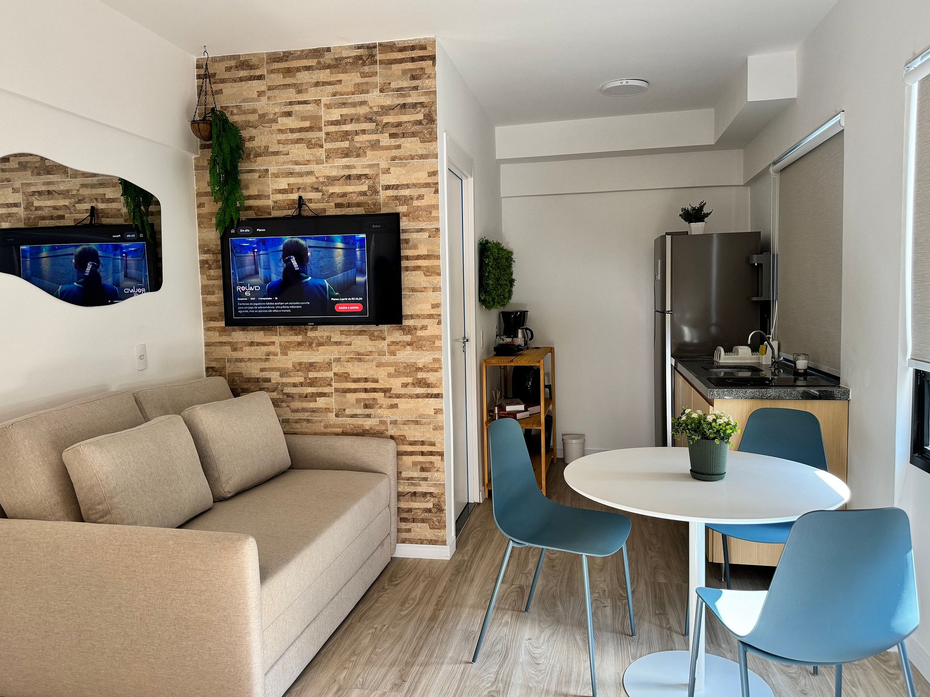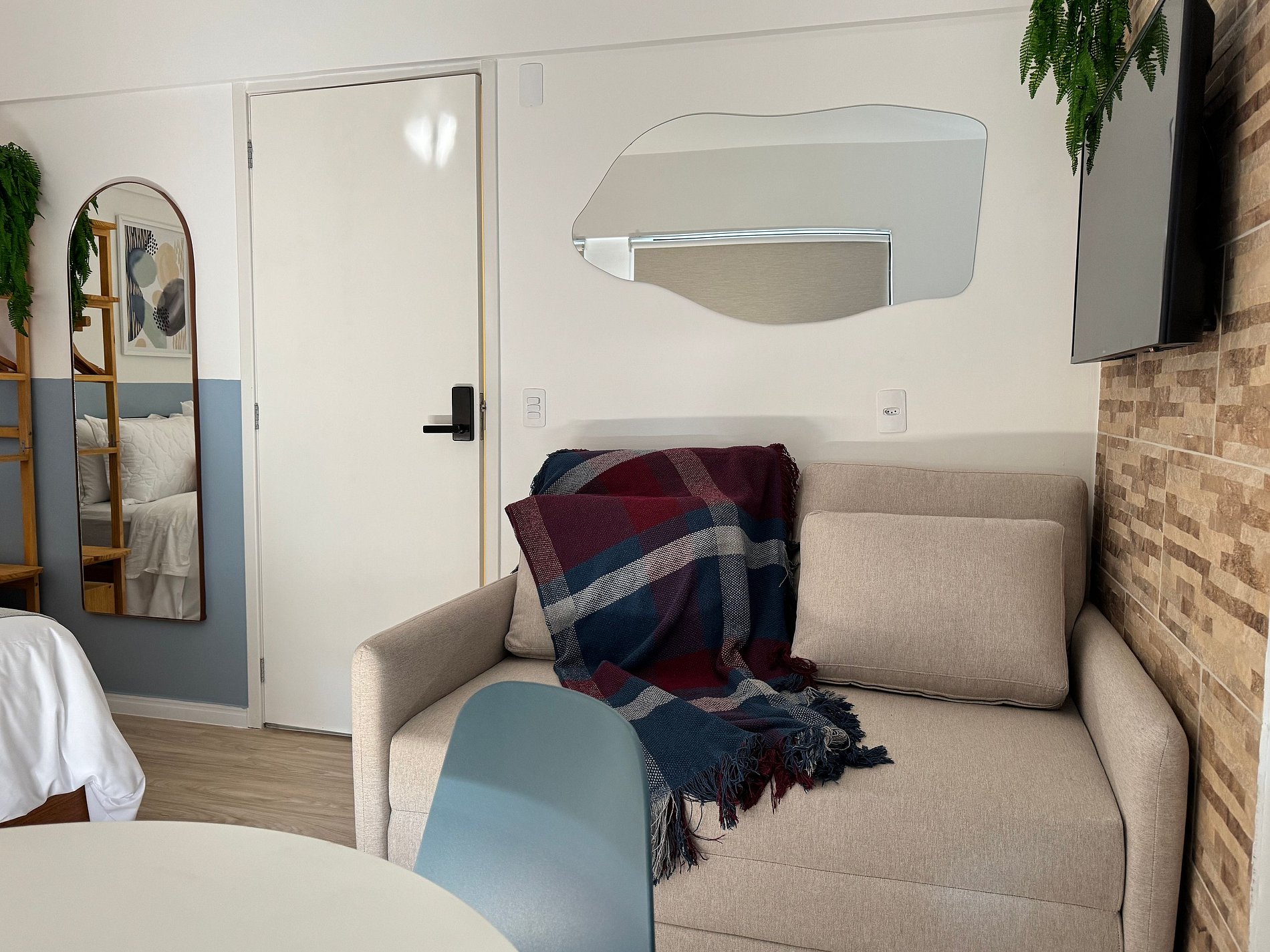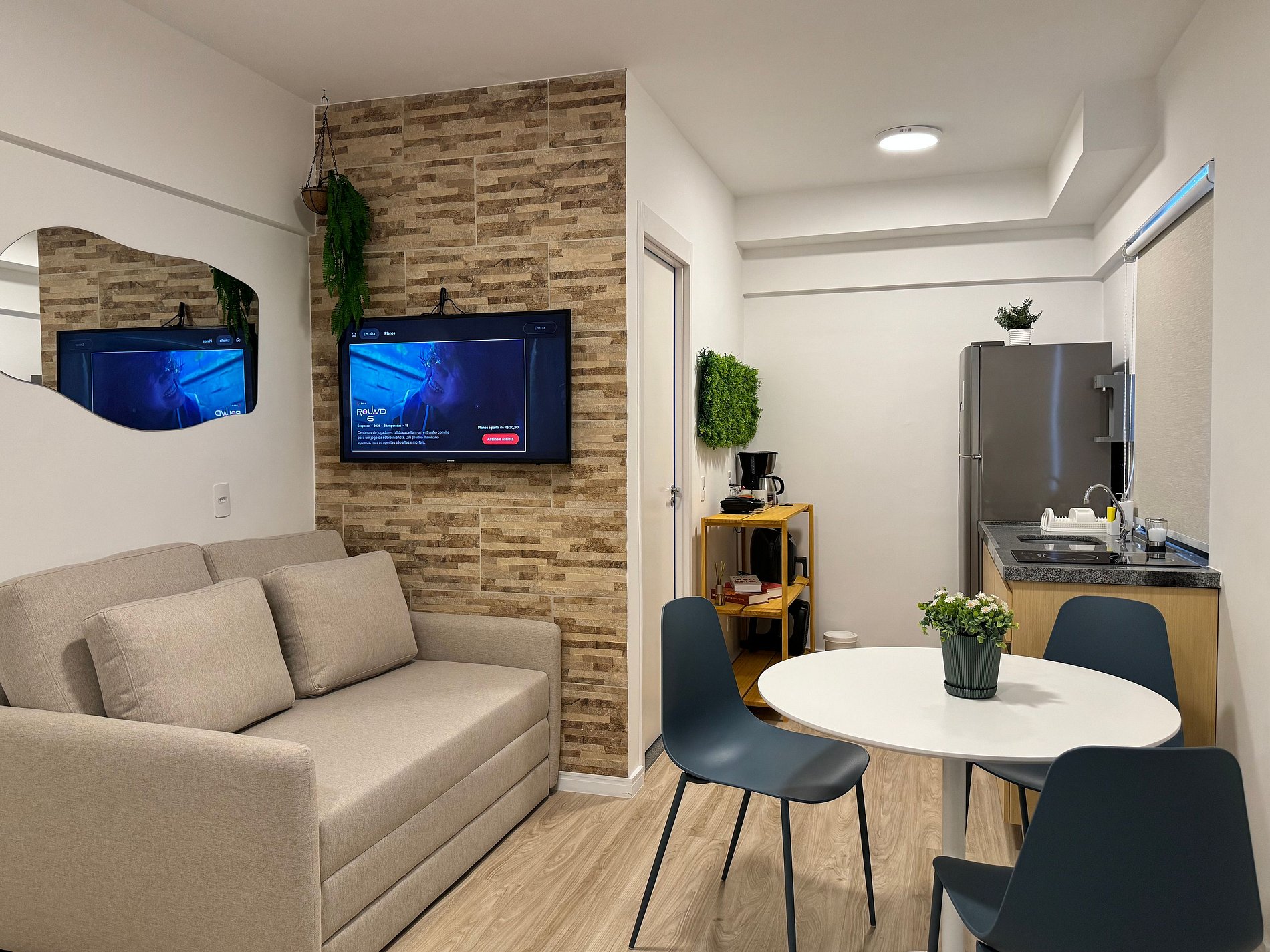 O Studio 33 combina design moderno, conforto e praticidade. Conta com cama casal aconchegante, sofá-cama, Smart TV, Wi-Fi veloz e mesa de trabalho. A cozinha é completa, com cooktop de indução, geladeira, micro-ondas, cafeteira e air fryer. O banheiro elegante tem ducha quente e secador. Iluminação agradável, decoração clean e self check-in por fechadura eletrônica garantem uma estadia impecável.