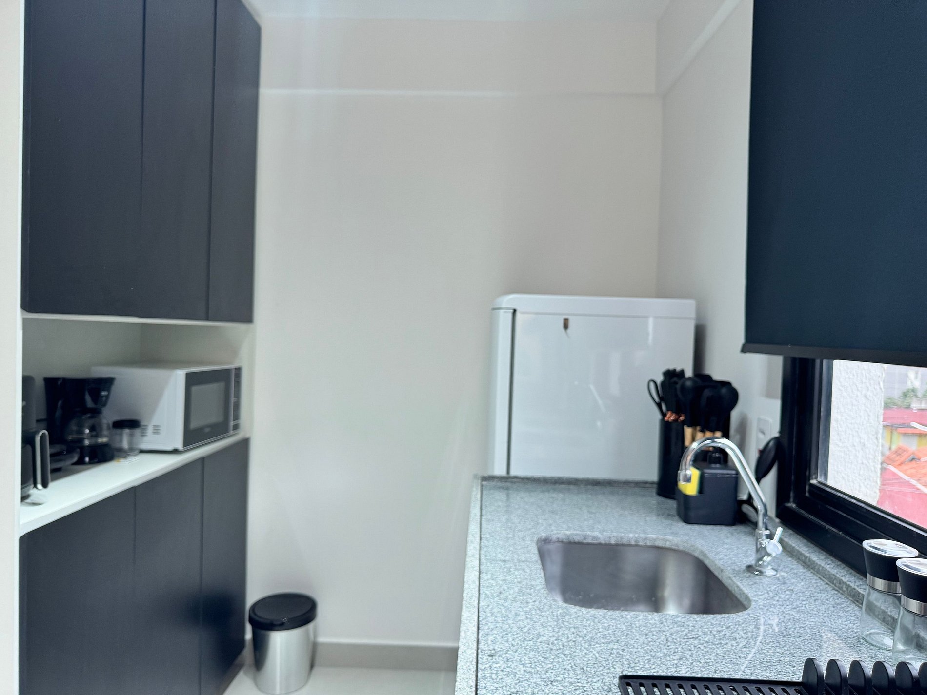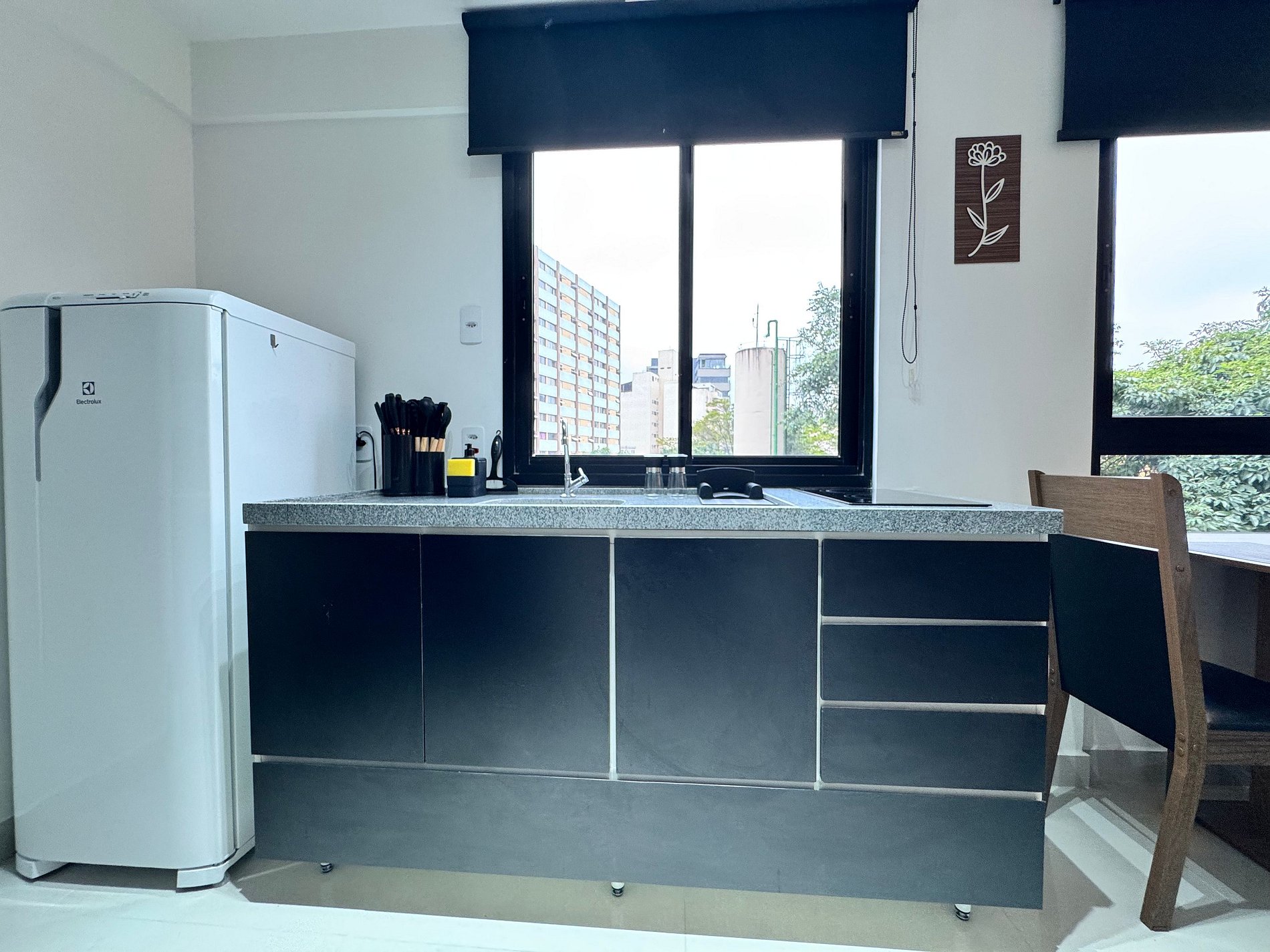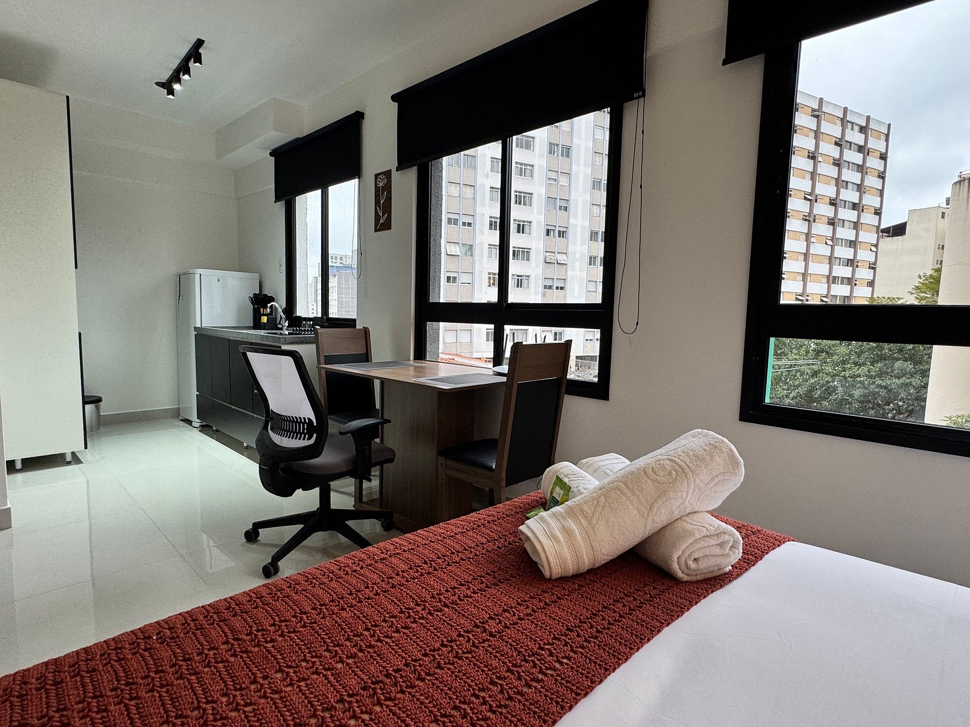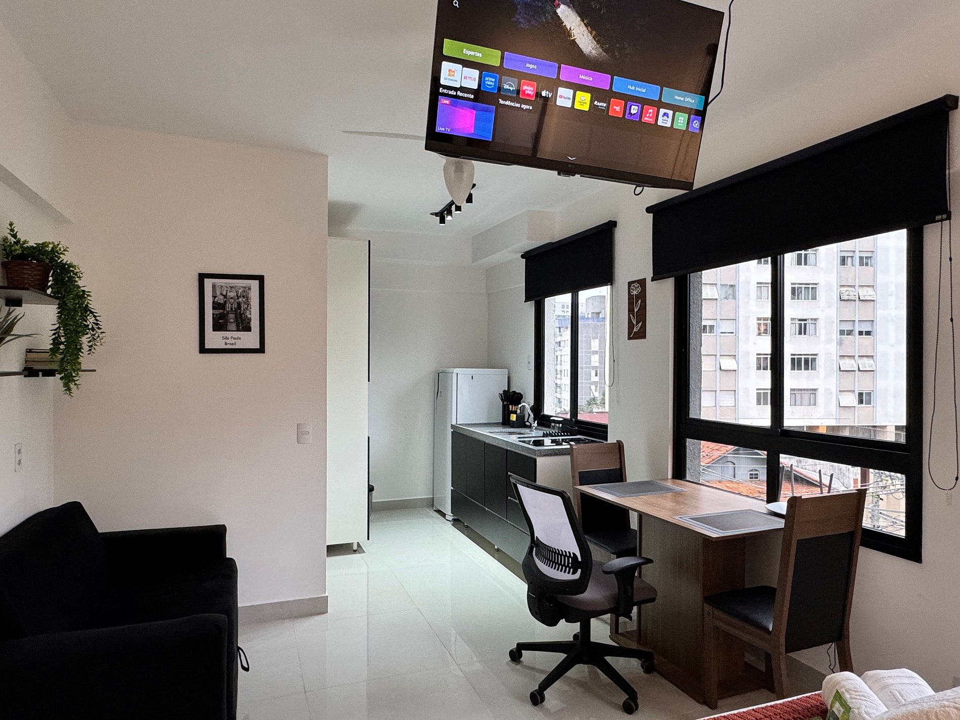 O Studio 43 combina design contemporâneo e funcionalidade. Conta com cama casal, sofá-cama, Smart TV, Wi-Fi veloz e área de trabalho. A cozinha vem equipada com cooktop, geladeira, micro-ondas, cafeteira e air fryer. O banheiro tem um excelente chuveiro do tipo ducha e secador de cabelos. Self check-in por fechadura eletrônica garante conforto e praticidade.