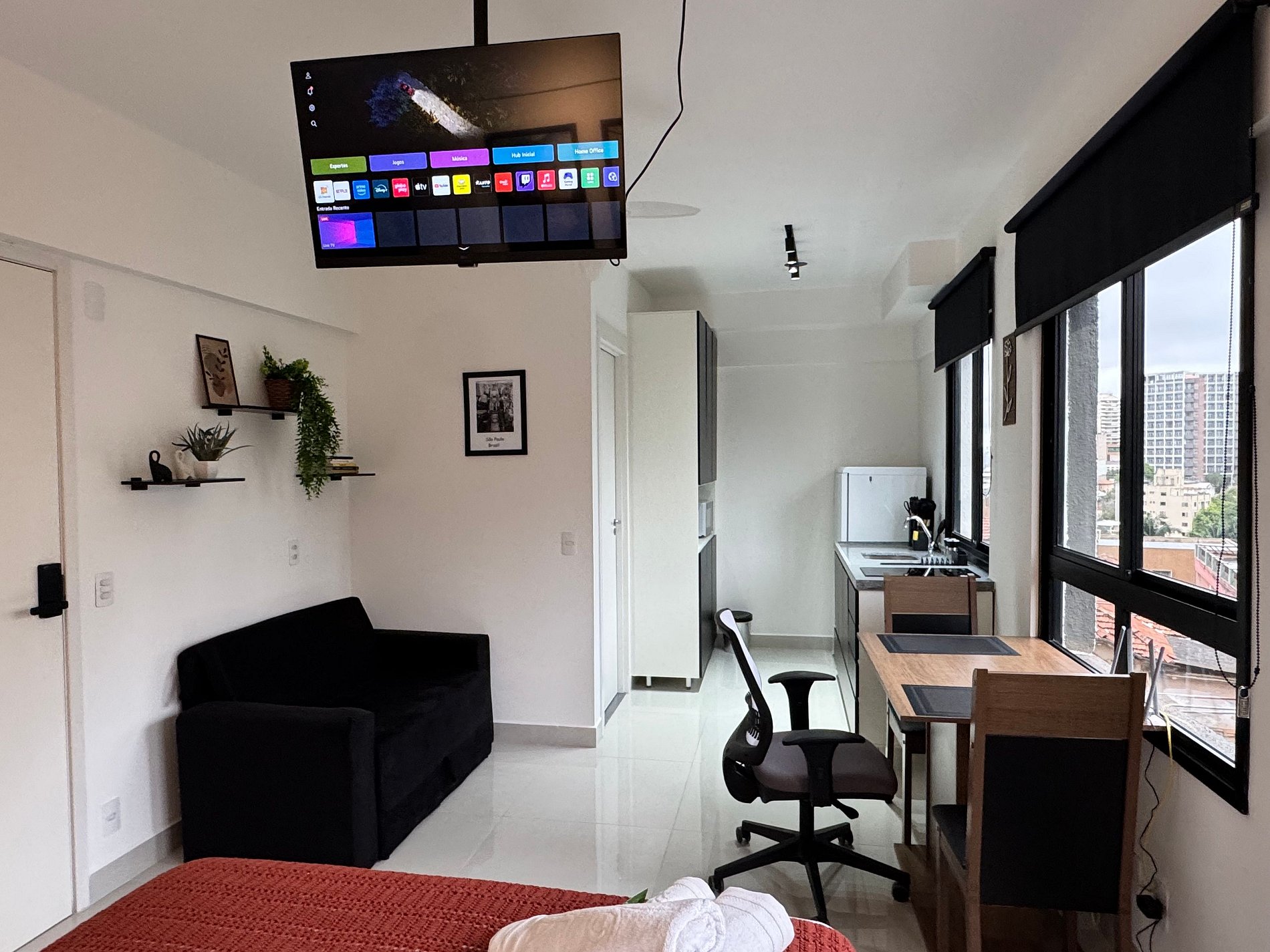 Os hóspedes têm acesso exclusivo ao Studio 43 e podem usufruir de todas as áreas comuns do Nurban Vila Mariana: rooftop com piscina, hidro e sauna, pub com games, coworking, academia, lavanderia por app, espaço gourmet e bicicletário. Tudo isso conforme disponibilidade e regras do condomínio. O self check-in é simples e prático, com instruções enviadas após a reserva.